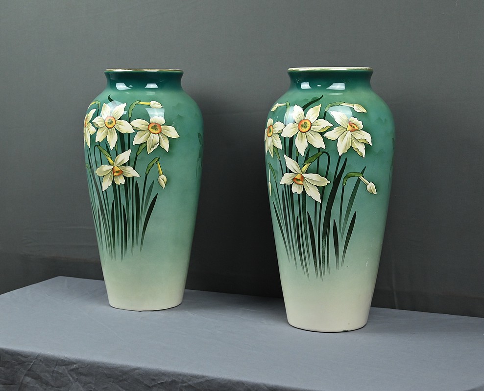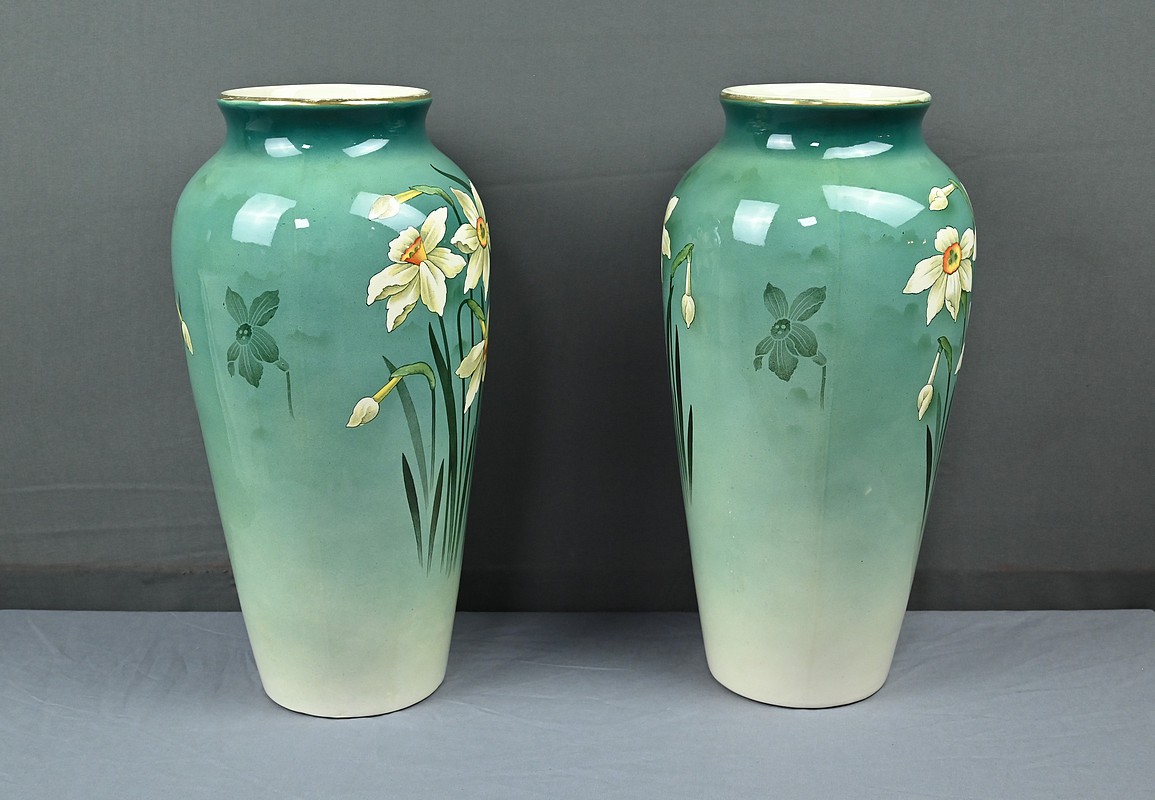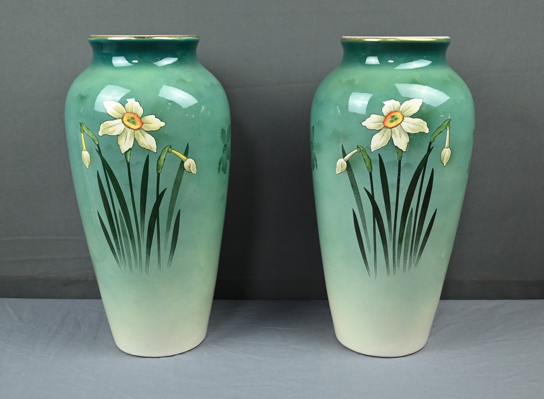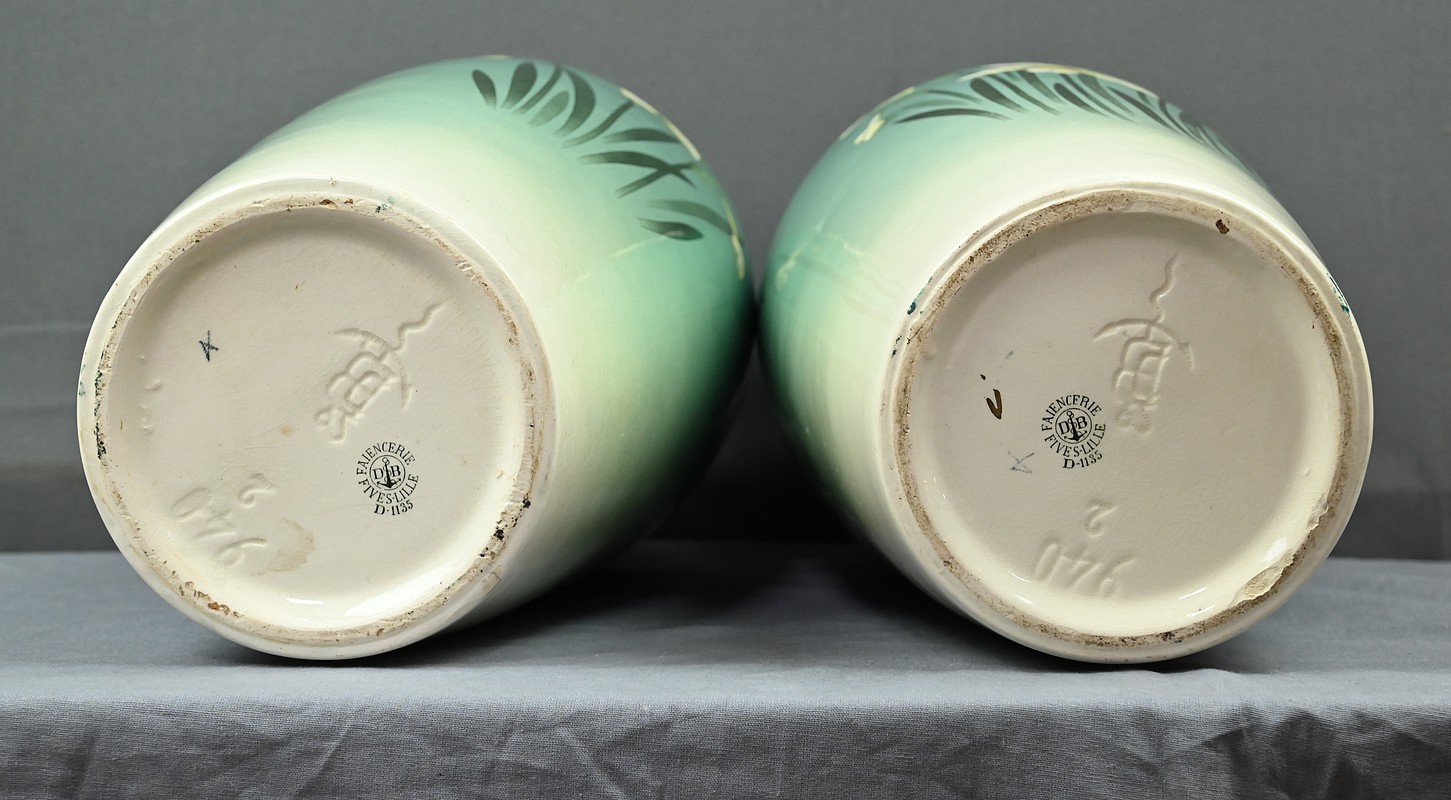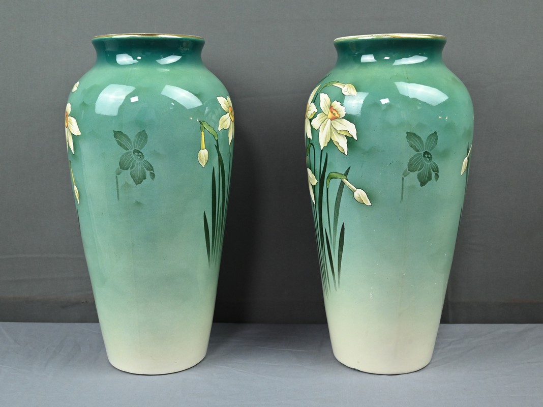 Chaque vase présente une silhouette élancée et harmonieuse, avec une base légèrement évasée qui s’affine vers le col, mettant en valeur le décor. Sur le fond dégradé allant du vert émeraude au blanc ivoire, se détache un motif de jonquilles aux pétales clairs et au cœurs jaunes orangés, accompagnés de longues tiges et feuilles vertes. Le style est naturaliste, typique de l’Art Nouveau, avec une attention particulière portée aux détails botaniques. Ce décor est peint sous l’émail donnant aux couleurs leur éclat et leur profondeur. La faïence utilisée est fine et parfaitement cuite, témoignant de la qualité des productions de Fives-Lille.