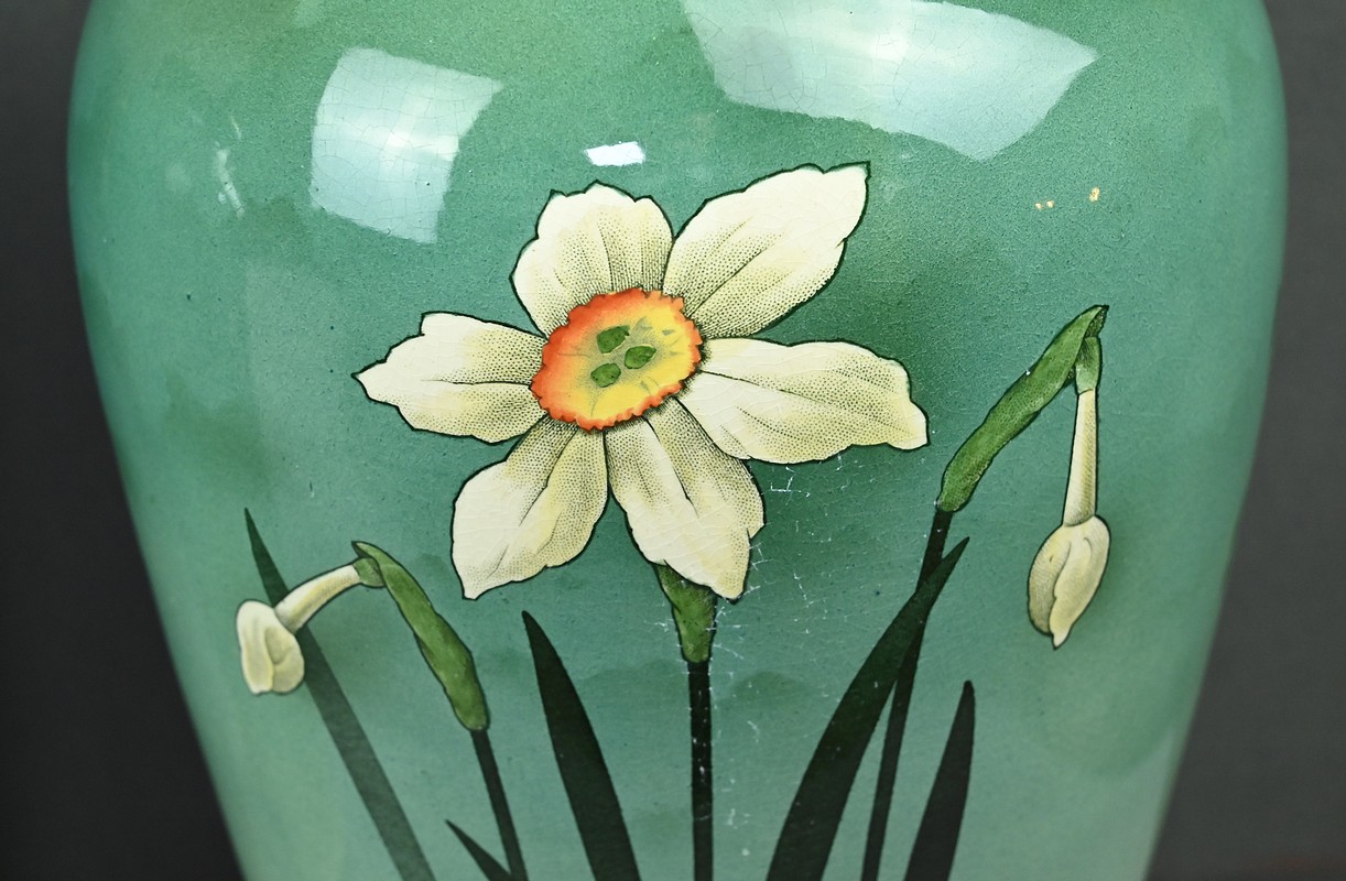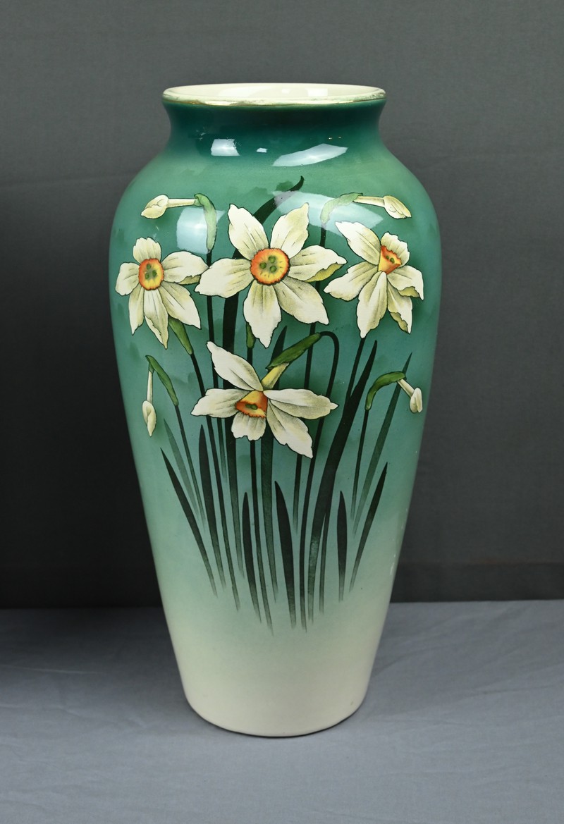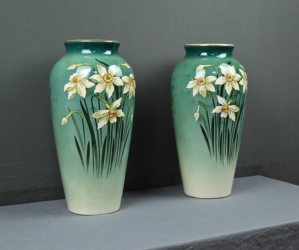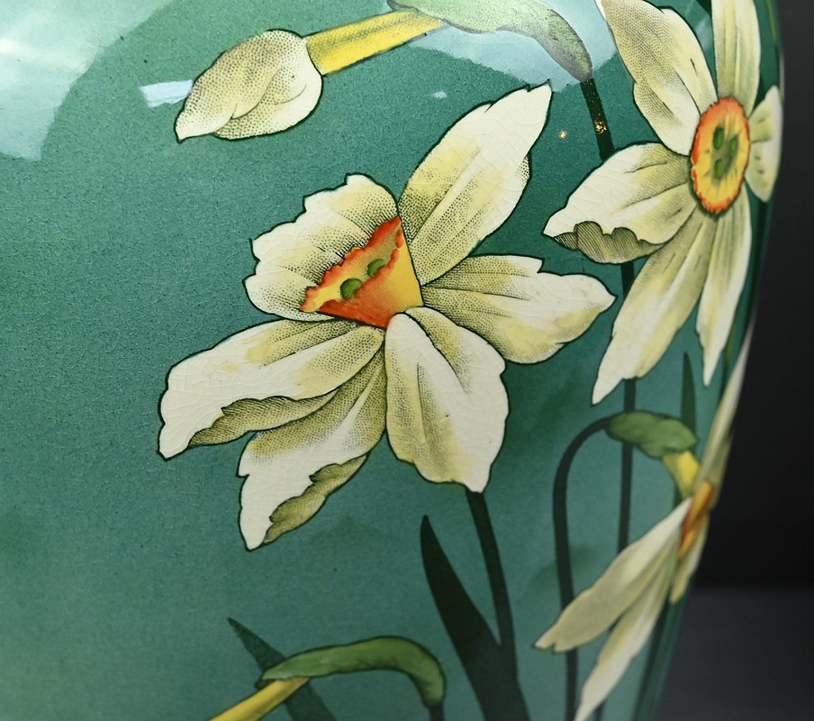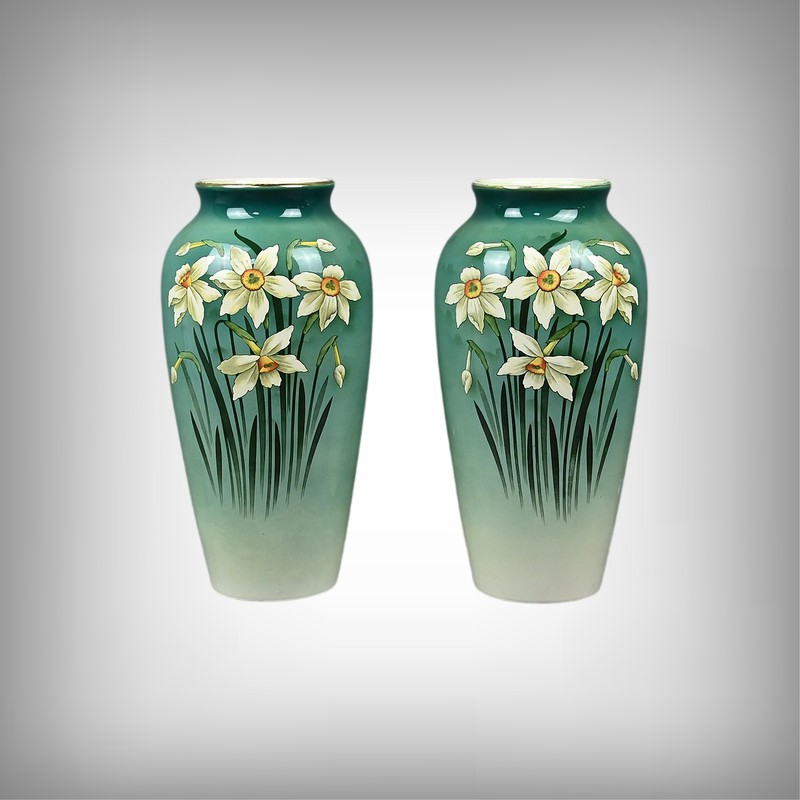 Chaque vase présente une silhouette élancée et harmonieuse, avec une base légèrement évasée qui s’affine vers le col, mettant en valeur le décor. Sur le fond dégradé allant du vert émeraude au blanc ivoire, se détache un motif de jonquilles aux pétales clairs et au cœurs jaunes orangés, accompagnés de longues tiges et feuilles vertes. Le style est naturaliste, typique de l’Art Nouveau, avec une attention particulière portée aux détails botaniques. Ce décor est peint sous l’émail donnant aux couleurs leur éclat et leur profondeur. La faïence utilisée est fine et parfaitement cuite, témoignant de la qualité des productions de Fives-Lille.