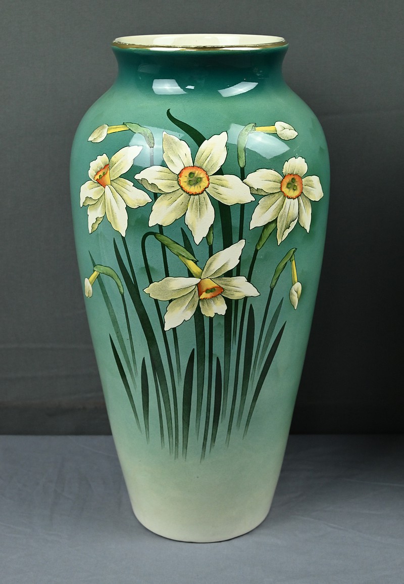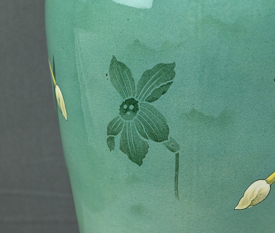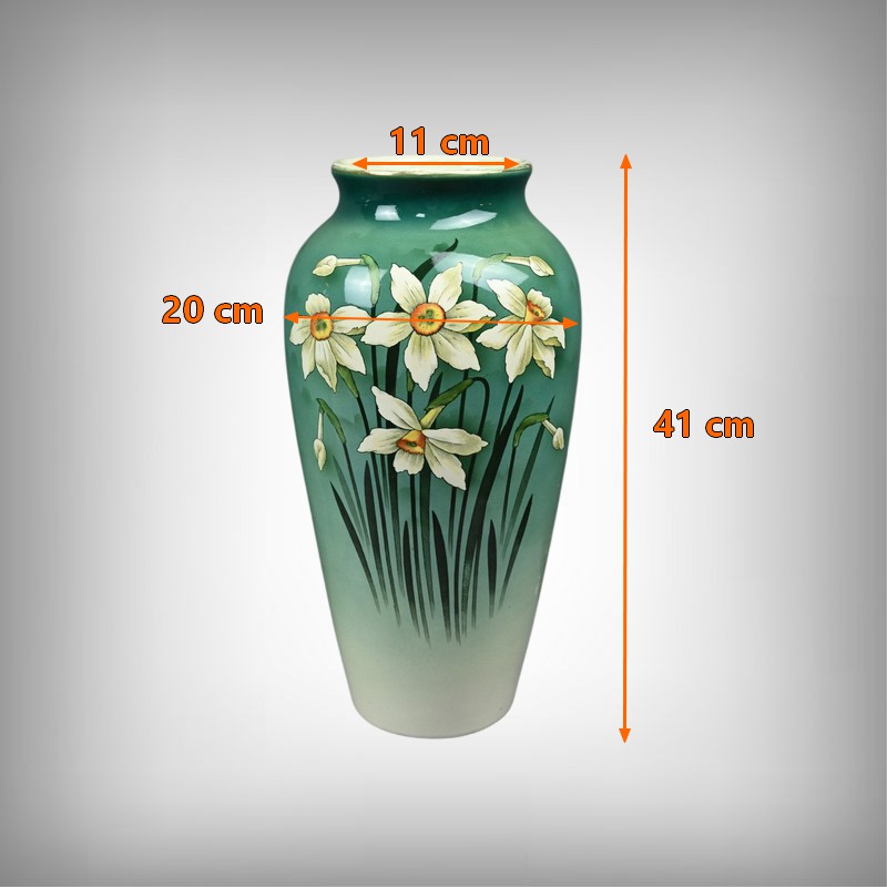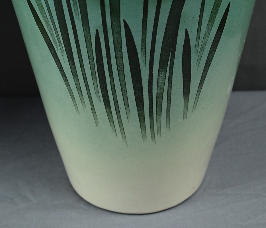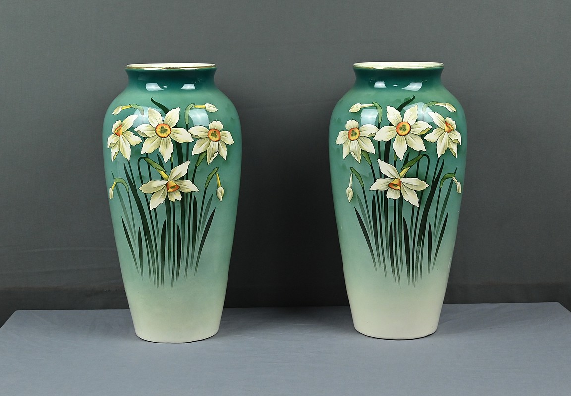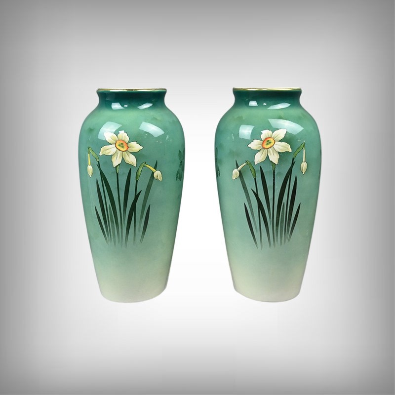 Chaque vase présente une silhouette élancée et harmonieuse, avec une base légèrement évasée qui s’affine vers le col, mettant en valeur le décor. Sur le fond dégradé allant du vert émeraude au blanc ivoire, se détache un motif de jonquilles aux pétales clairs et au cœurs jaunes orangés, accompagnés de longues tiges et feuilles vertes. Le style est naturaliste, typique de l’Art Nouveau, avec une attention particulière portée aux détails botaniques. Ce décor est peint sous l’émail donnant aux couleurs leur éclat et leur profondeur. La faïence utilisée est fine et parfaitement cuite, témoignant de la qualité des productions de Fives-Lille.