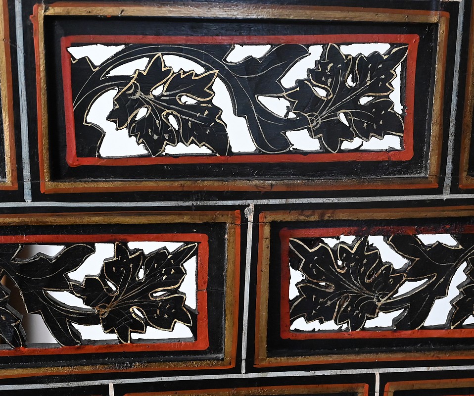 Ce paravent quatre feuilles est composé de multiples panneaux de différentes tailles, sculptés et peints, entourés de filets blancs, rouges et dorés.