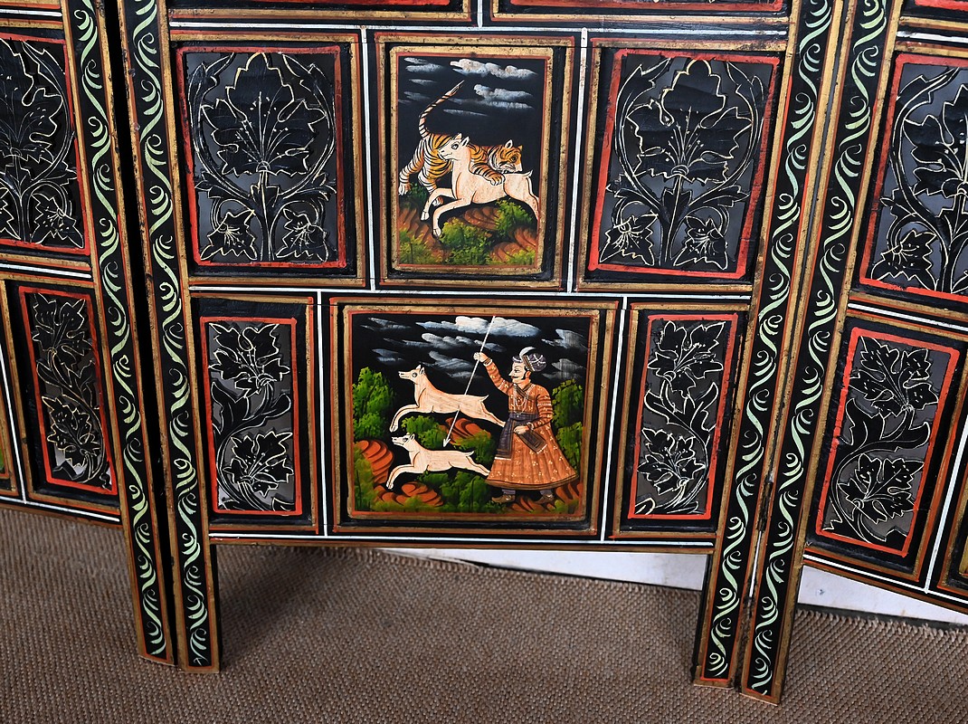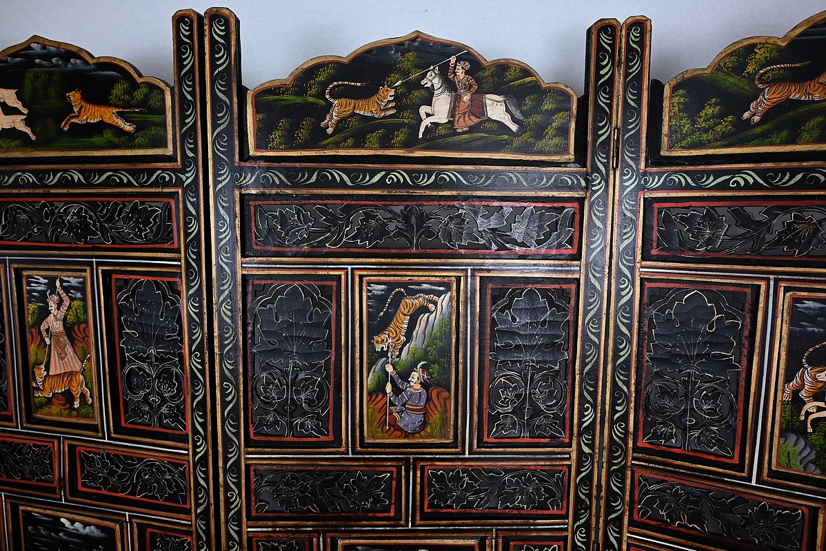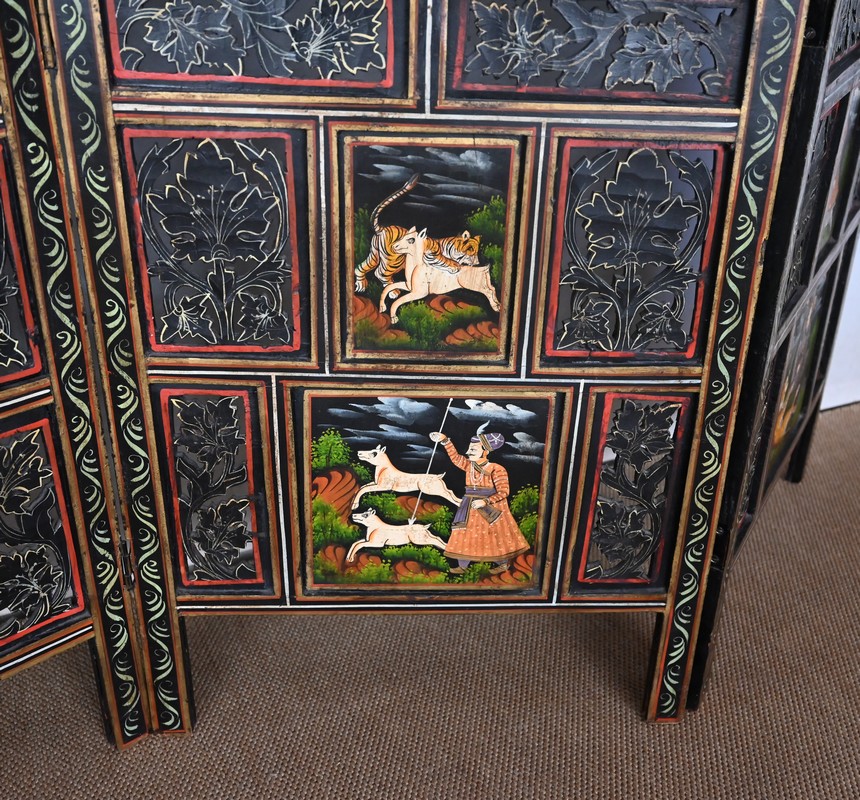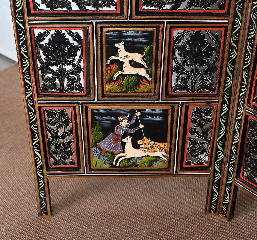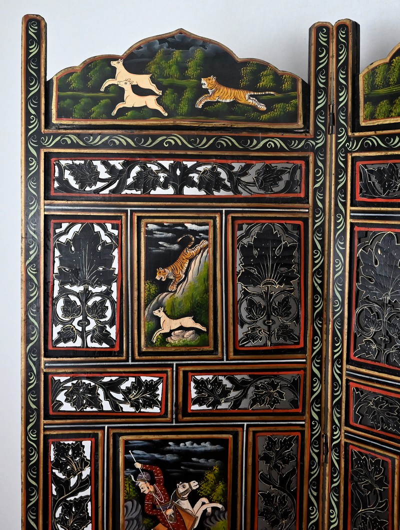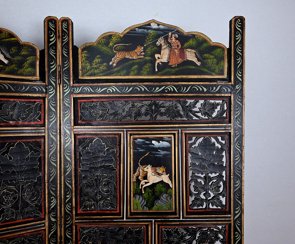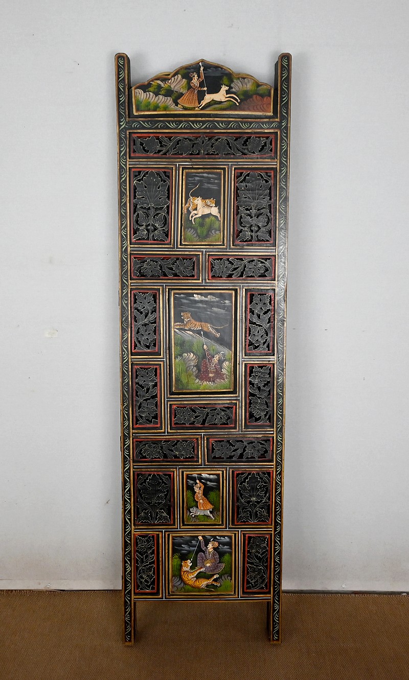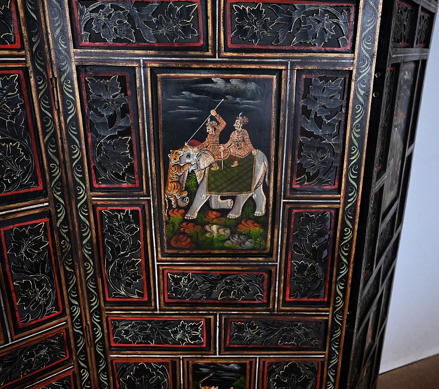 Grand paravent double-face en bois peint, réalisé par des maîtres artisans indiens du Rajasthan, au début du XXème siècle.
