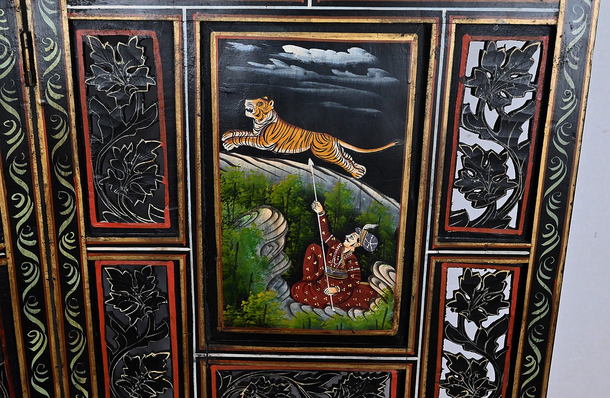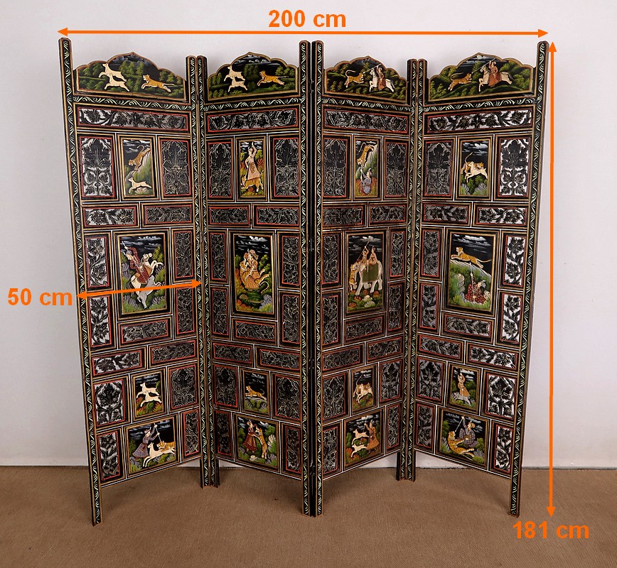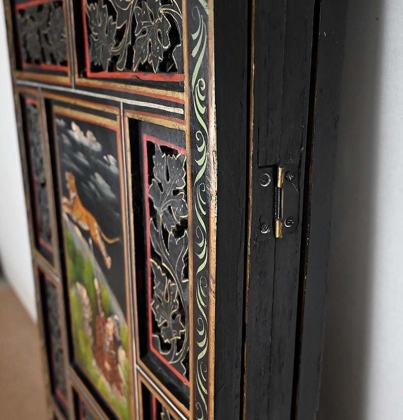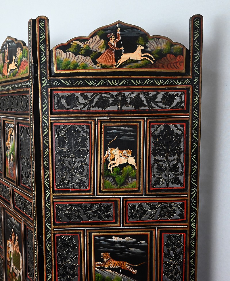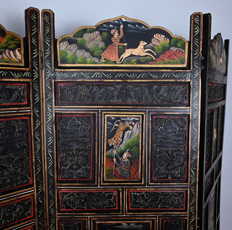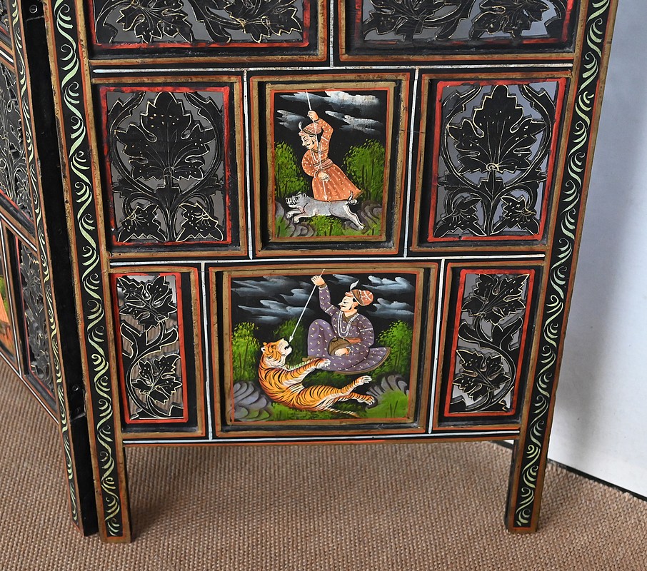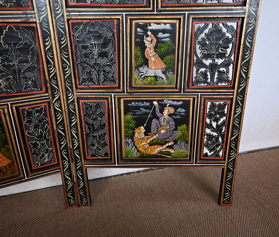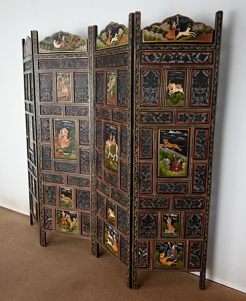 Grand paravent double-face en bois peint, réalisé par des maîtres artisans indiens du Rajasthan, au début du XXème siècle.