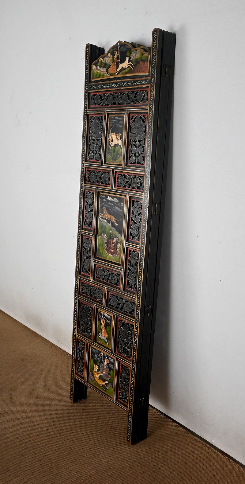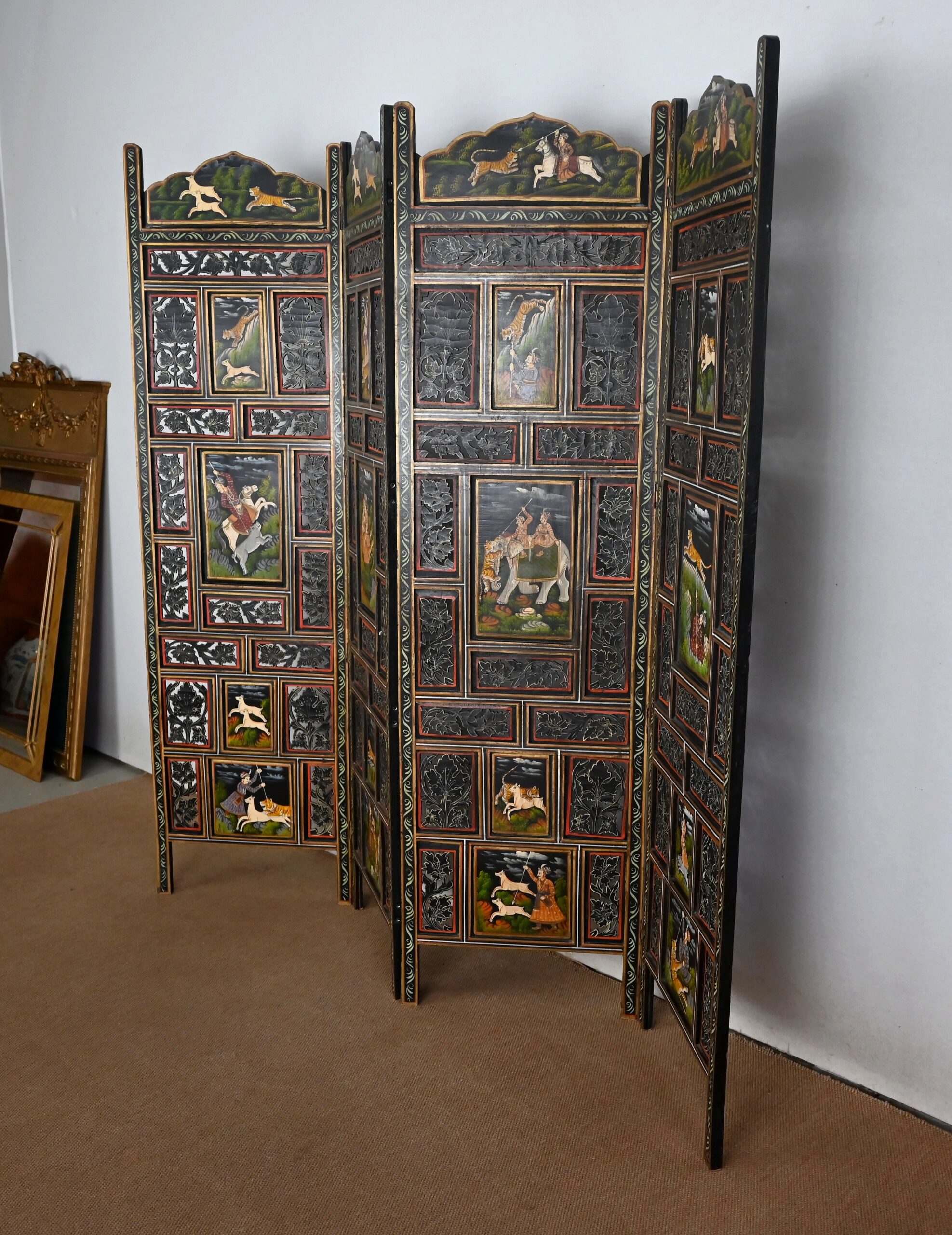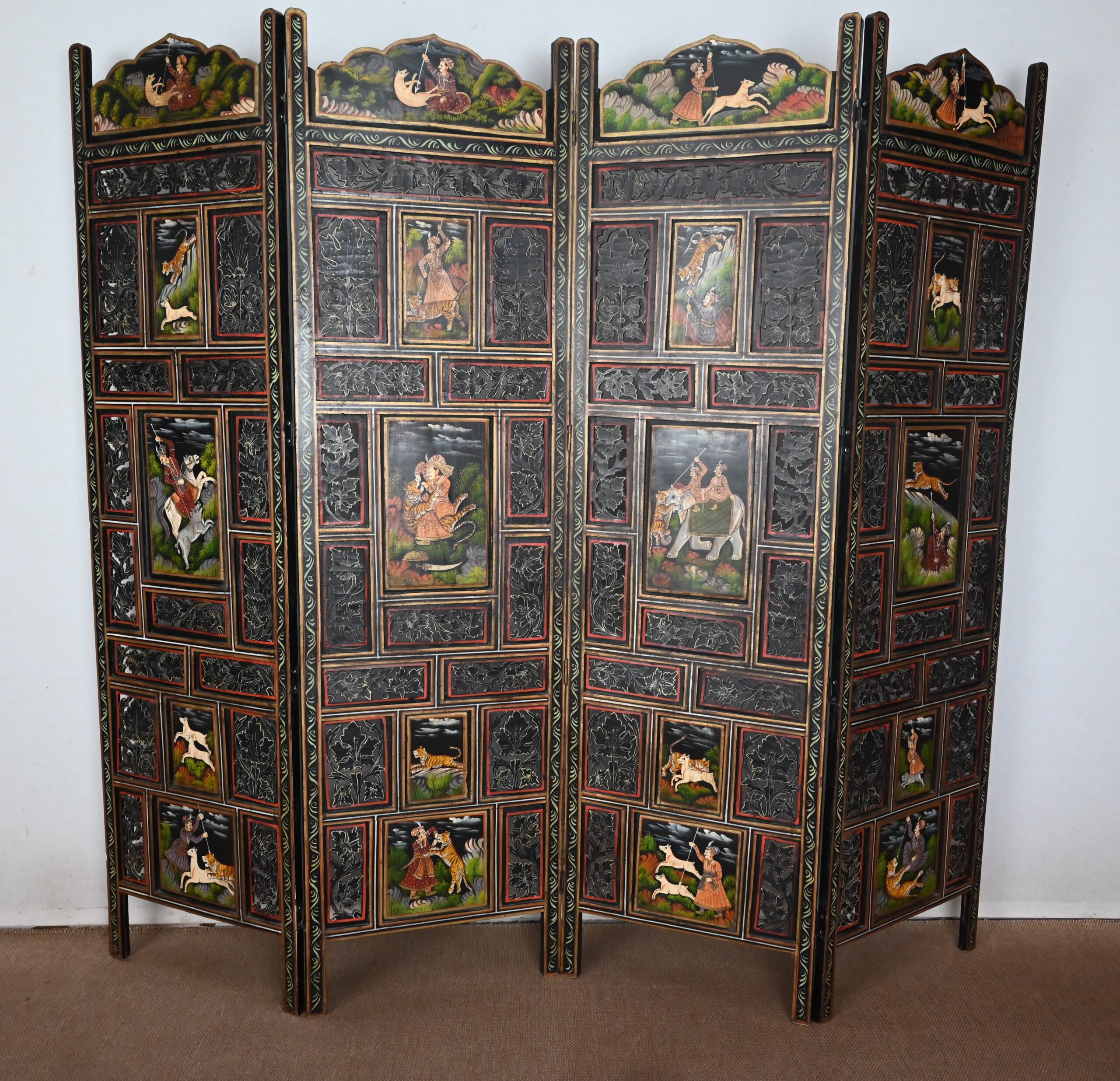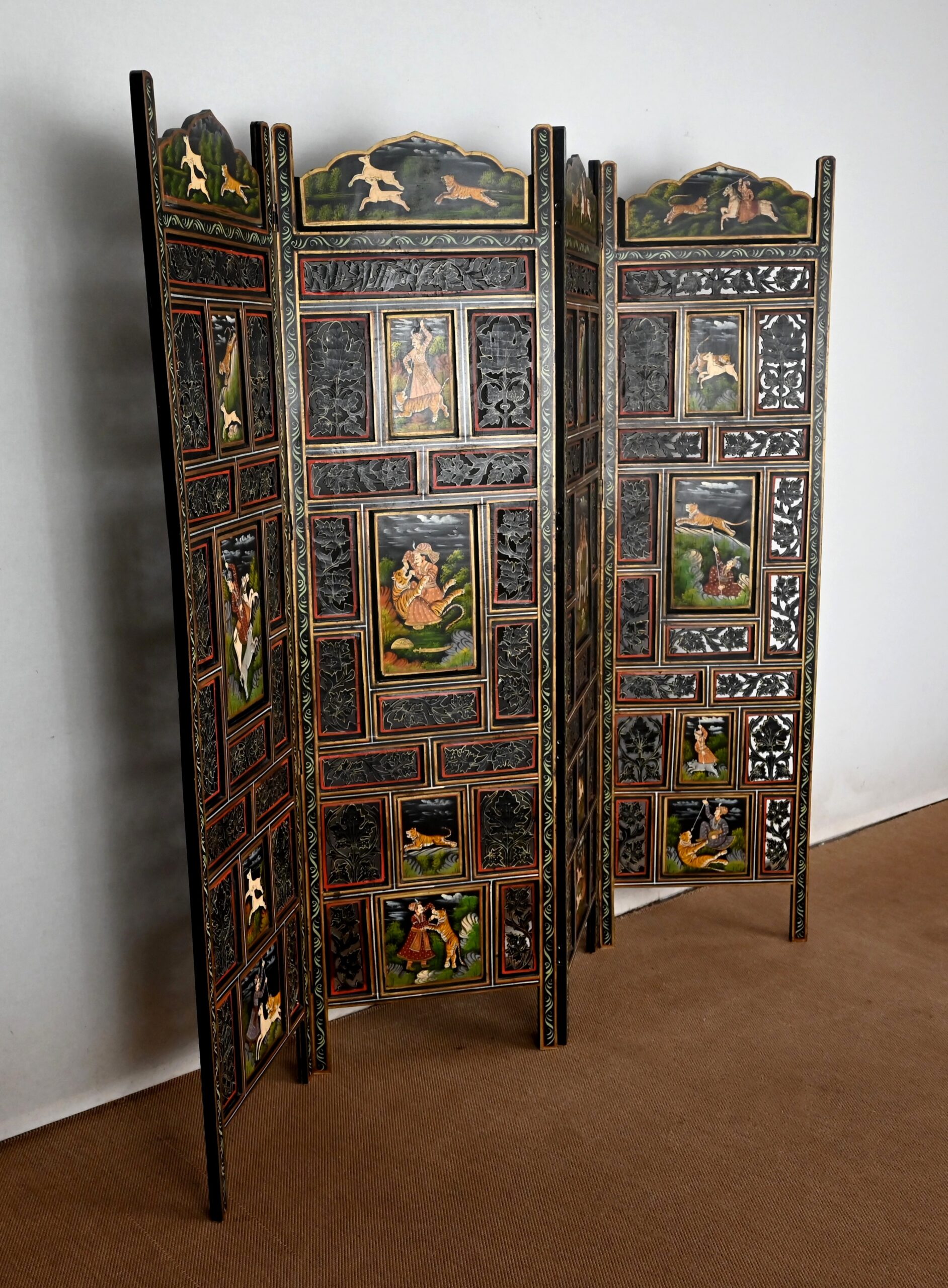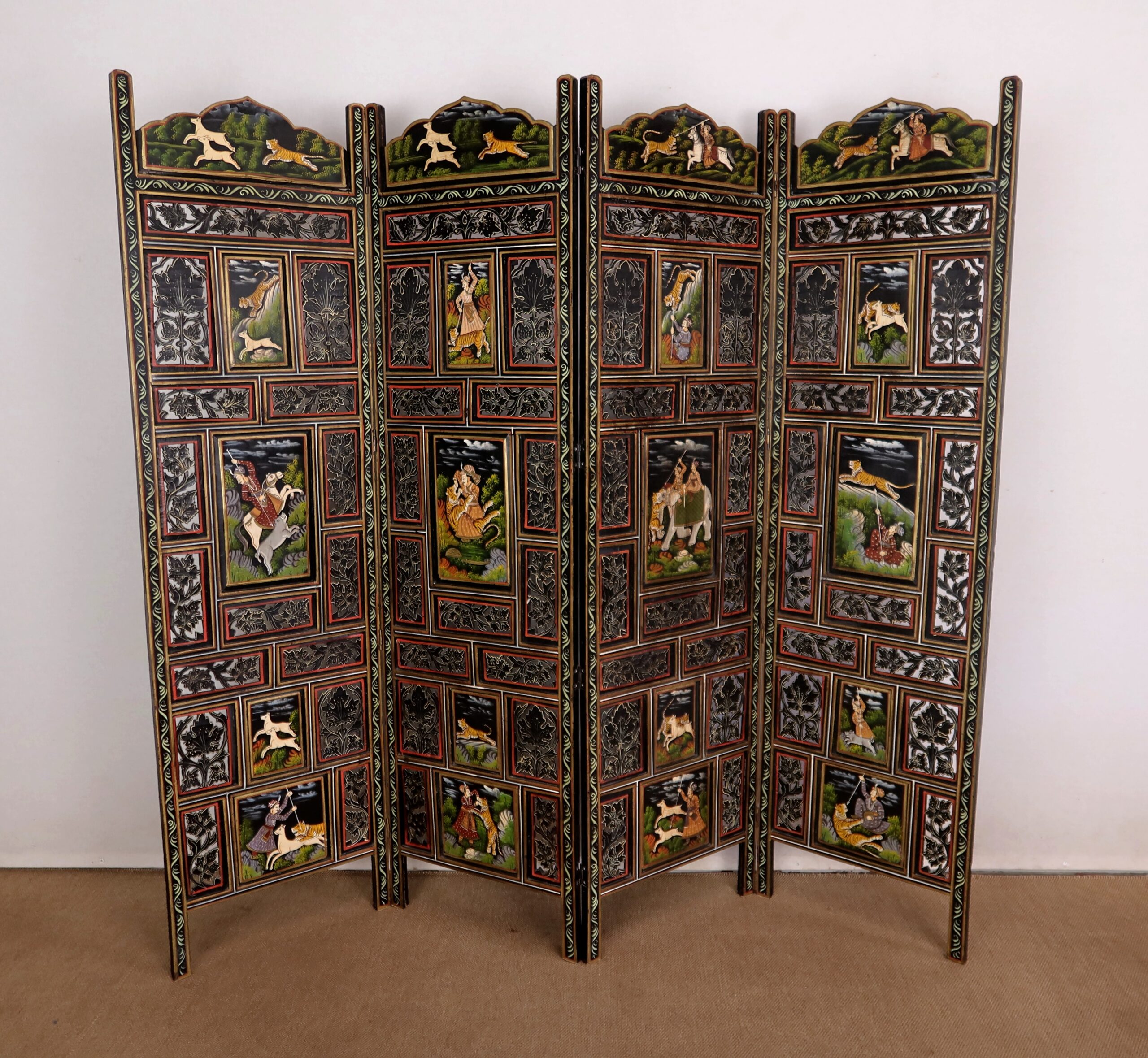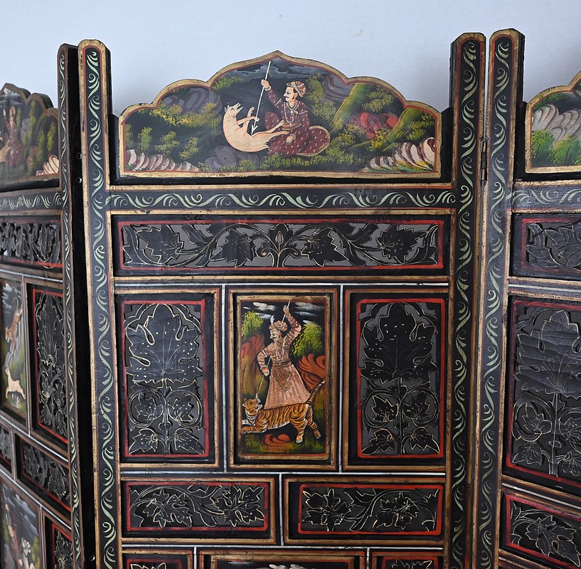 Grand paravent double-face en bois peint, réalisé par des maîtres artisans indiens du Rajasthan, au début du XXème siècle.