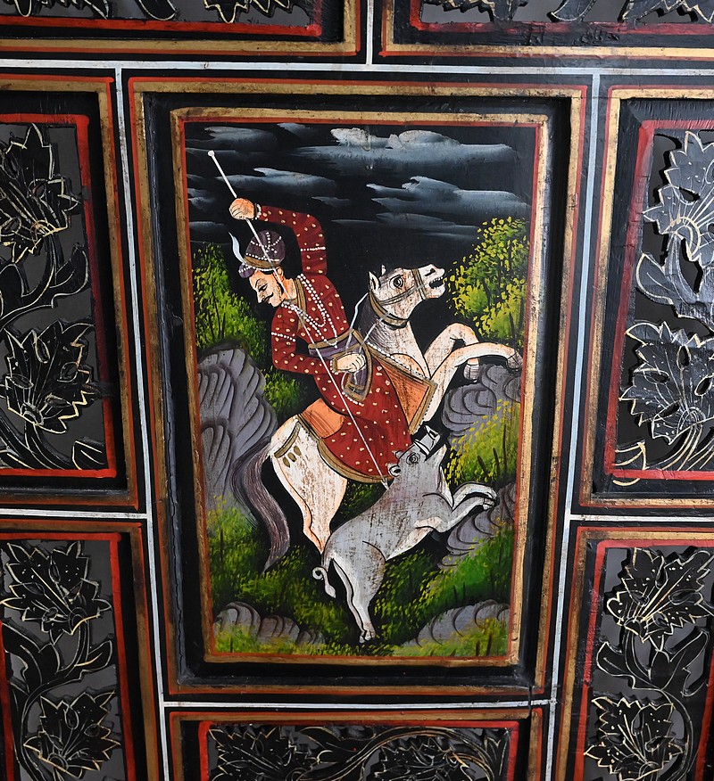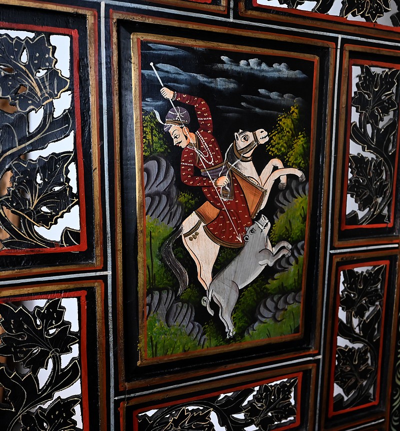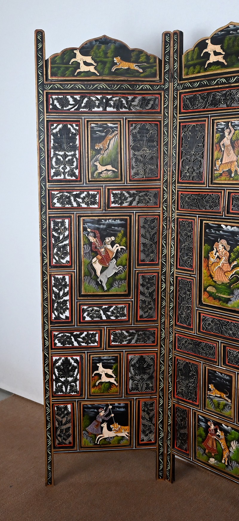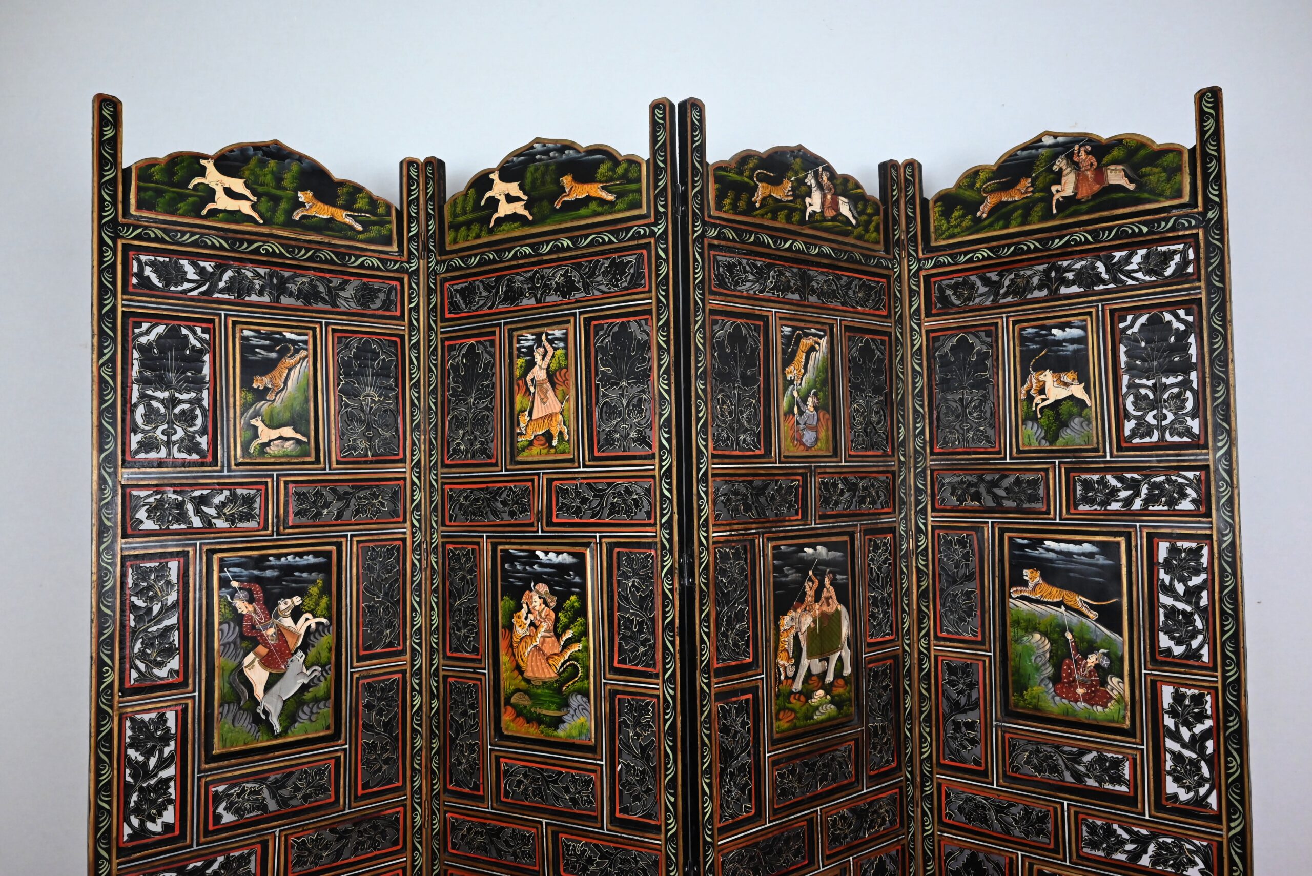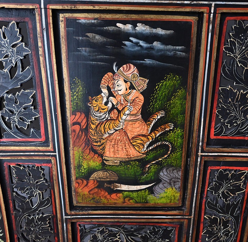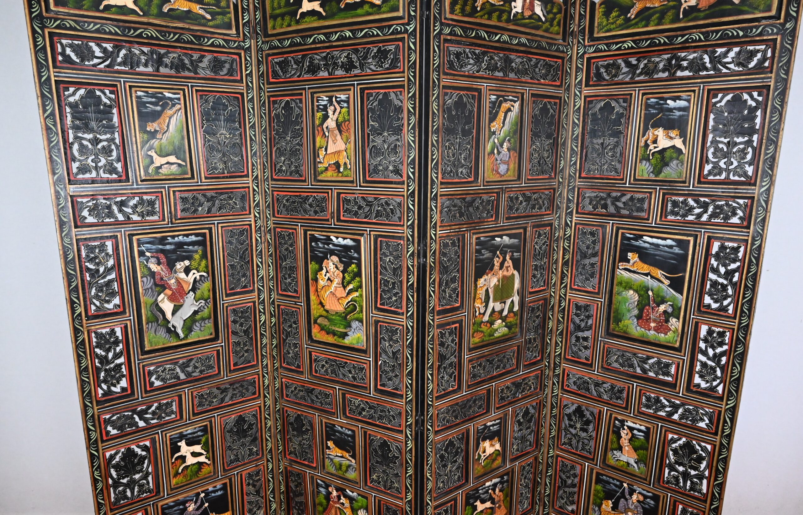 Grand paravent double-face en bois peint, réalisé par des maîtres artisans indiens du Rajasthan, au début du XXème siècle.