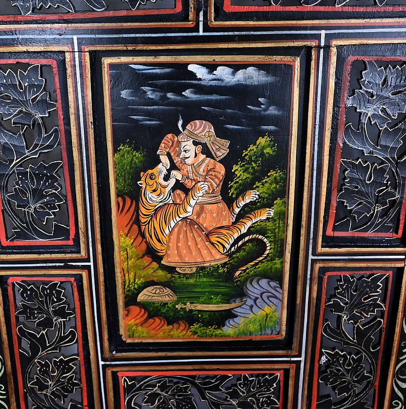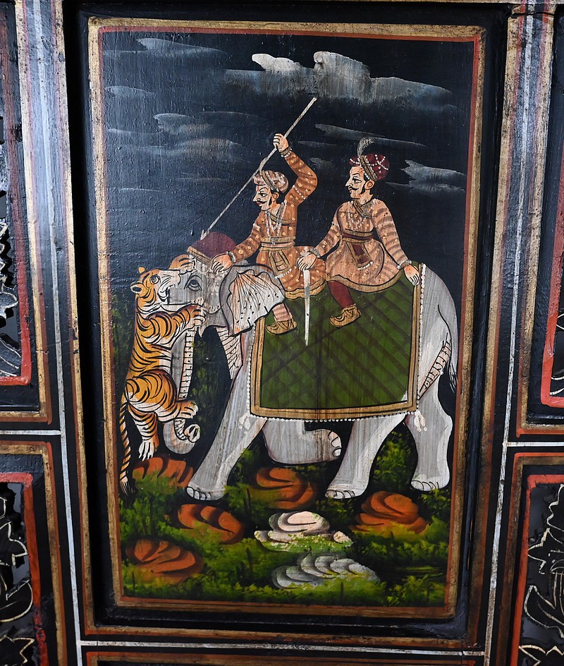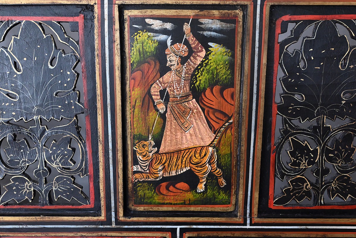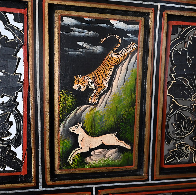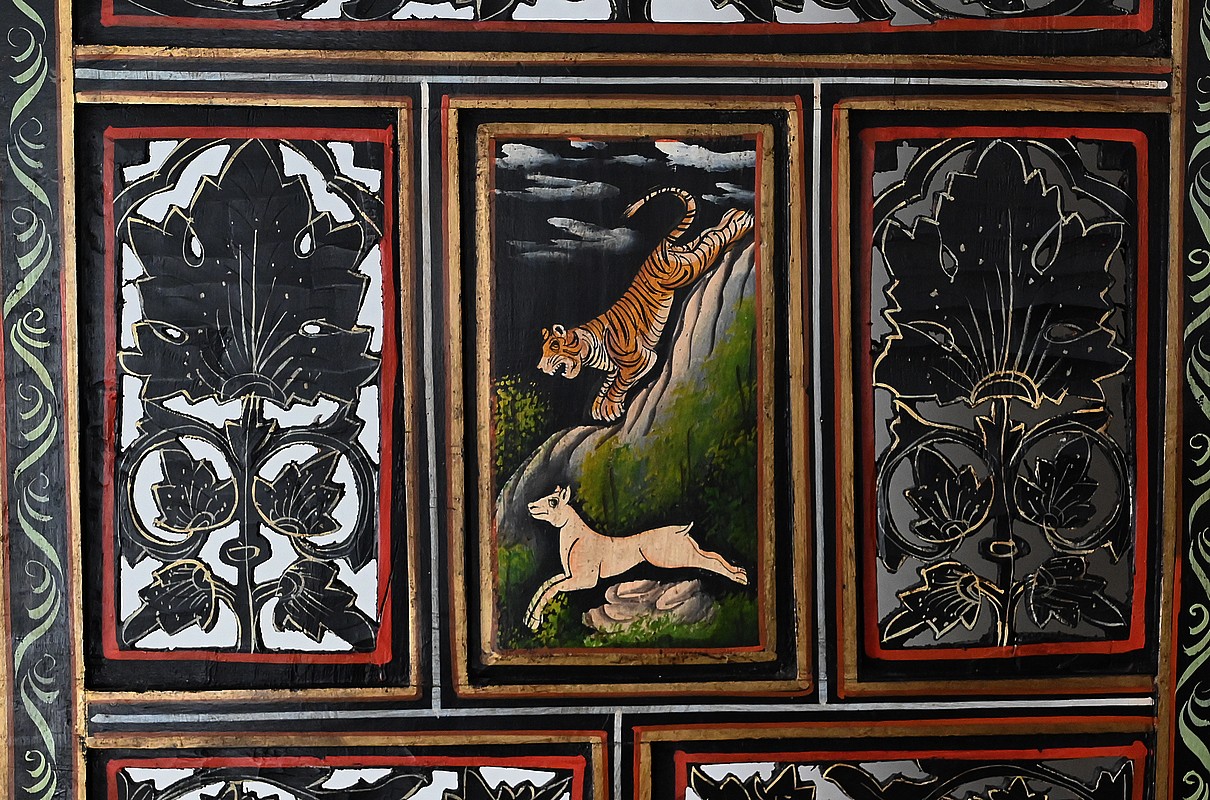 Celles-ci représentent des scènes de chasse au tigre. Des hommes en habits traditionnels sont équipés de lances et d’épées. Ils luttent parfois à mains nues ou à dos d’éléphant afin de tuer l’animal sauvage.