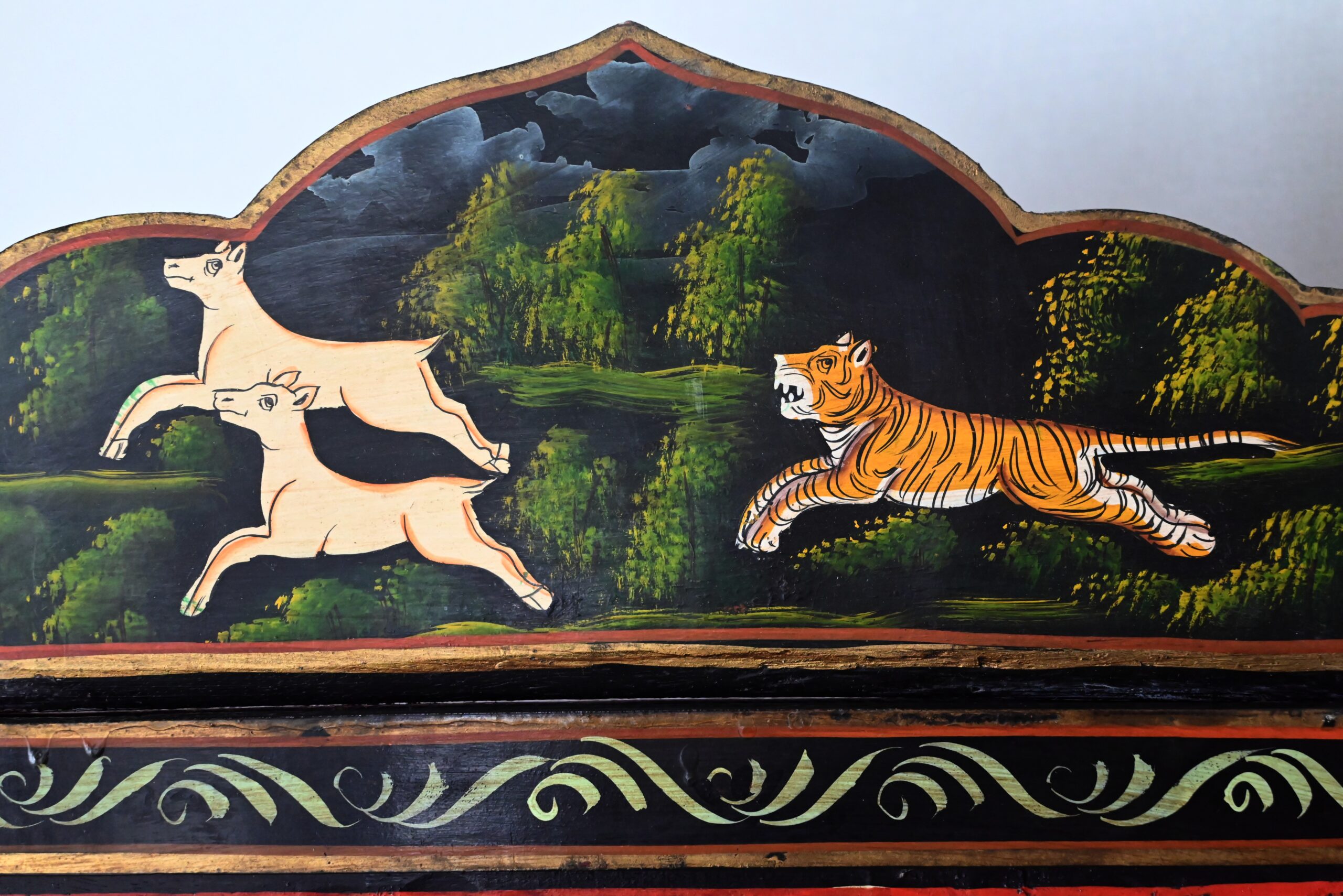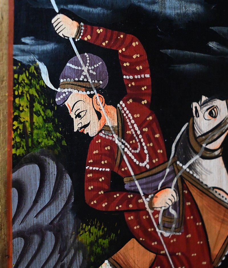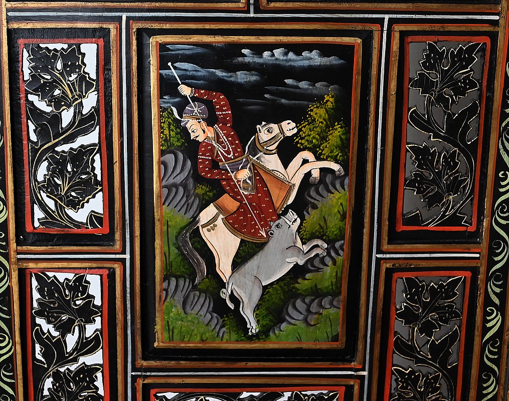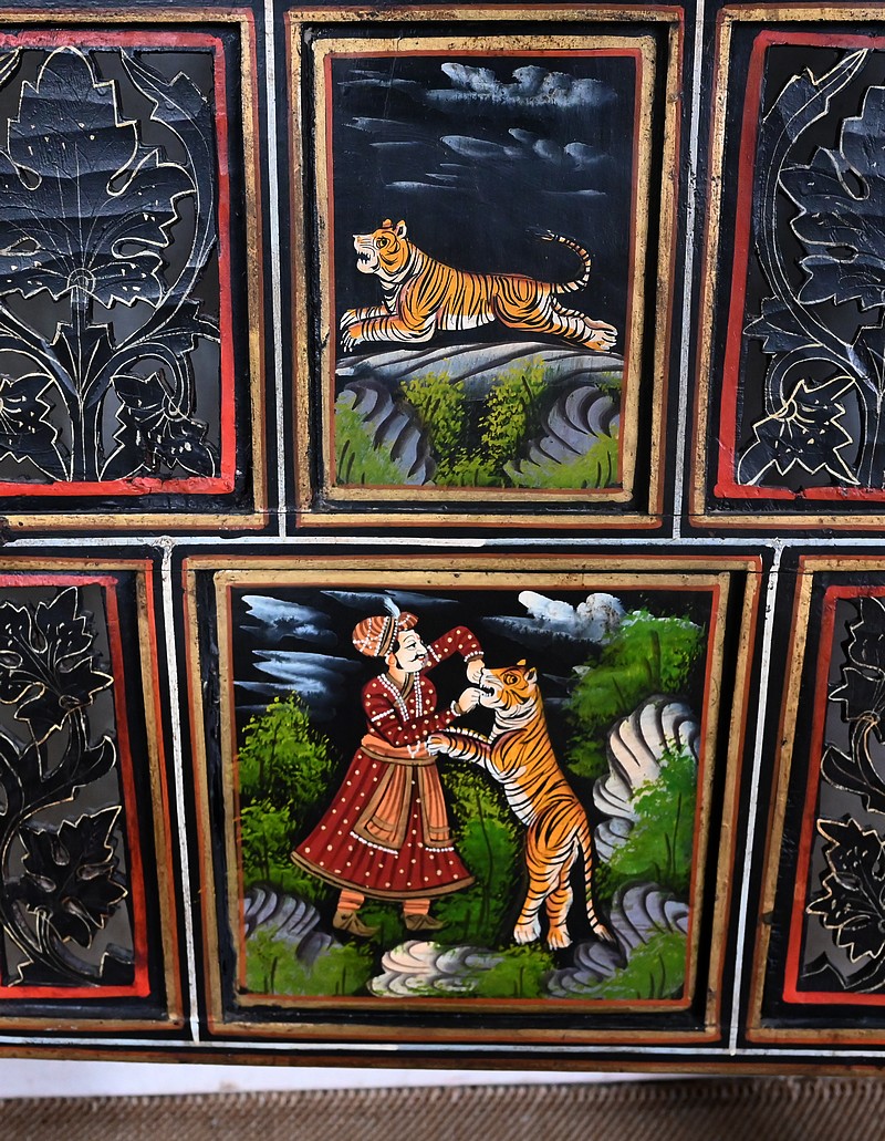 Celles-ci représentent des scènes de chasse au tigre. Des hommes en habits traditionnels sont équipés de lances et d’épées. Ils luttent parfois à mains nues ou à dos d’éléphant afin de tuer l’animal sauvage.