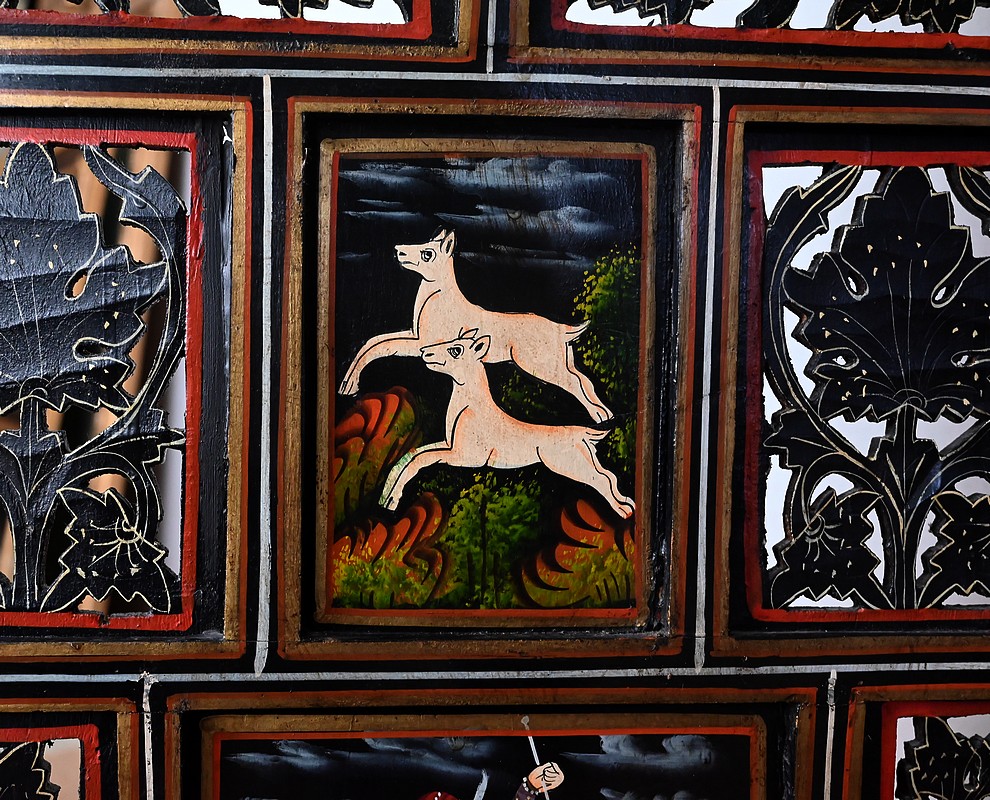 Certains panneaux sont ajourés et représentent des feuillages et des branchages. Tous les panneaux pleins sont peints sur un fond noir accompagné d’illustrations riches.