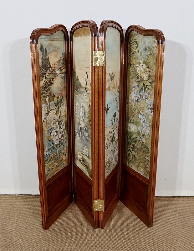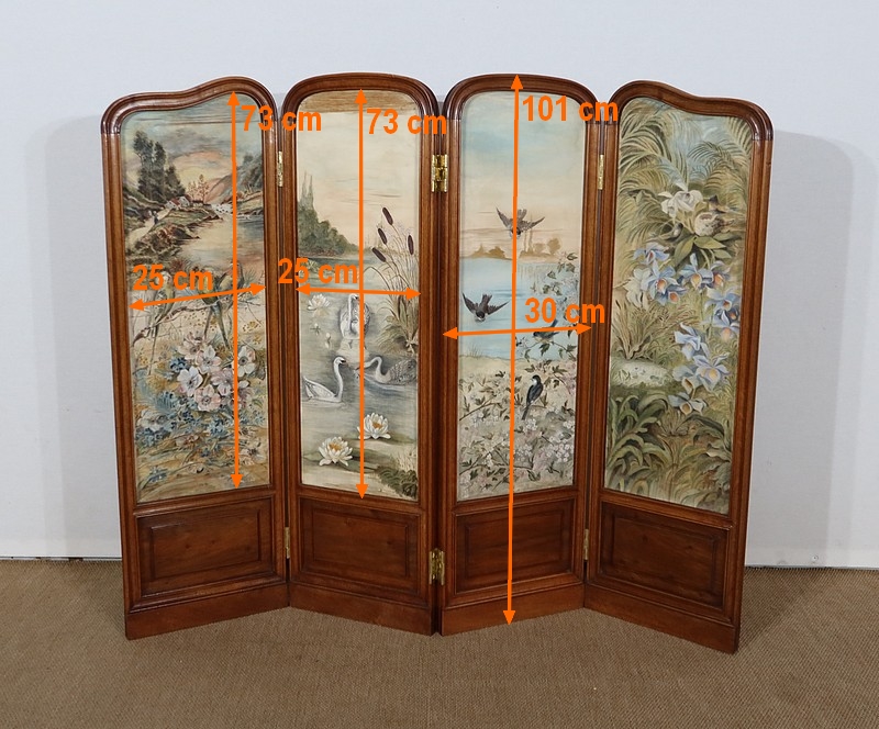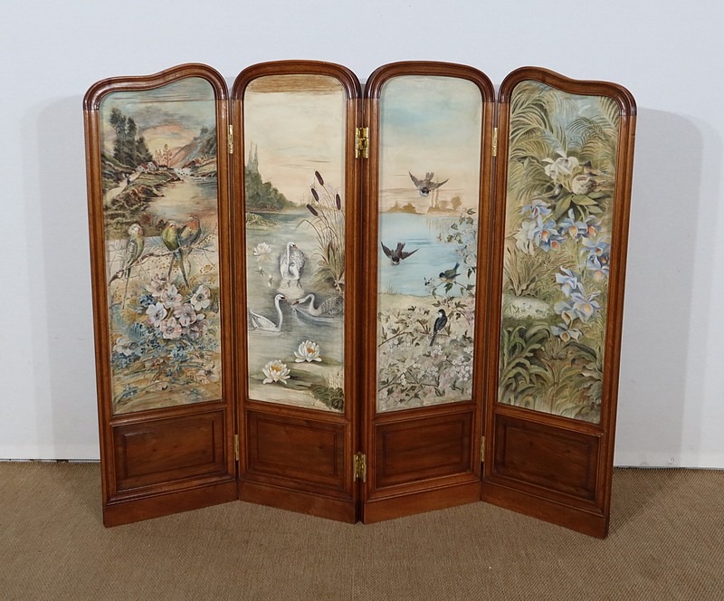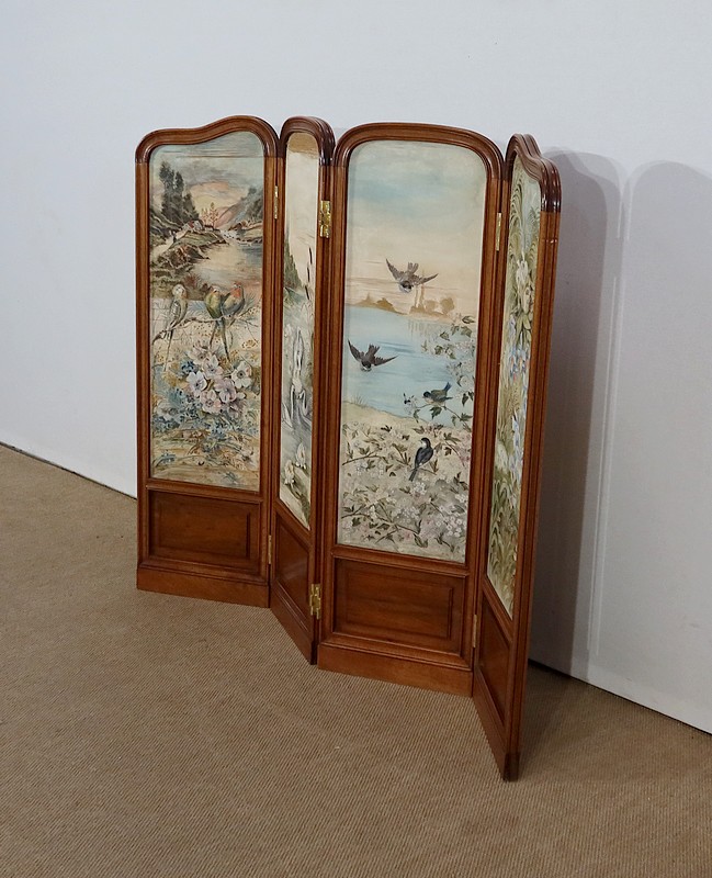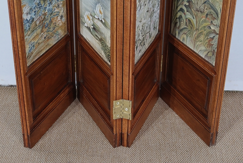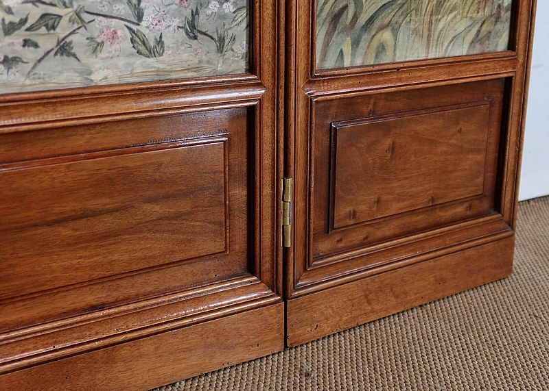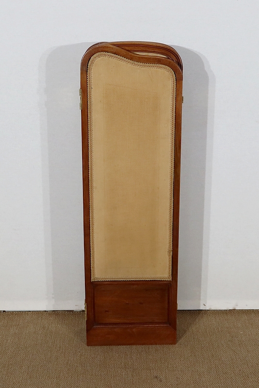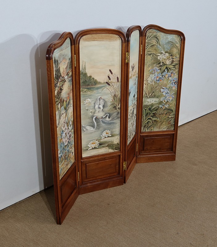 Charmant petit paravent de style Art Nouveau avec un encadrement en noyer massif mouluré et à gorge. Chacune des quatre feuilles comporte en partie basse un petit panneau rectangulaire à plate bande.