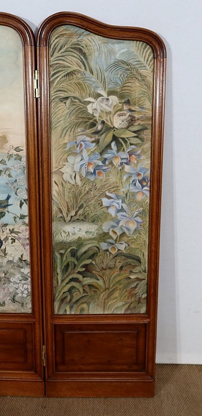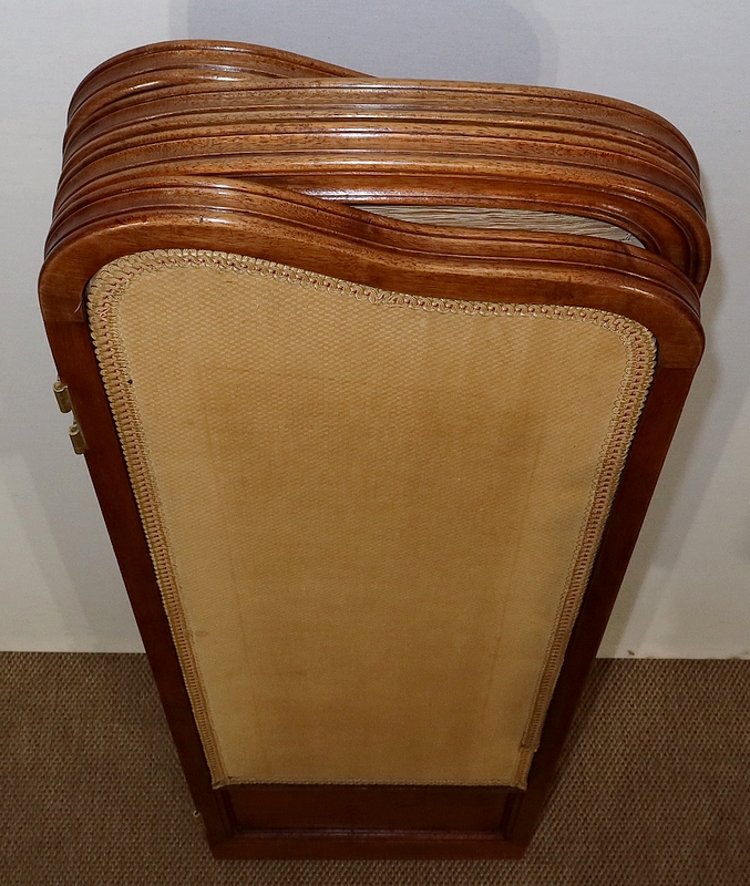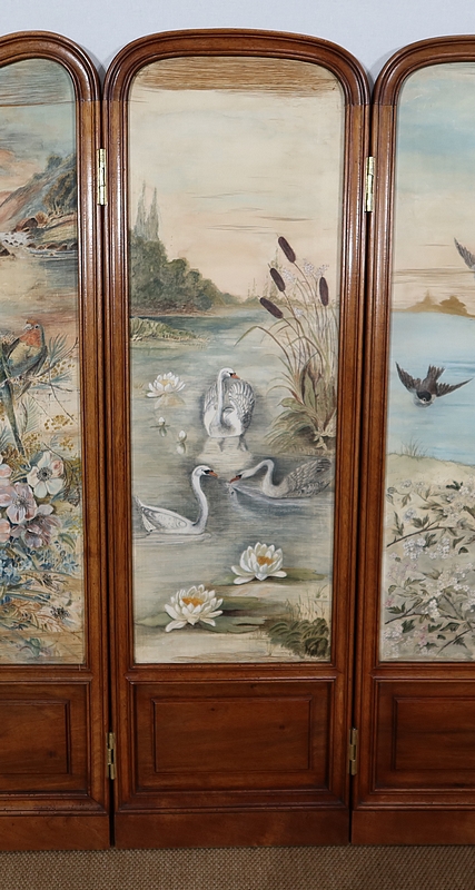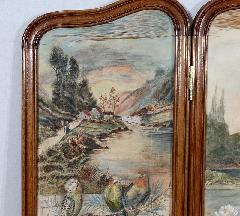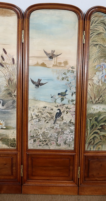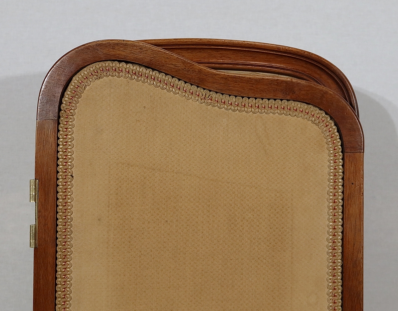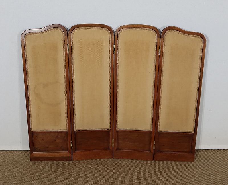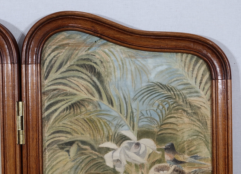 Charmant petit paravent de style Art Nouveau avec un encadrement en noyer massif mouluré et à gorge. Chacune des quatre feuilles comporte en partie basse un petit panneau rectangulaire à plate bande.