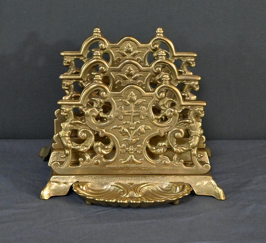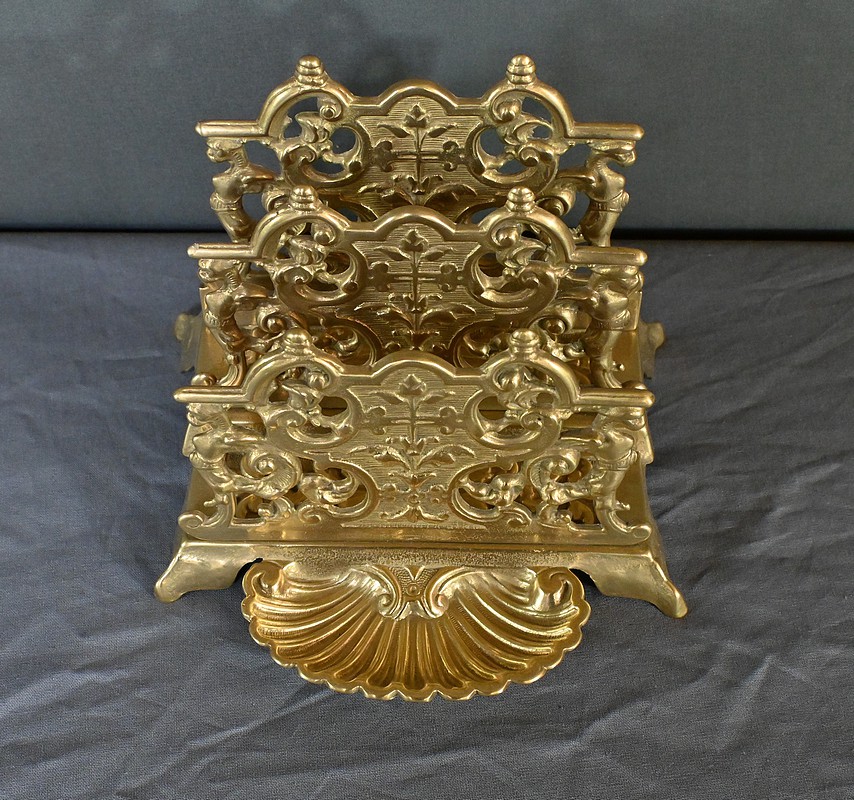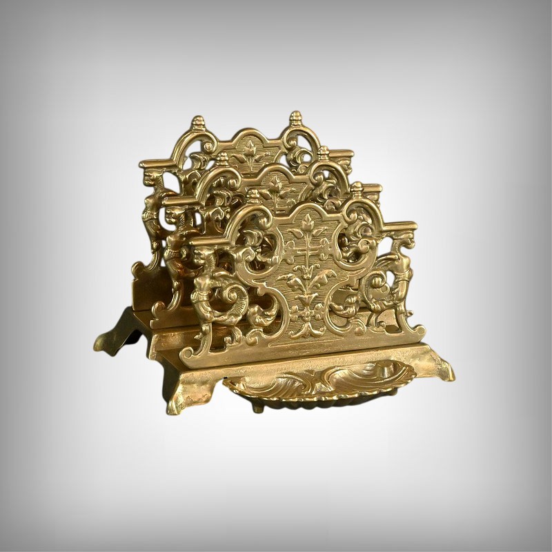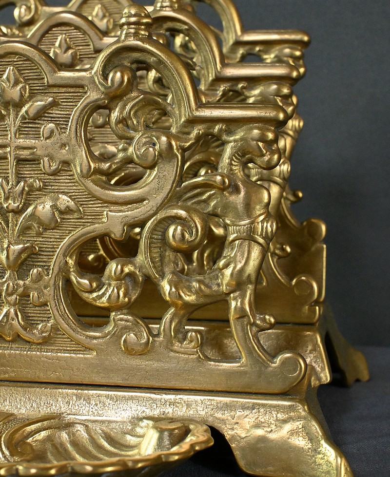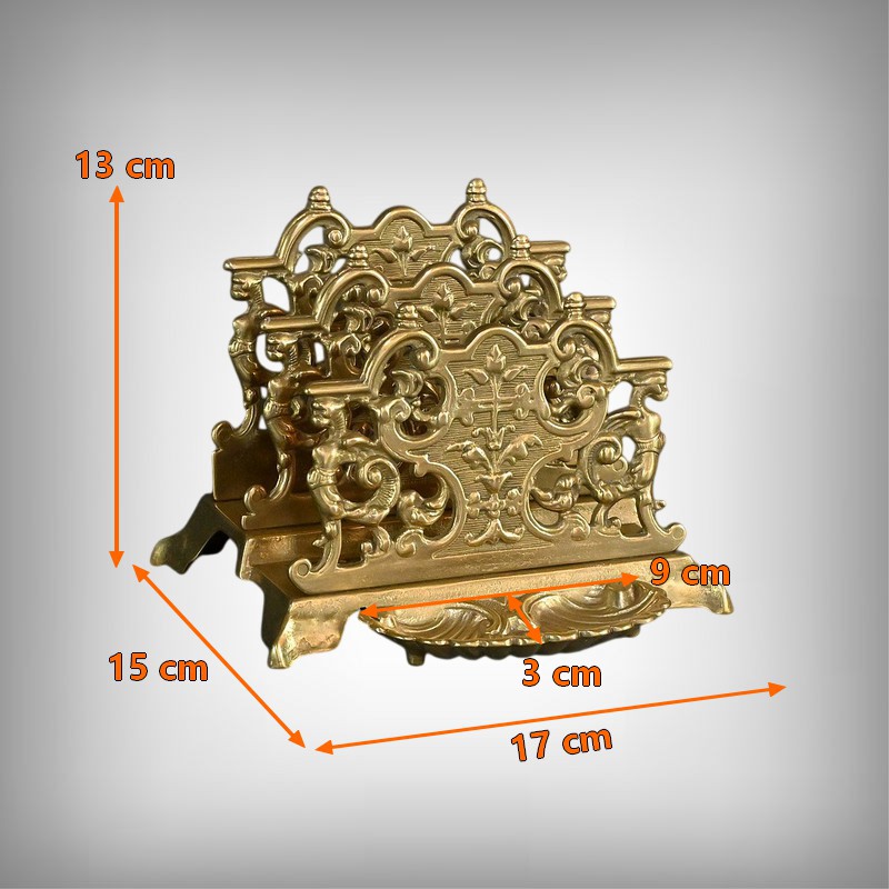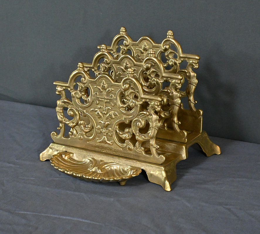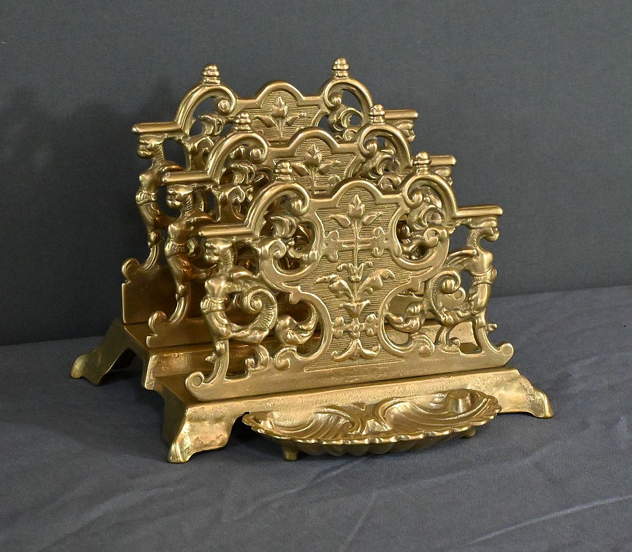 Ce porte-lettres en laiton doré finement ouvragé, présente un délicat travail de ciselure avec des motifs floraux, des volutes symétriques de style Art Nouveau et des griffons majestueux. Sa structure à plusieurs compartiments permet d’organiser lettres, documents ou cartes avec raffinement. Ce porte-courrier repose sur une base décorative figurant une grande coquille à l’avant qui renforce son allure classique. L’ensemble dégage un charme authentique qui séduira les amateurs d’objets anciens et les passionnés de décoration vintage. Que ce soit comme pièce fonctionnelle ou comme élément d’exposition, ce porte-lettres apporte une touche de charisme à tout intérieur.