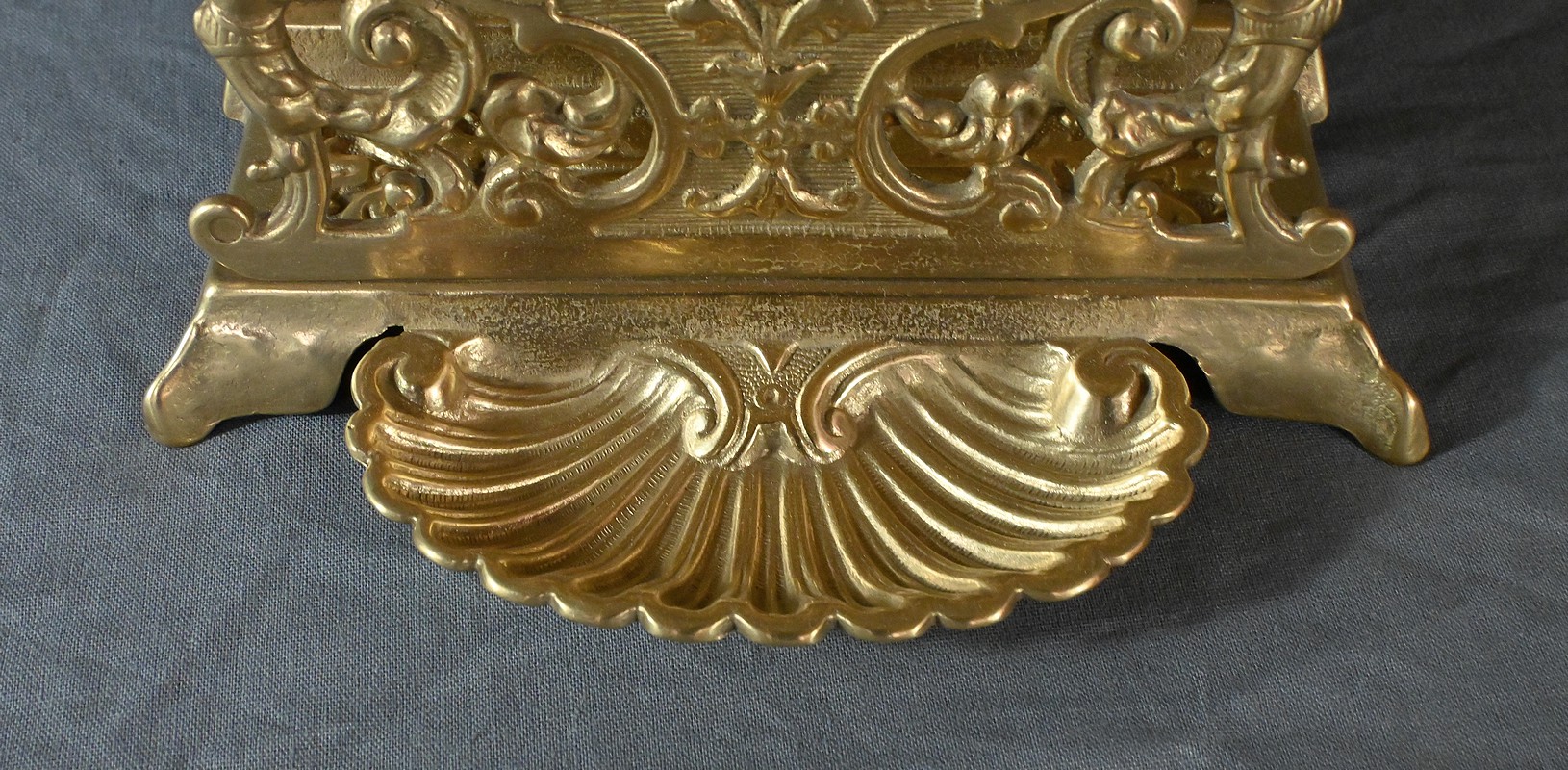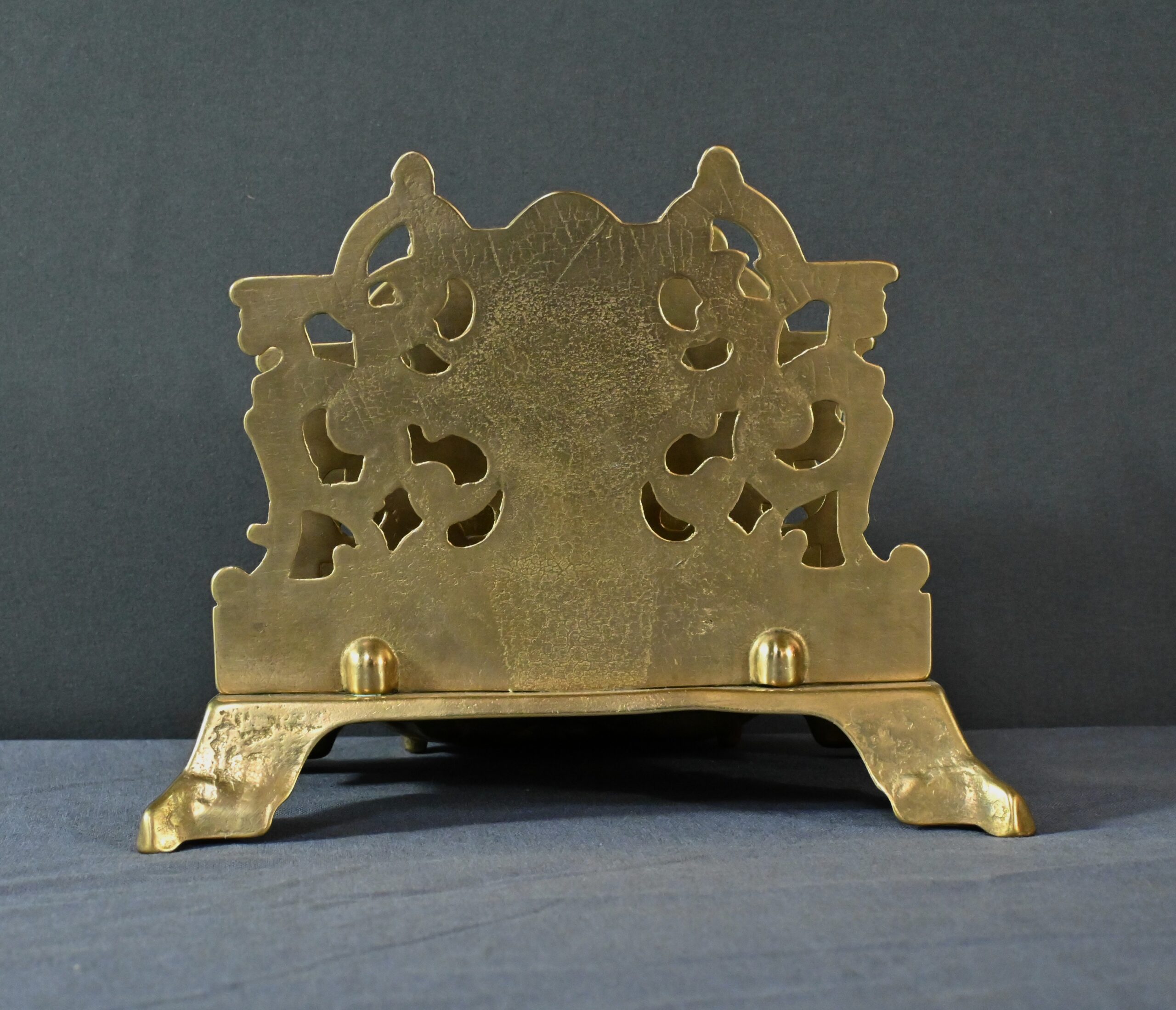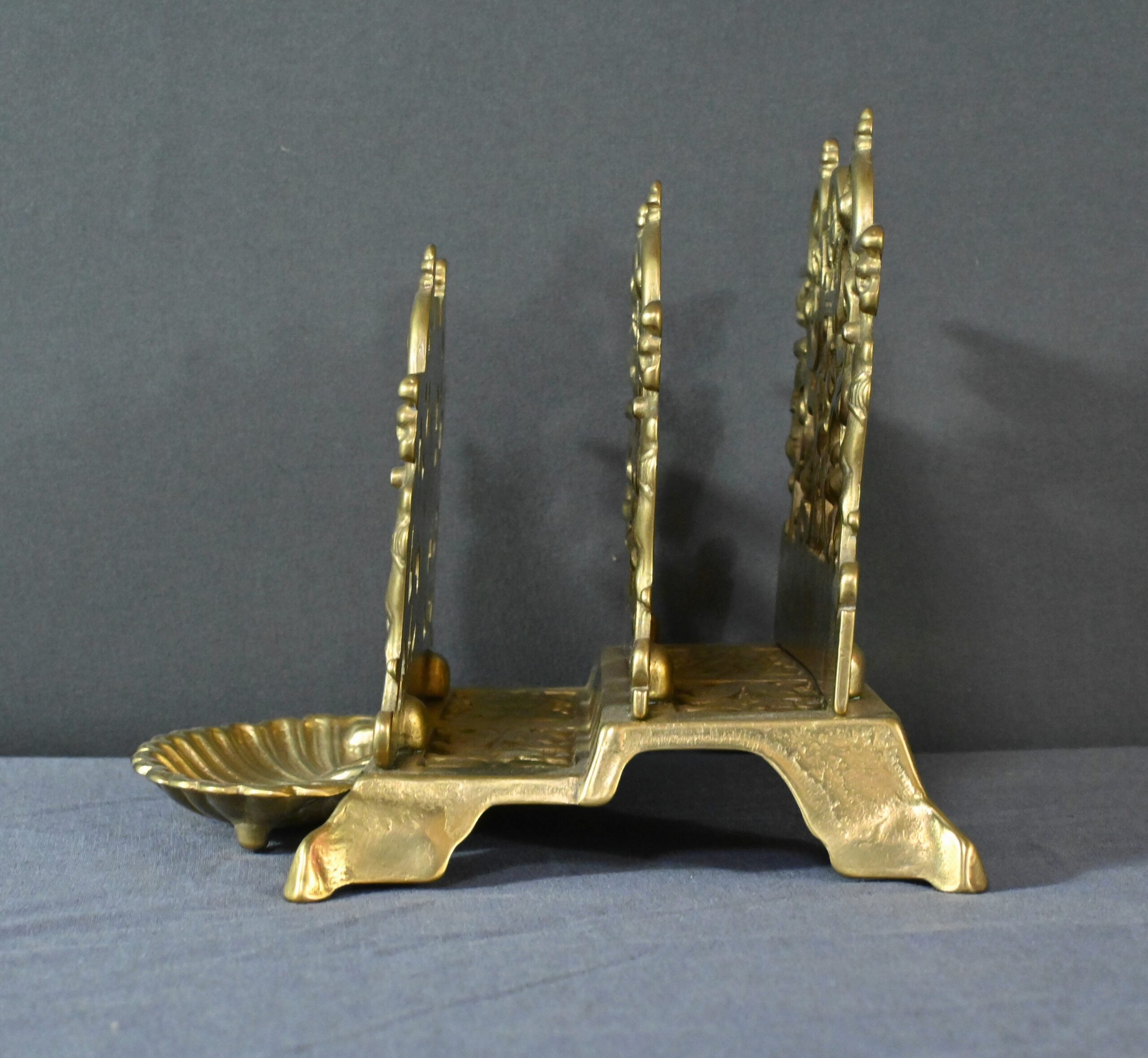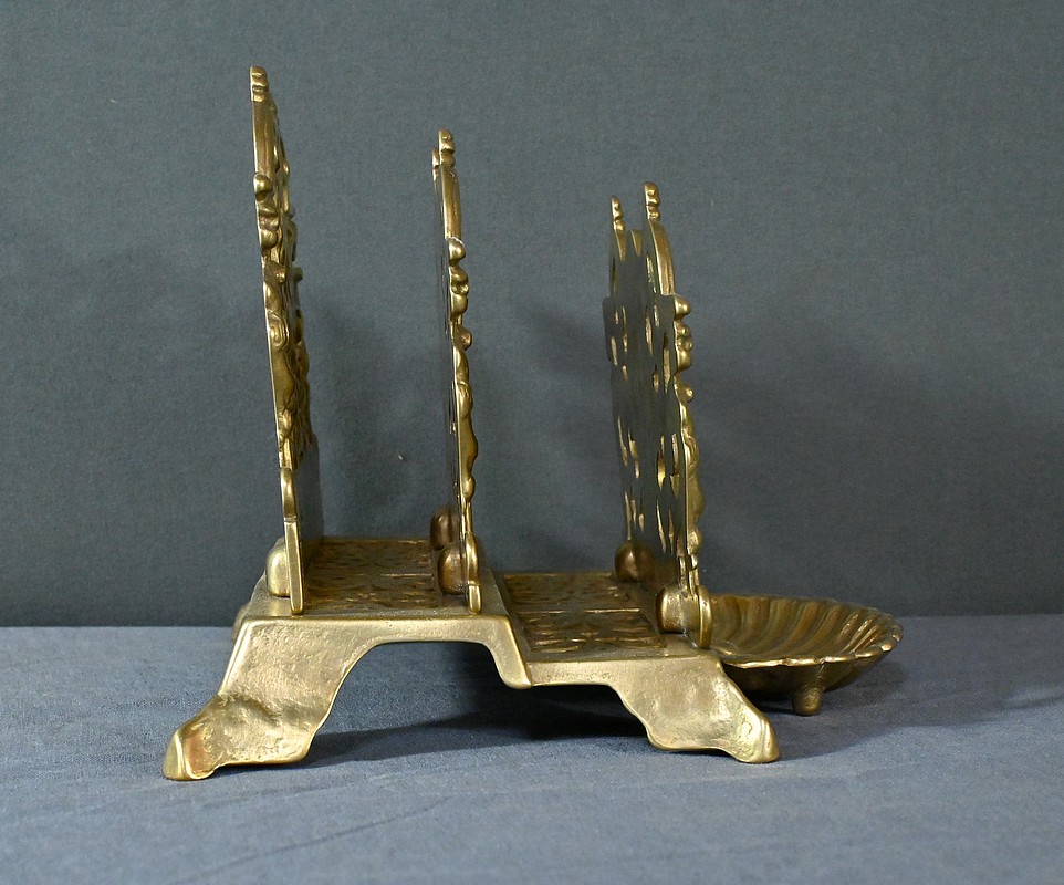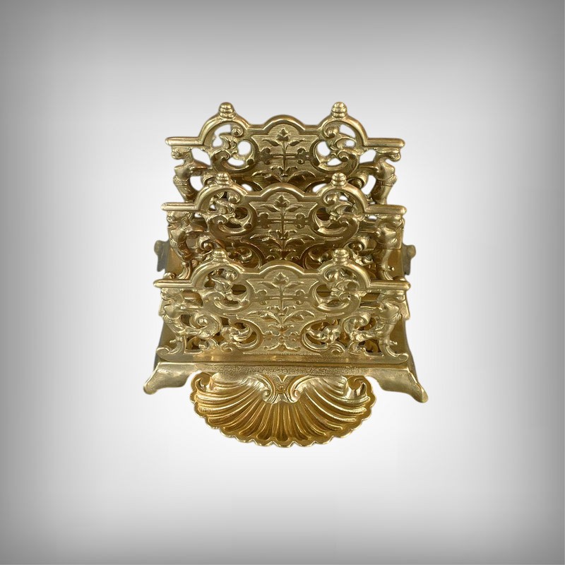 Ce porte-lettres en laiton doré finement ouvragé, présente un délicat travail de ciselure avec des motifs floraux, des volutes symétriques de style Art Nouveau et des griffons majestueux. Sa structure à plusieurs compartiments permet d’organiser lettres, documents ou cartes avec raffinement. Ce porte-courrier repose sur une base décorative figurant une grande coquille à l’avant qui renforce son allure classique. L’ensemble dégage un charme authentique qui séduira les amateurs d’objets anciens et les passionnés de décoration vintage. Que ce soit comme pièce fonctionnelle ou comme élément d’exposition, ce porte-lettres apporte une touche de charisme à tout intérieur.
