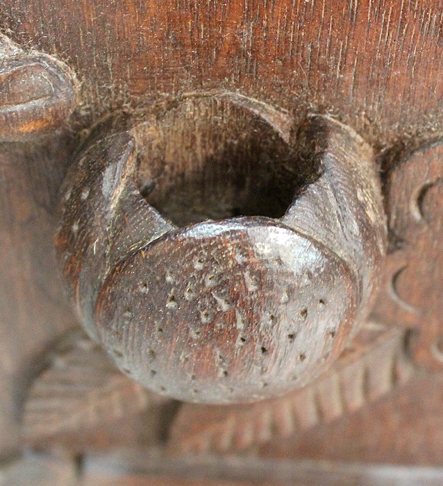 Trois paires de motifs en reliefs, disposées en symétrie, ornent également ce curieux objet. L’une d’elle représente certainement des fruits à coques, qui se révèlent être creux.