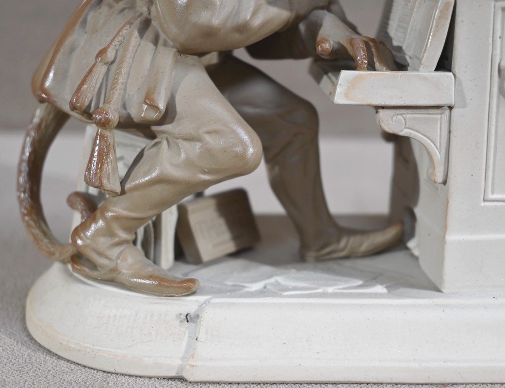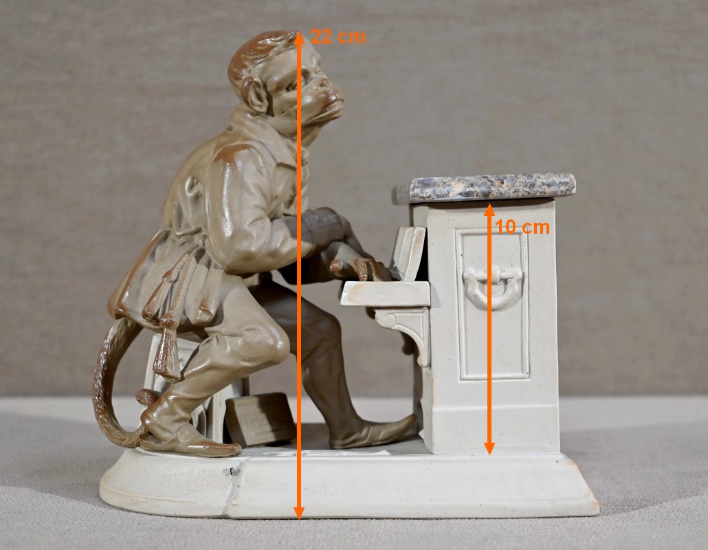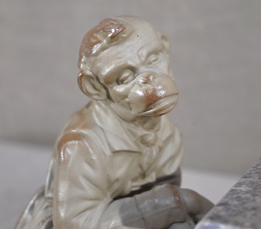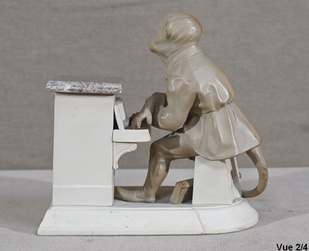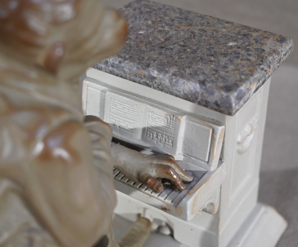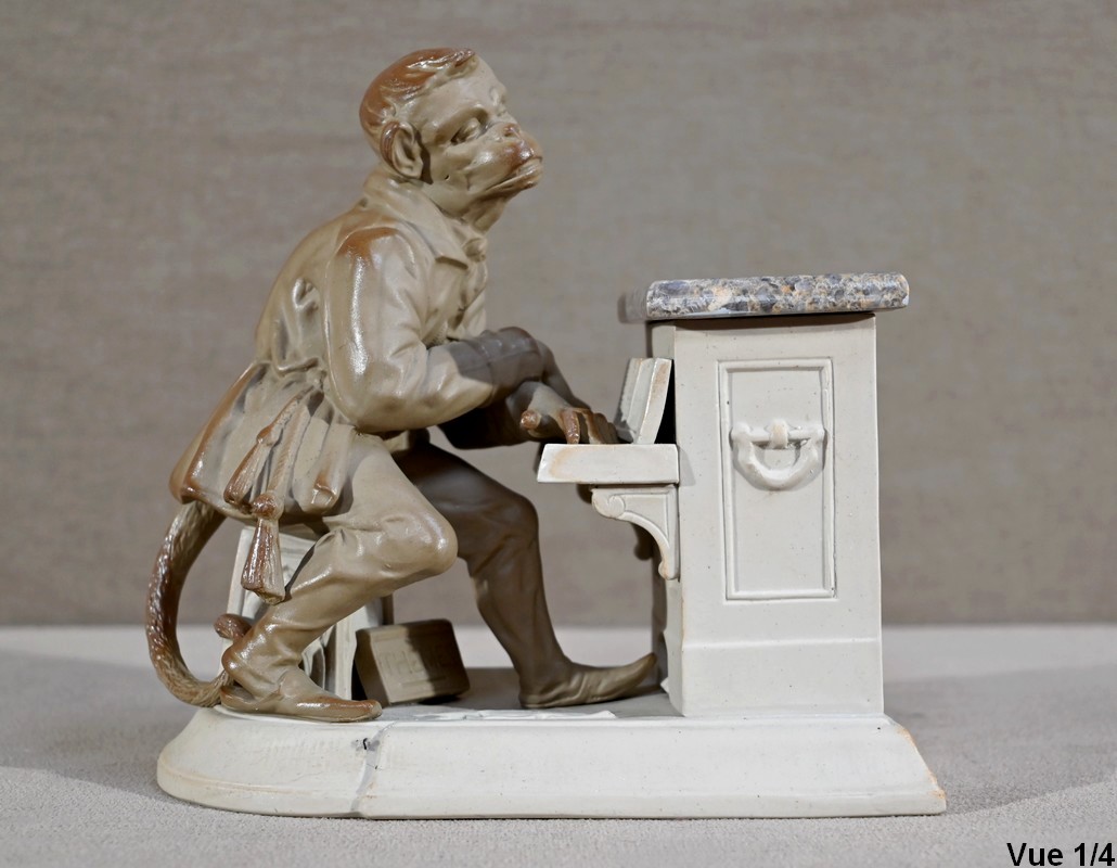 Cette œuvre proposée à l’époque en différentes déclinaisons, telles qu’en biscuit, grès, majolique ou parian, est ici réalisée en grès pour le singe et biscuit pour le piano.