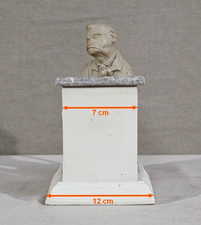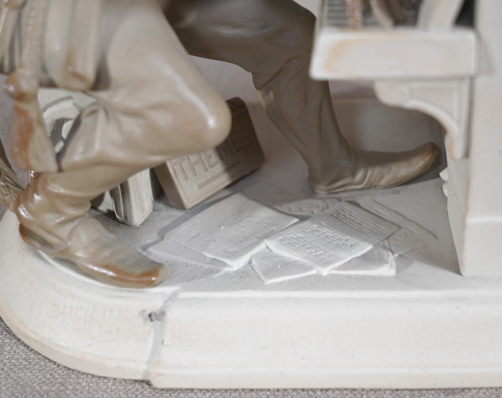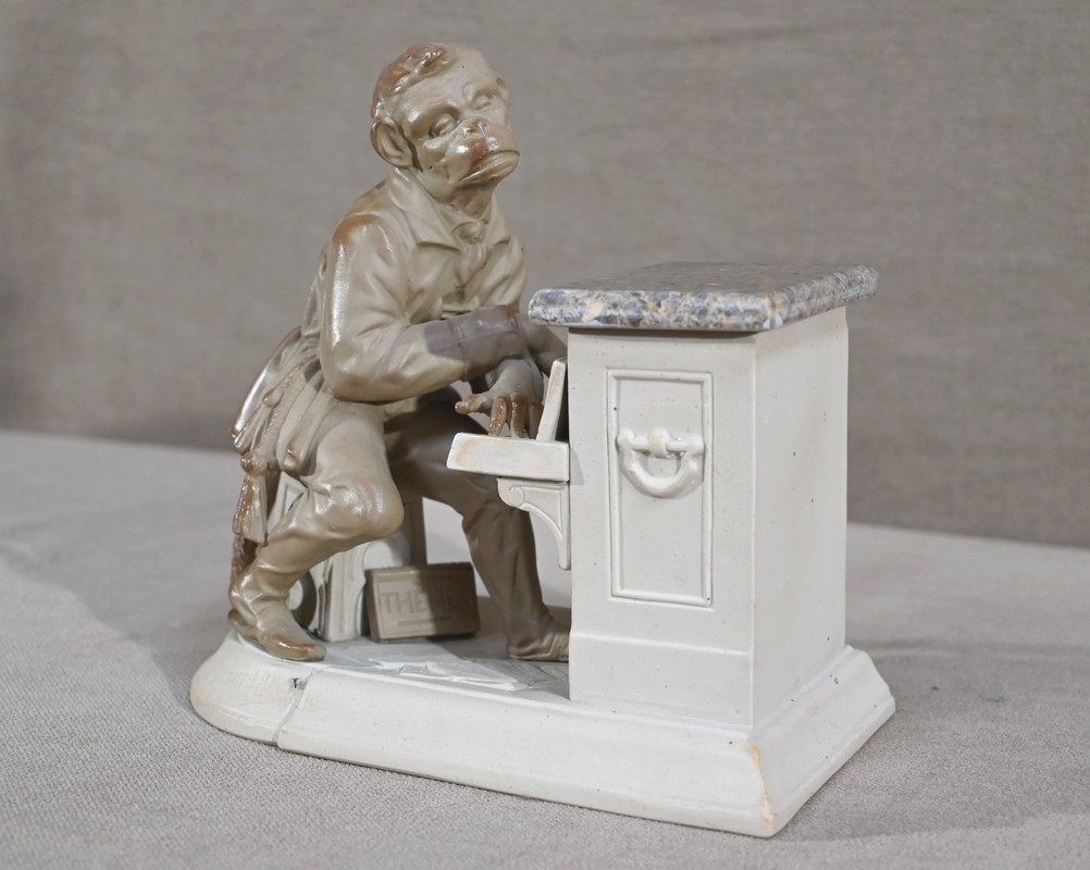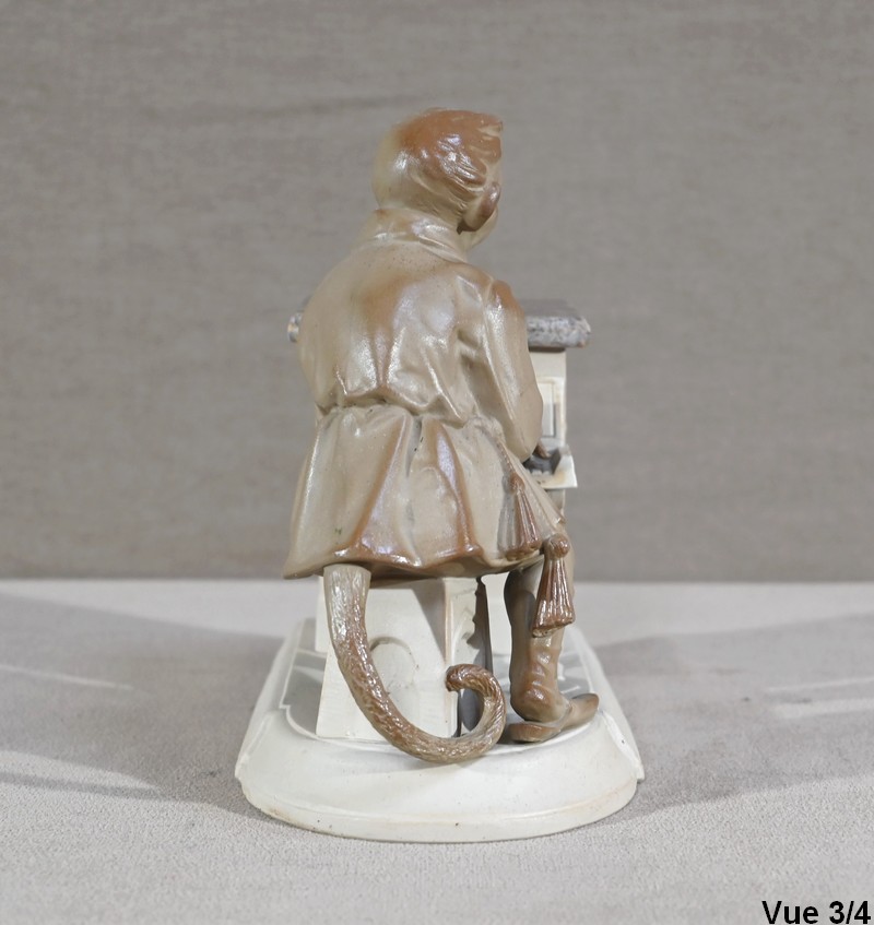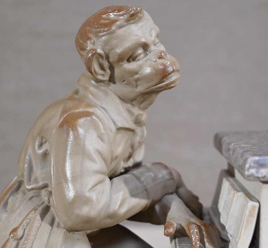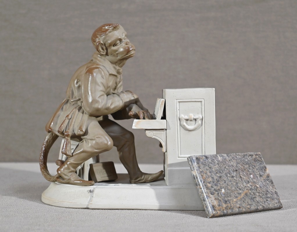 Cette œuvre proposée à l’époque en différentes déclinaisons, telles qu’en biscuit, grès, majolique ou parian, est ici réalisée en grès pour le singe et biscuit pour le piano.