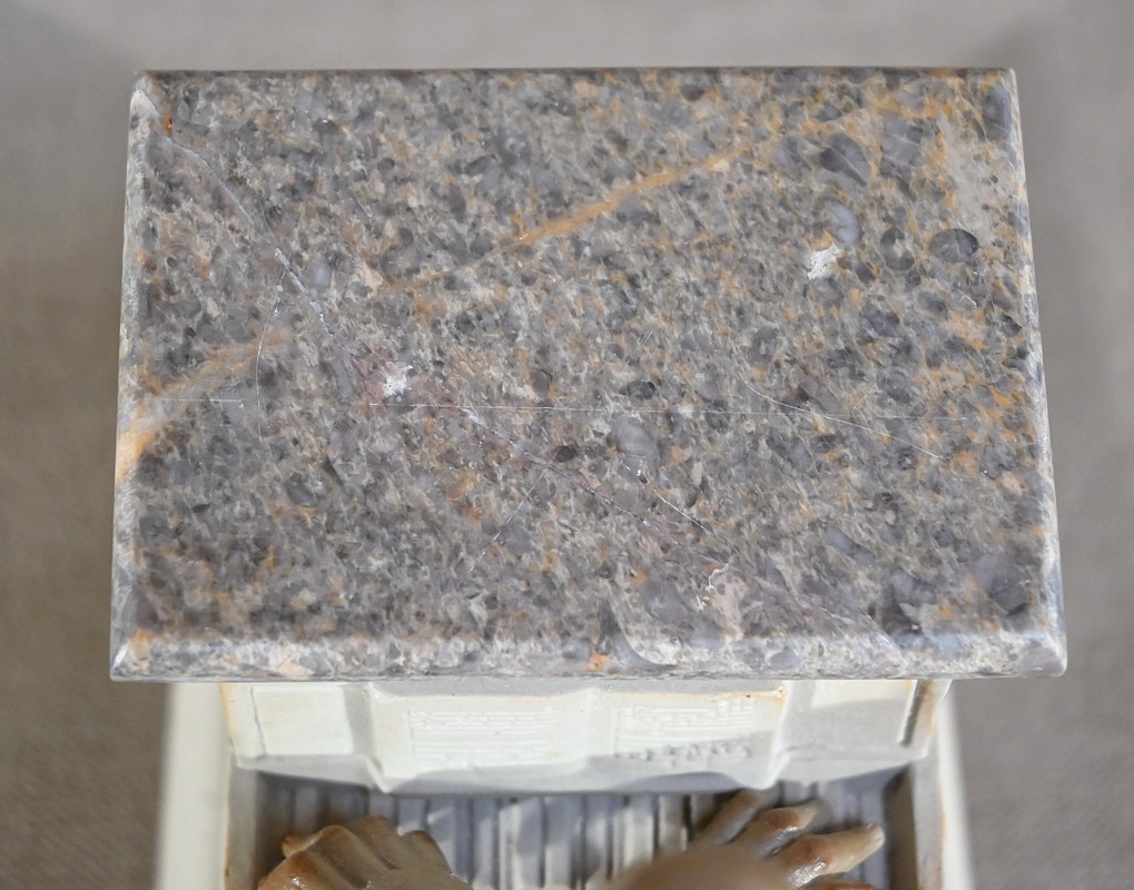 Le coffre de l’instrument constitue la réserve à tabac. Celle-ci est chapeautée d’un couvercle en marbre gris-bleu aux veines orangées.