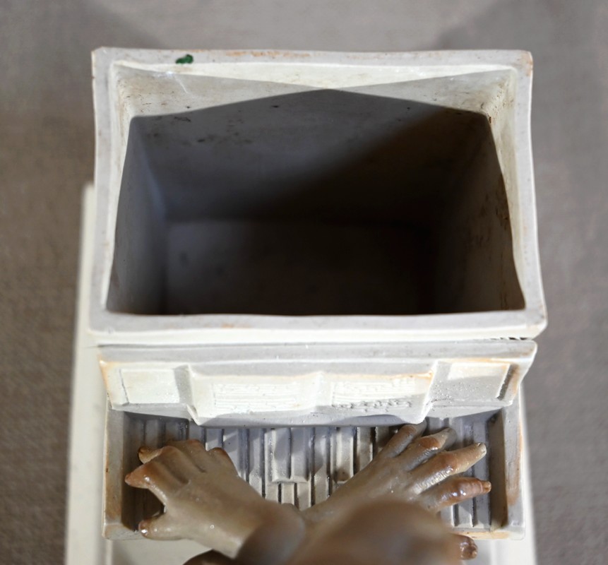 Ce pot à tabac représente un singe pianiste, paré d’un costume à queue-de-pie, assis sur un tabouret et jouant du piano. Des partitions jonchent le sol ainsi qu’un livre de thèmes musicaux.