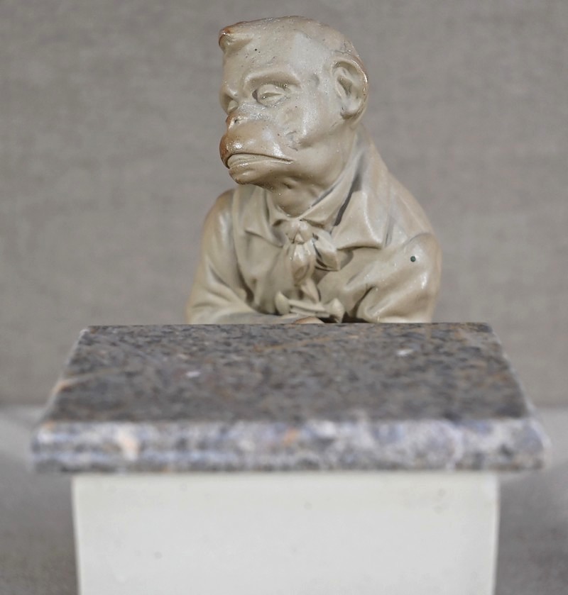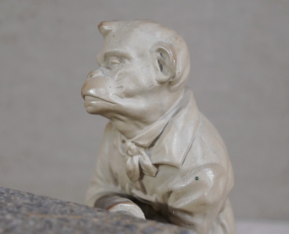 Pot à tabac intitulé « Singe Mélomane » produit par la célèbre manufacture de faïence de Sarreguemines et portant le numéro de forme 231 ainsi que la lettre E.