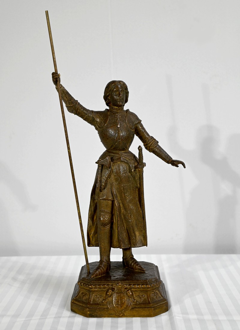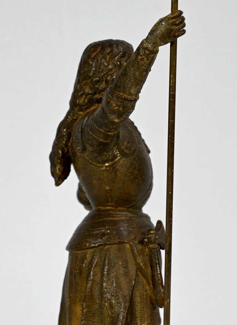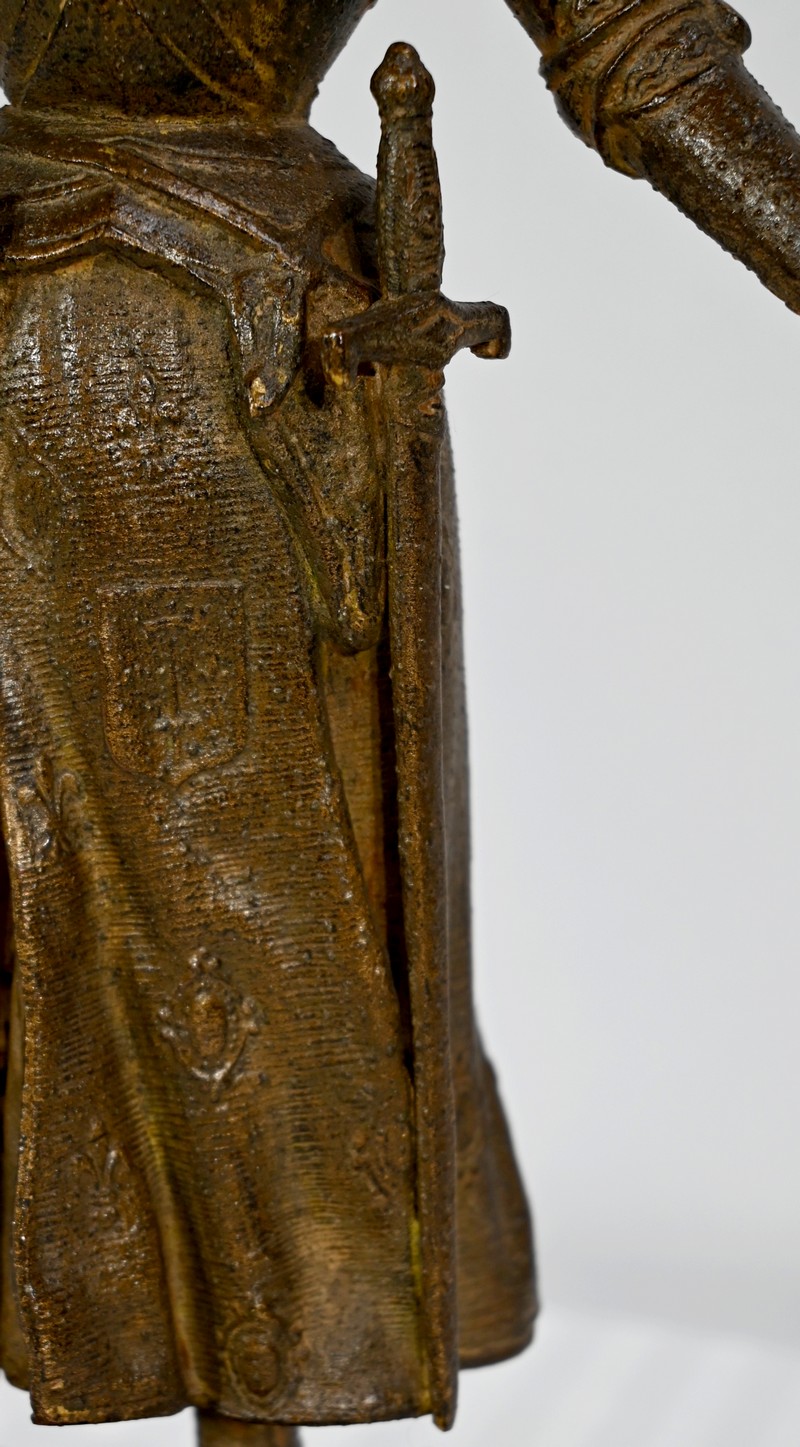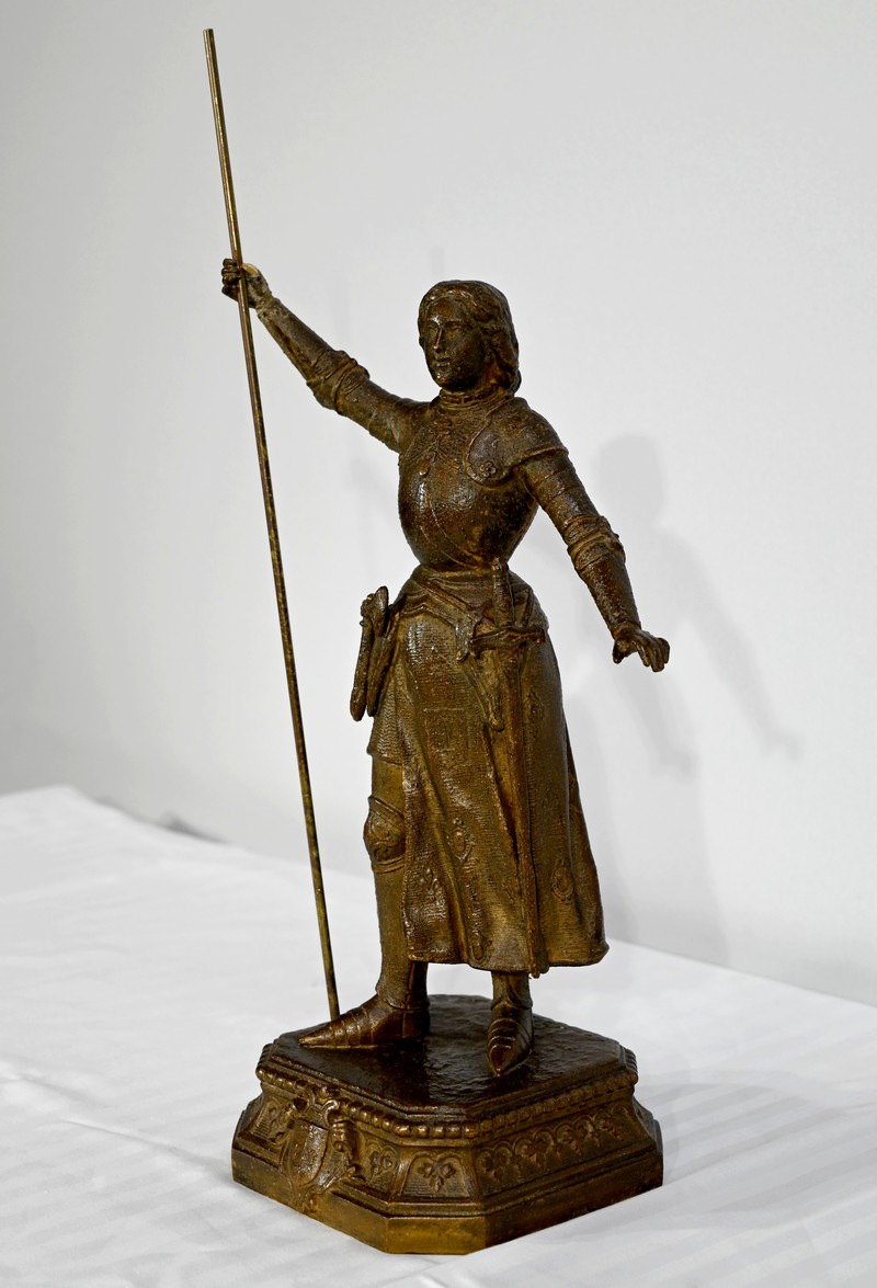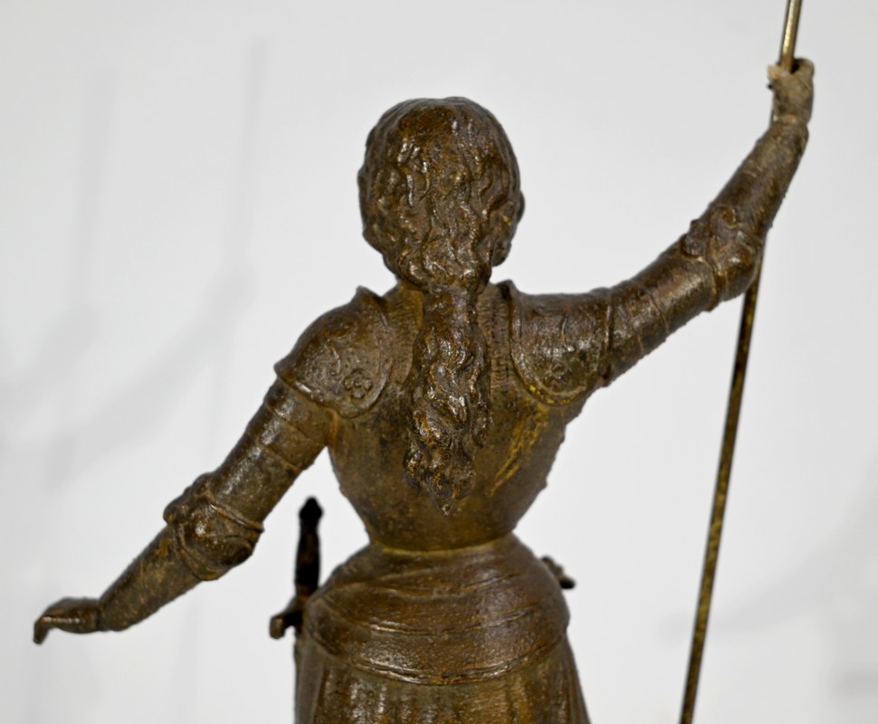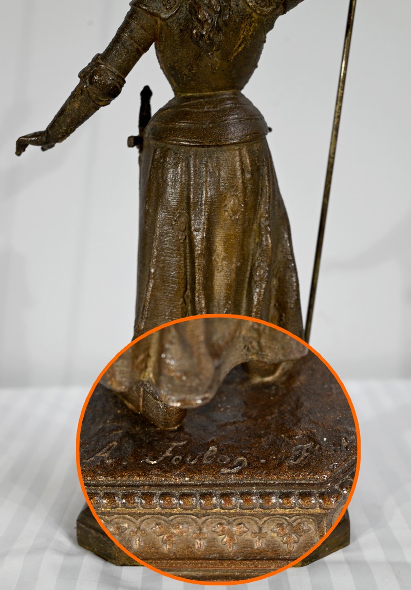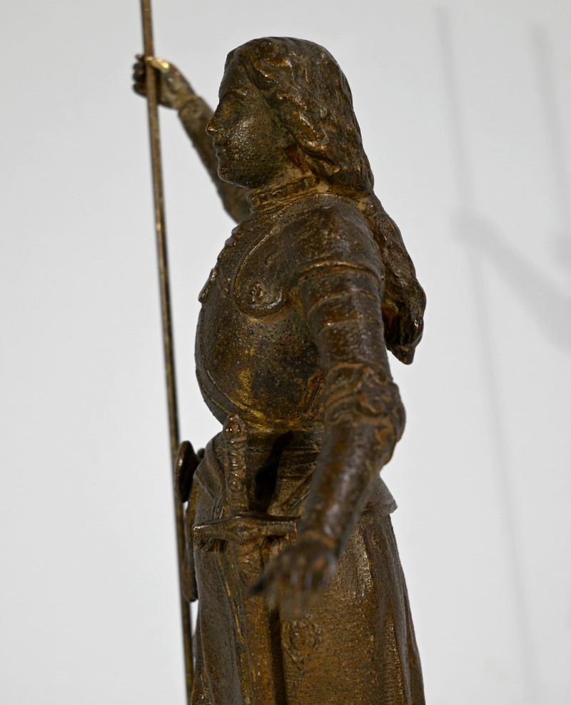 Régule à patine brune figurant Jeanne d’Arc victorieuse, signé sur la terrasse A.Foulon Enfant. La pucelle d’Orléans, comme se plaisaient à l’appeler les Anglais, se tient droite, vêtue d’une longue jupe portant ses armoiries, d’une armure complète et chaussée de solerets.
