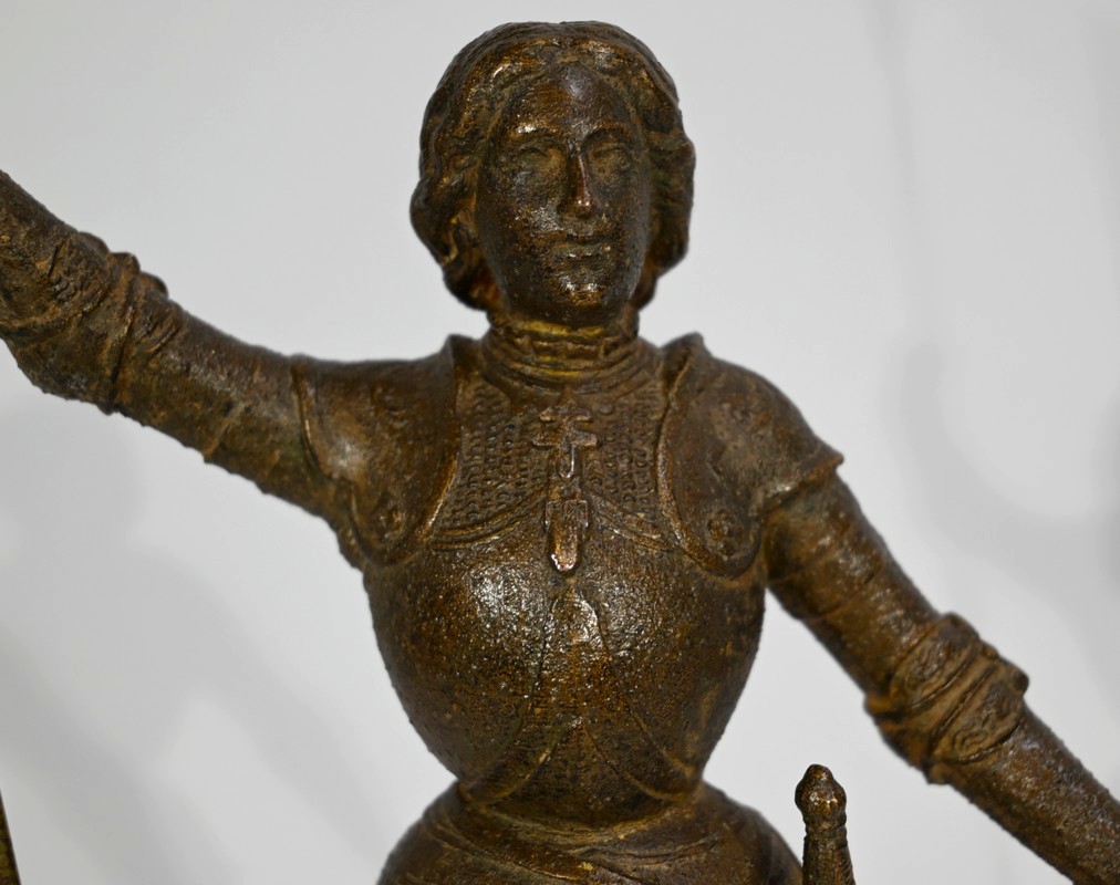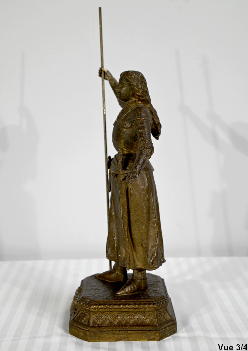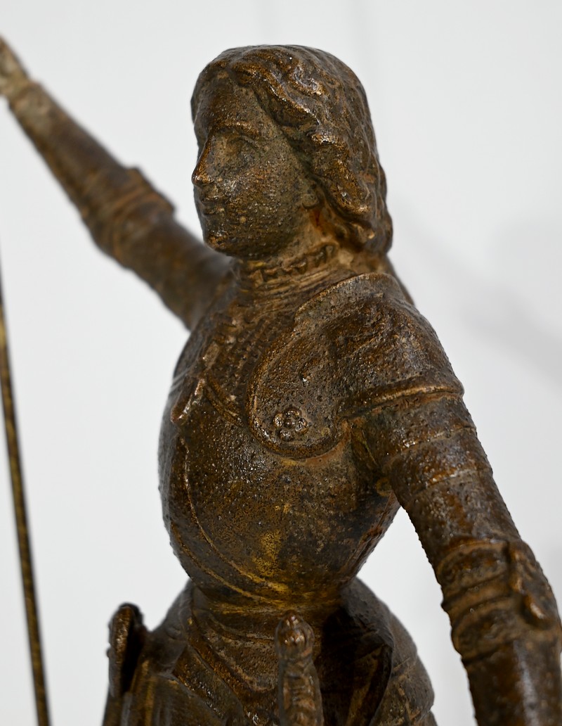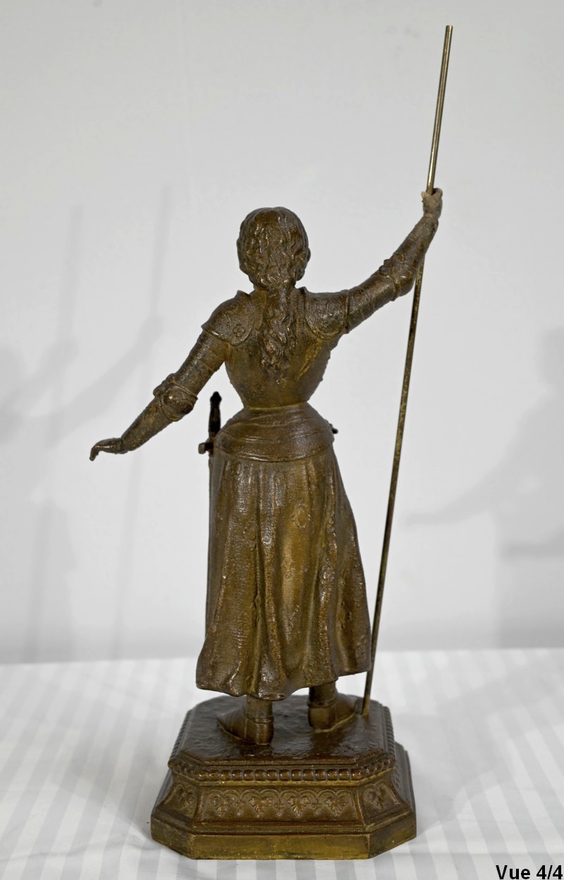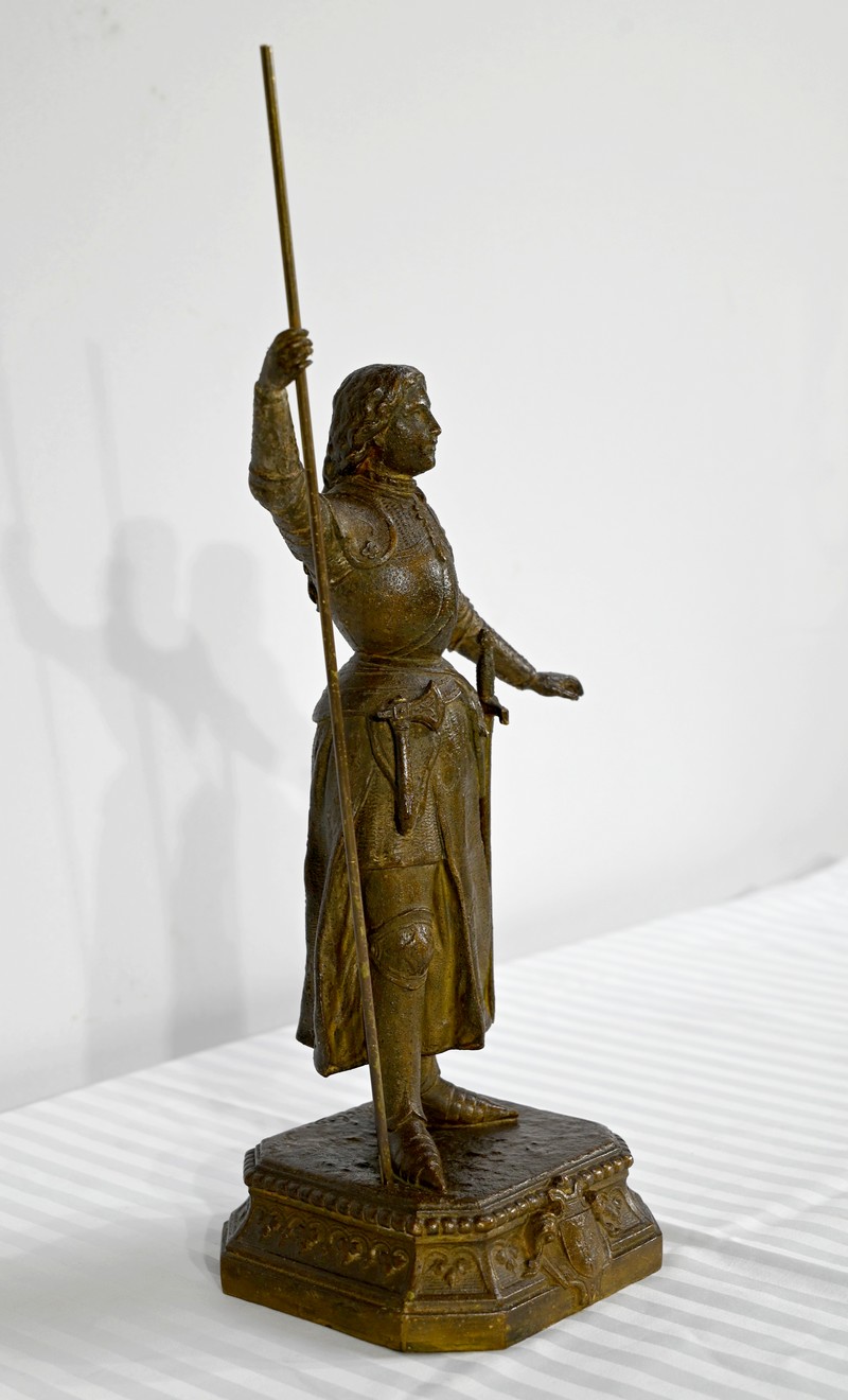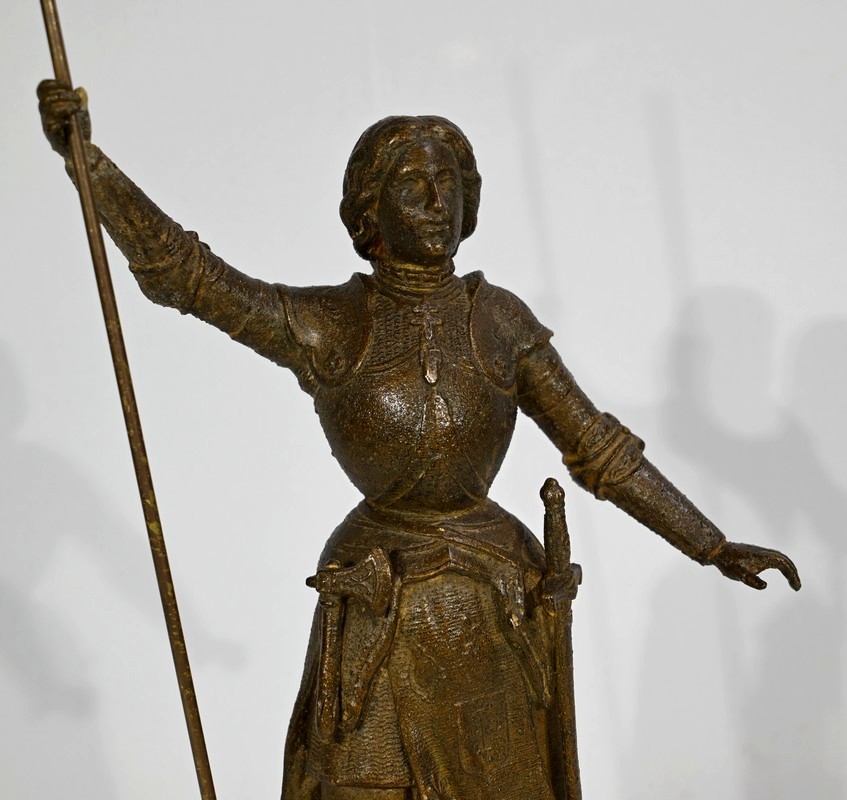 Régule à patine brune figurant Jeanne d’Arc victorieuse, signé sur la terrasse A.Foulon Enfant. La pucelle d’Orléans, comme se plaisaient à l’appeler les Anglais, se tient droite, vêtue d’une longue jupe portant ses armoiries, d’une armure complète et chaussée de solerets.