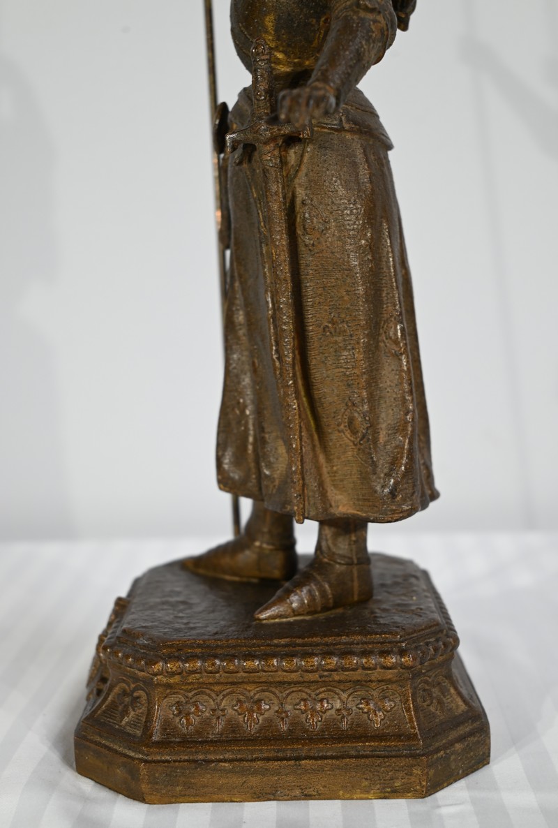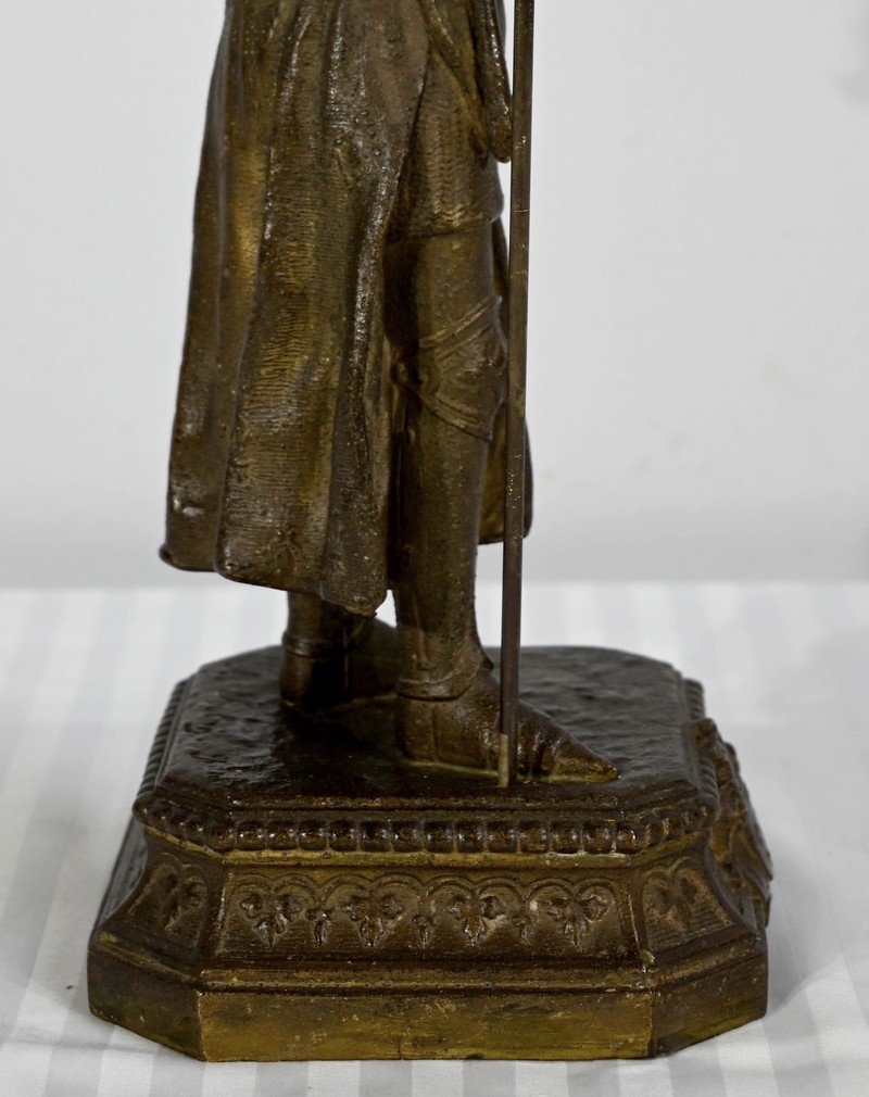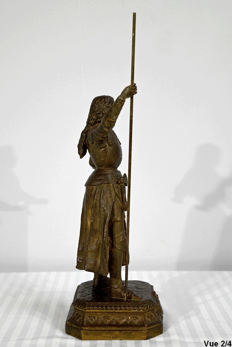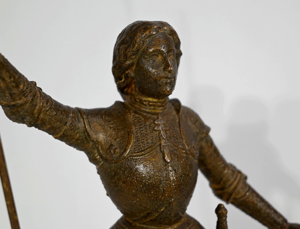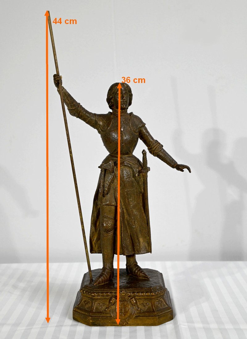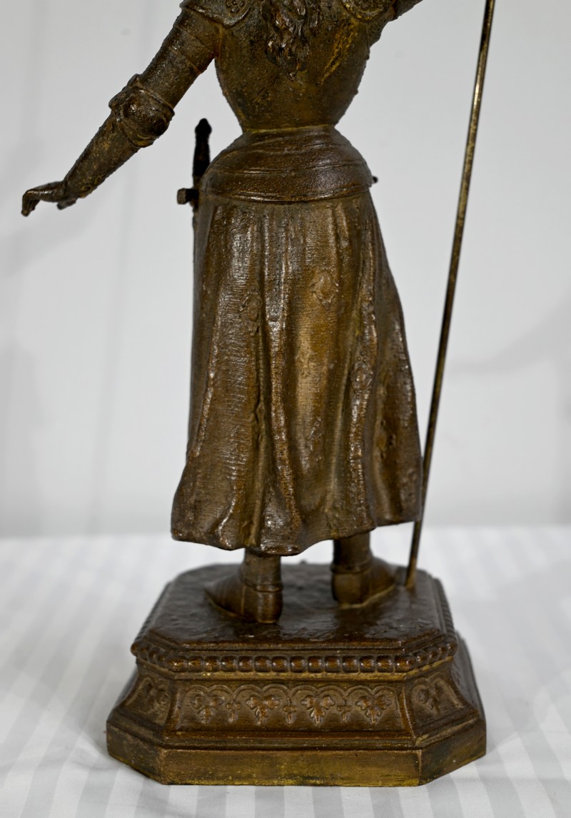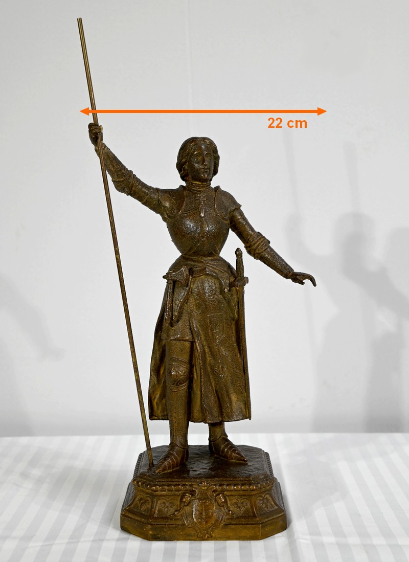 Régule à patine brune figurant Jeanne d’Arc victorieuse, signé sur la terrasse A.Foulon Enfant. La pucelle d’Orléans, comme se plaisaient à l’appeler les Anglais, se tient droite, vêtue d’une longue jupe portant ses armoiries, d’une armure complète et chaussée de solerets.
