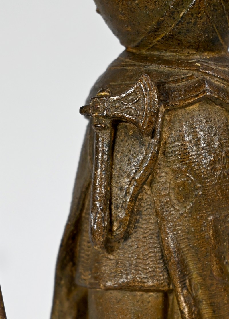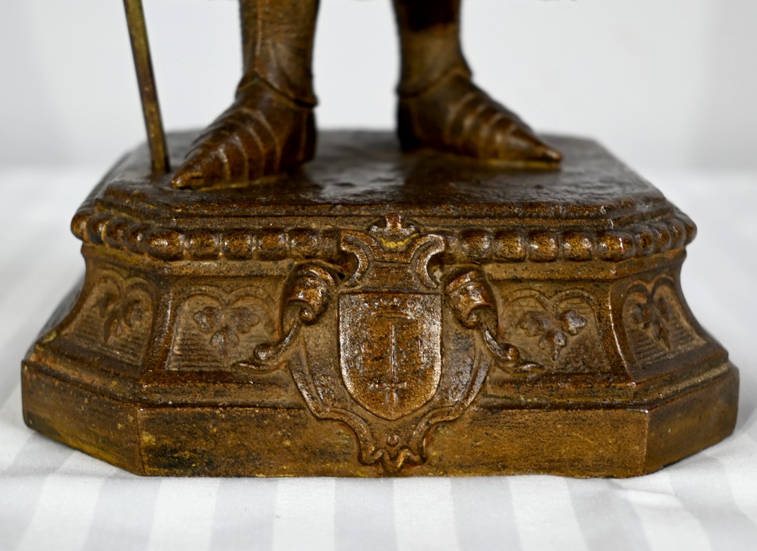 Ce sujet repose sur un socle carré perlé et décoré du blason de celle qui sera condamnée au bûcher pour hérésie en 1431.