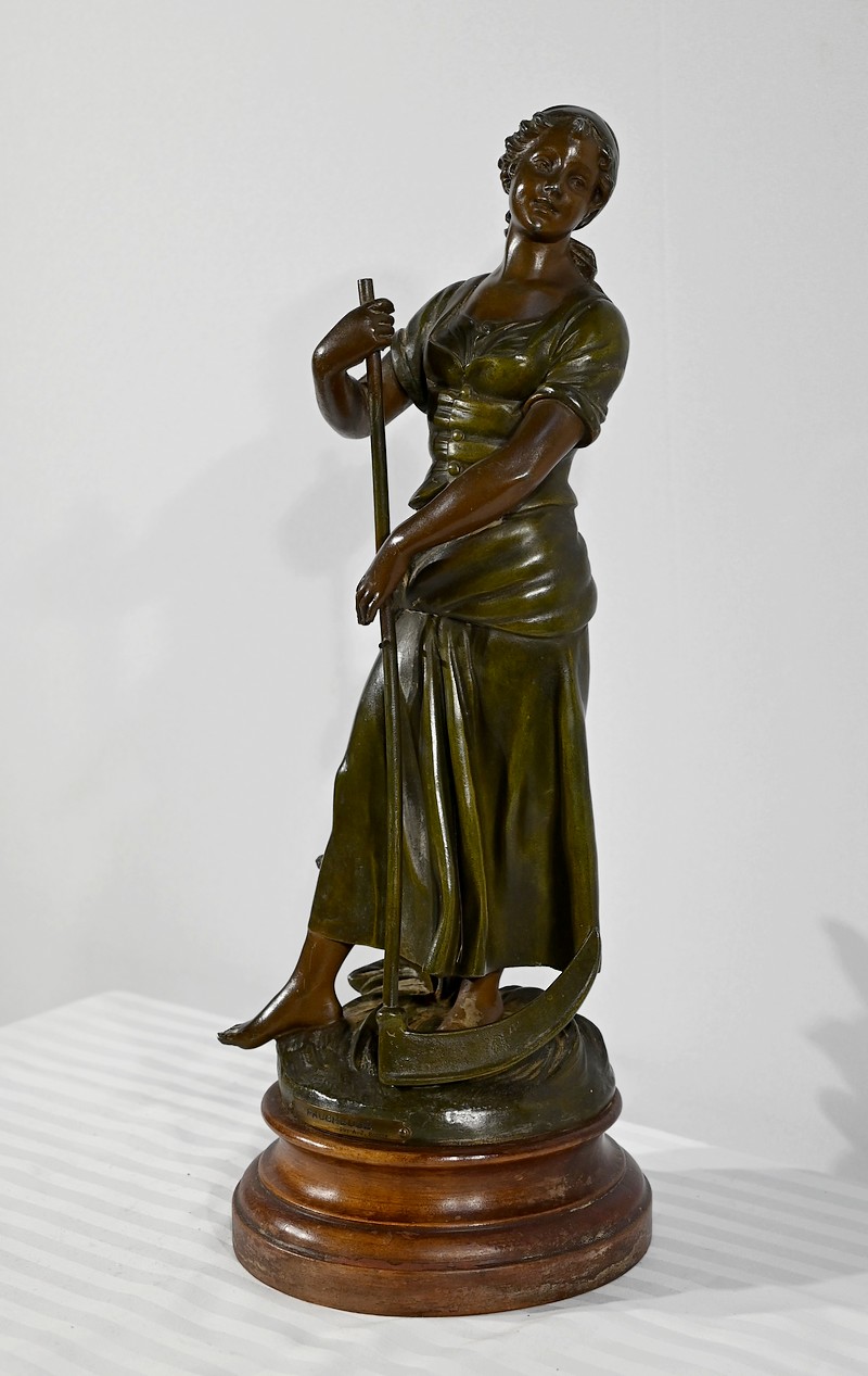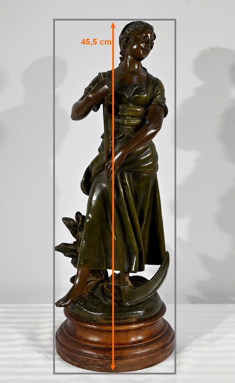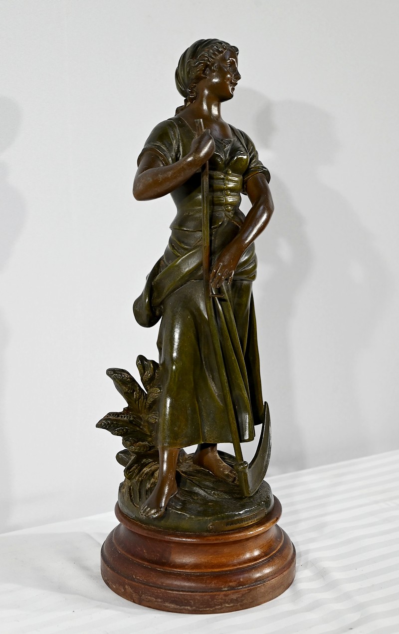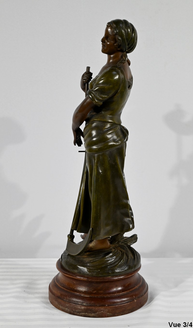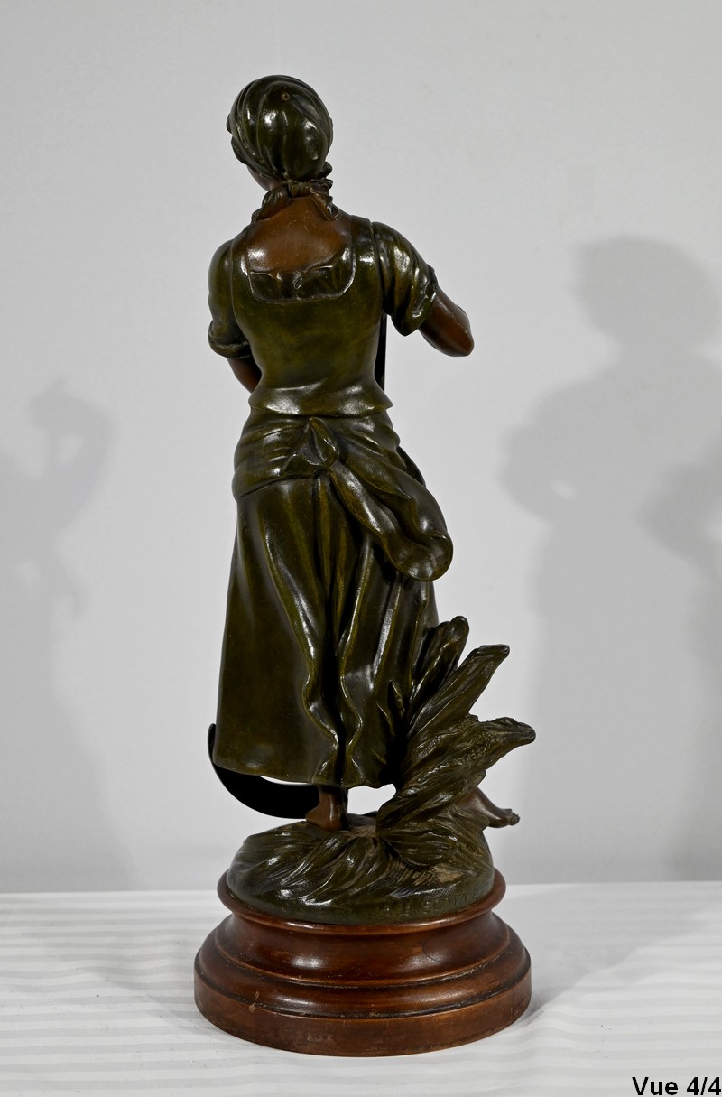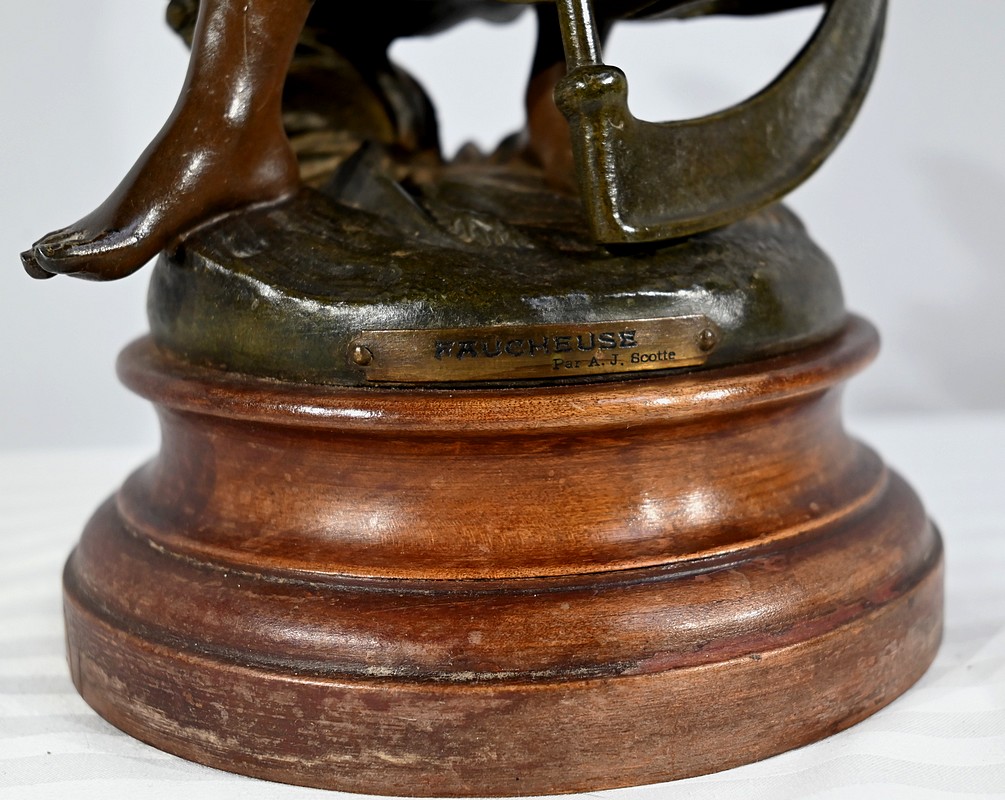 Régule à patine verte et brune, intitulé « Faucheuse », titré et signé sur la terrasse par le sculpteur français A-J Scotte (1867-1925).