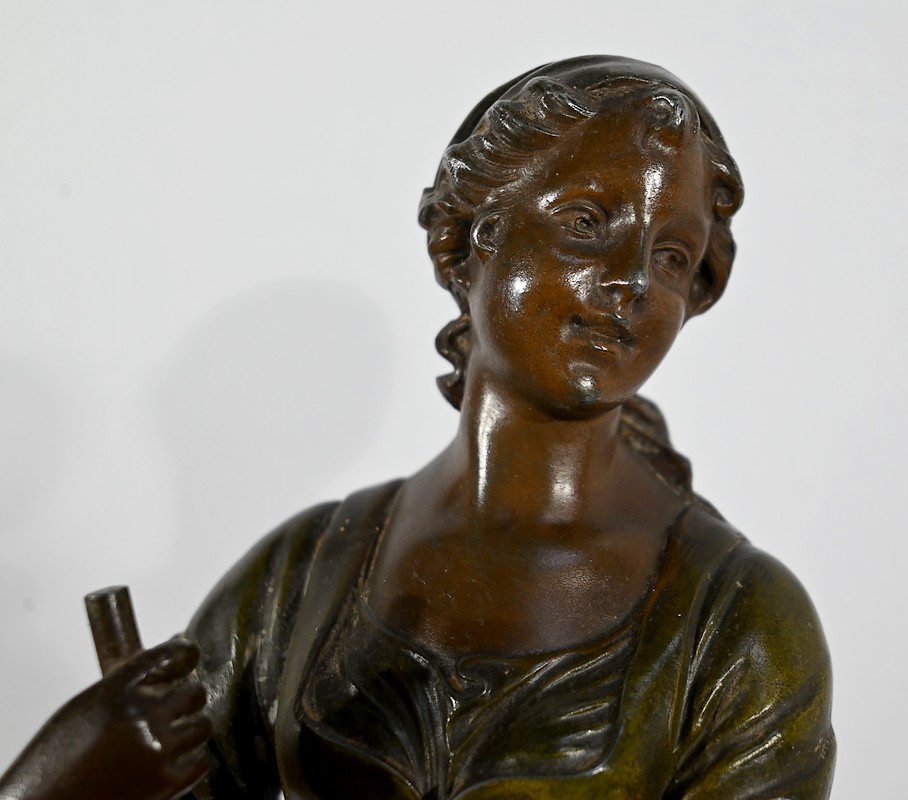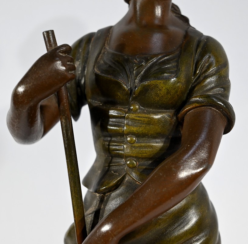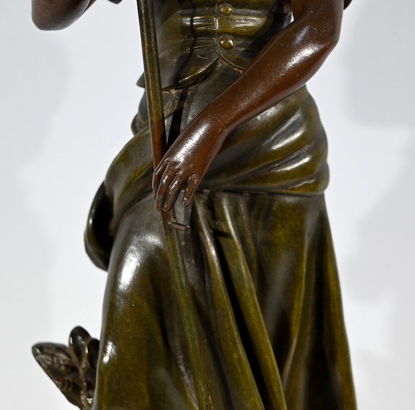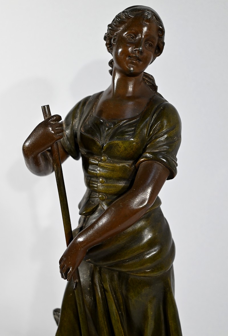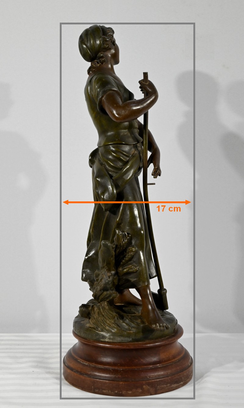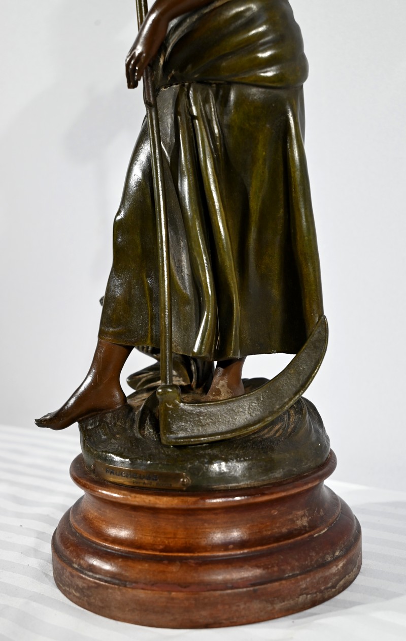 Régule à patine verte et brune, intitulé « Faucheuse », titré et signé sur la terrasse par le sculpteur français A-J Scotte (1867-1925).