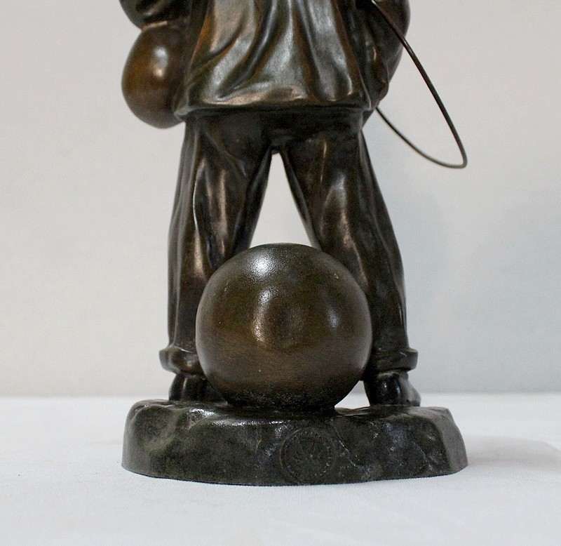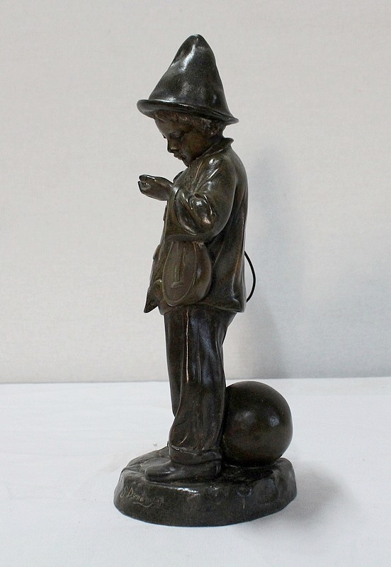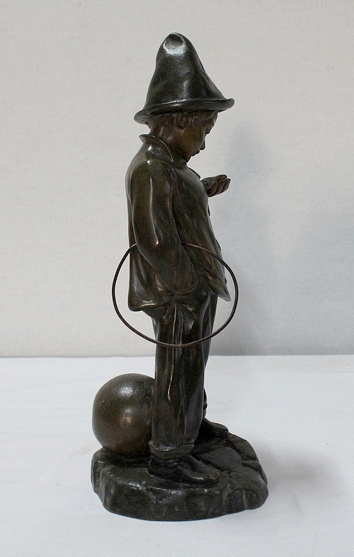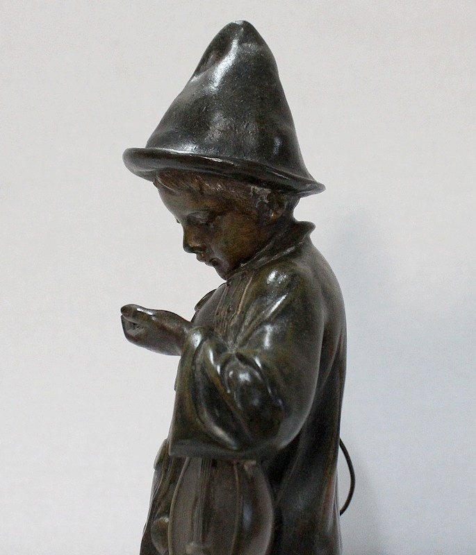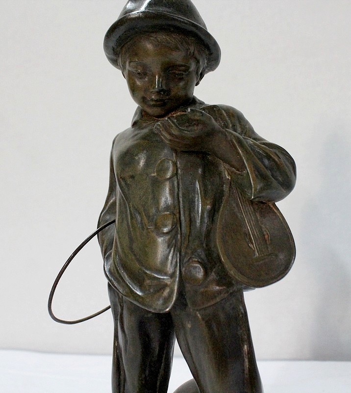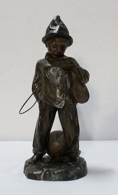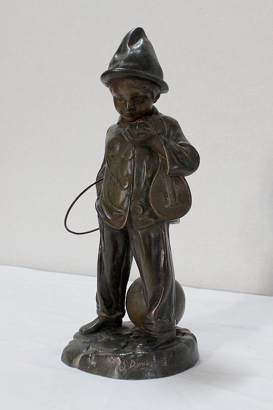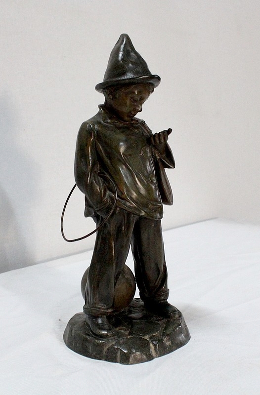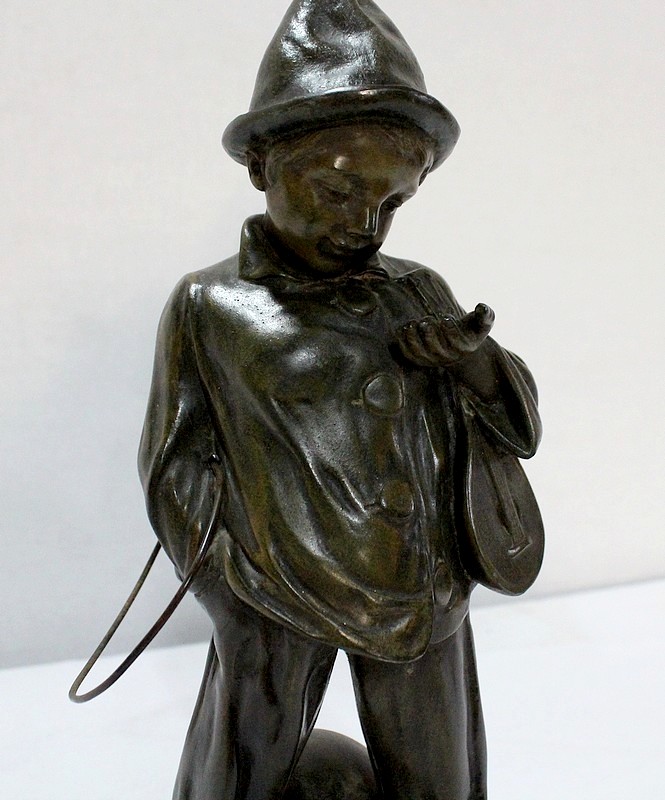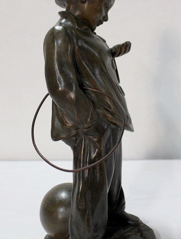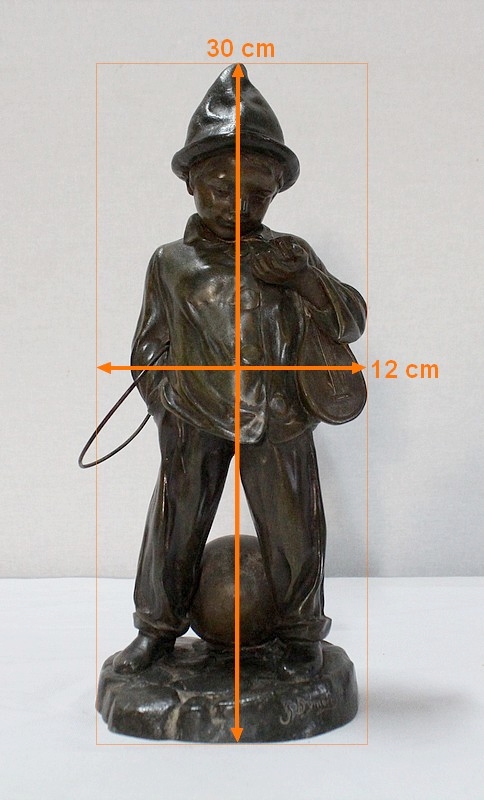 Sculpture en Régule à patine verte signée Georges Demange (1865-1945) représentant un enfant comptant des pièces de monnaie qu’il tient dans la paume de sa main gauche. Vêtu d’un bonnet et de vêtements larges, l’enfant joufflu au visage doux, se tient droit, une mandoline sous le bras gauche et un cerceau sous le bras droit. Derrière lui, un ballon vient s’ajouter à ses accessoires de spectacle.