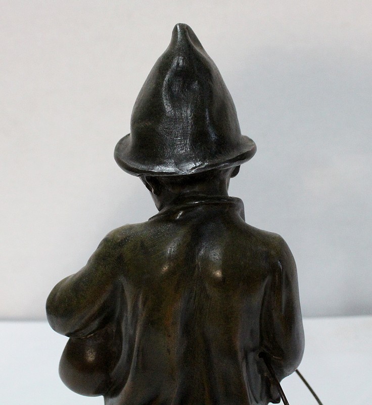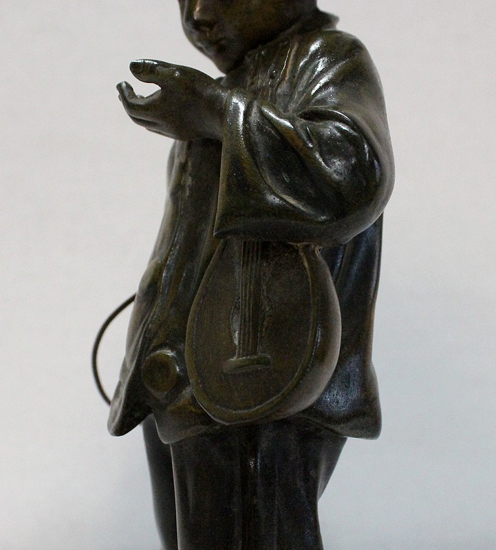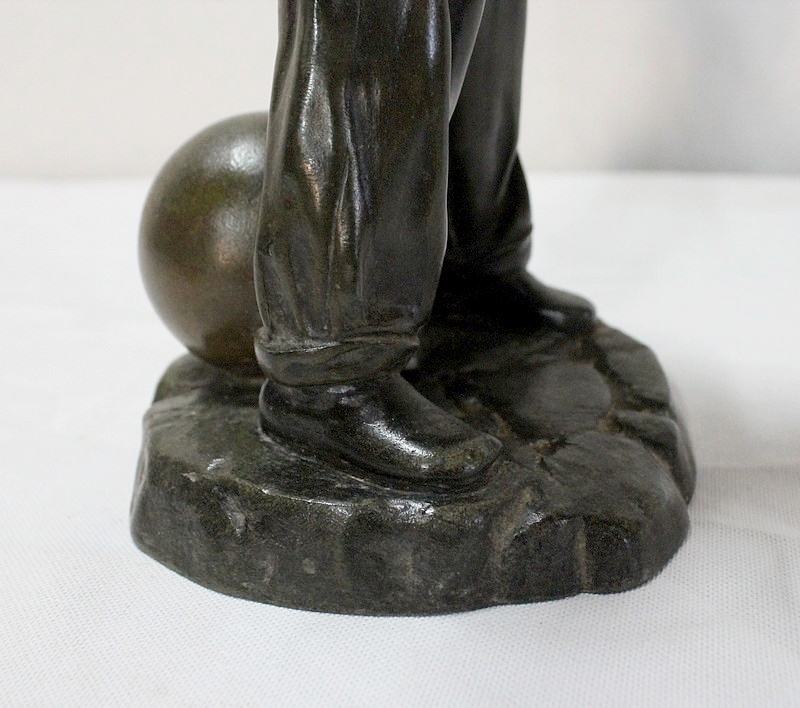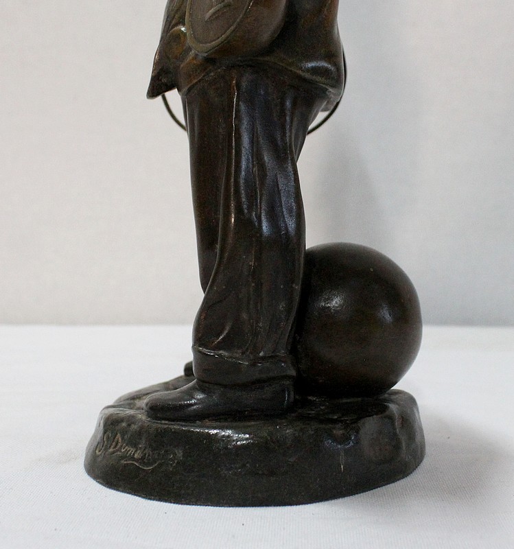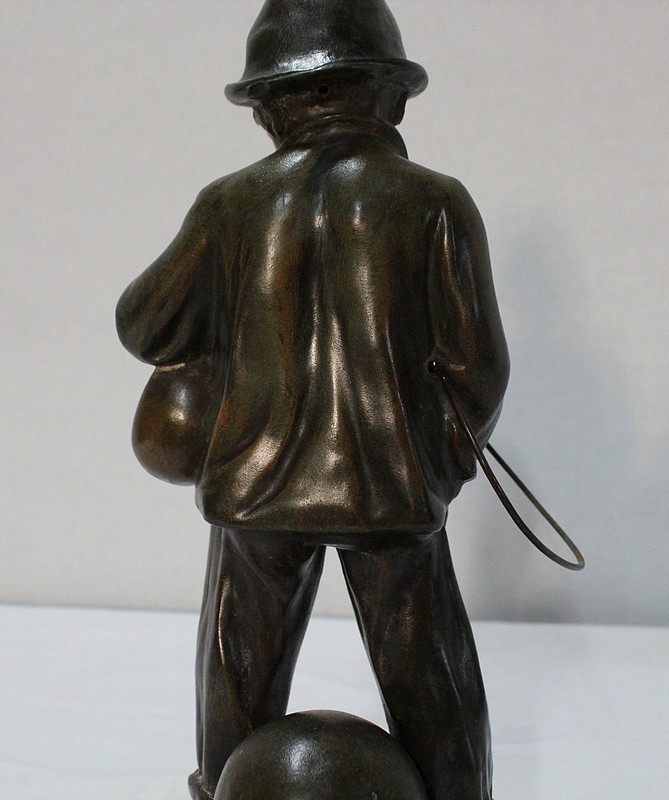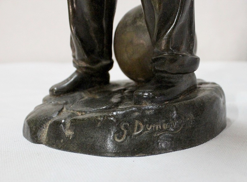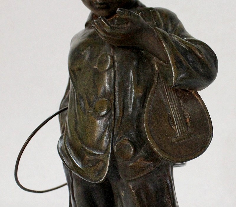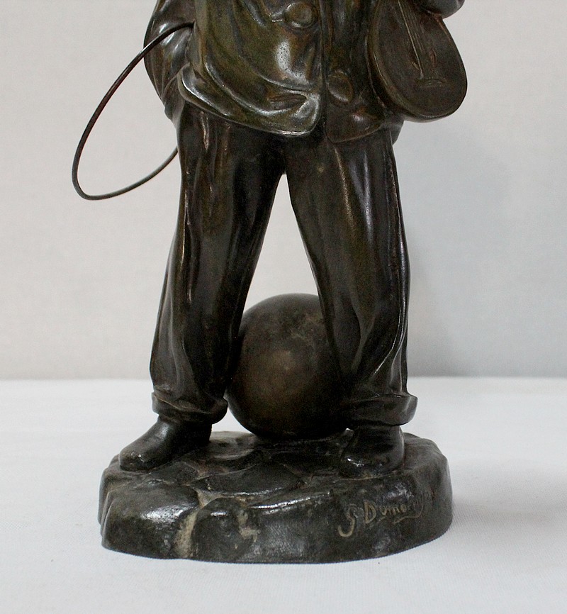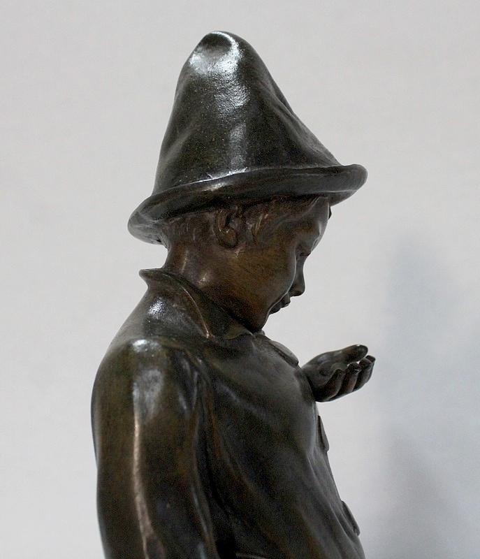 Sculpture en Régule à patine verte signée Georges Demange (1865-1945) représentant un enfant comptant des pièces de monnaie qu’il tient dans la paume de sa main gauche. Vêtu d’un bonnet et de vêtements larges, l’enfant joufflu au visage doux, se tient droit, une mandoline sous le bras gauche et un cerceau sous le bras droit. Derrière lui, un ballon vient s’ajouter à ses accessoires de spectacle.