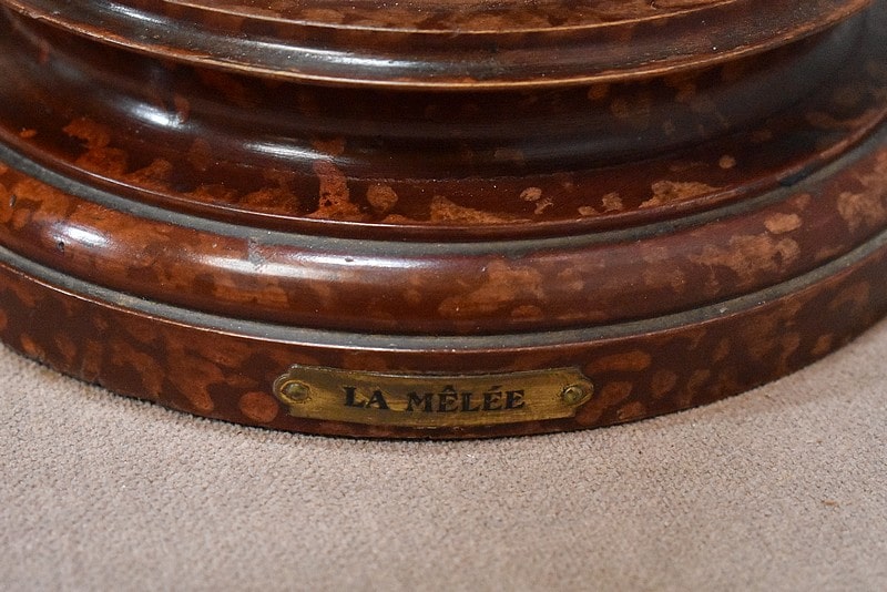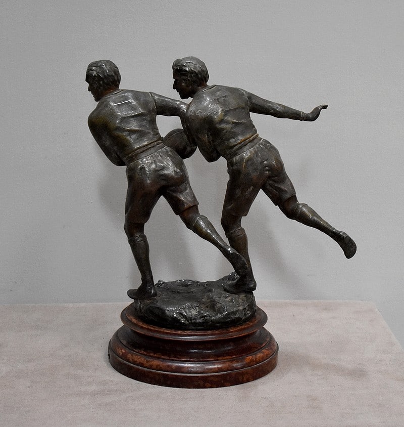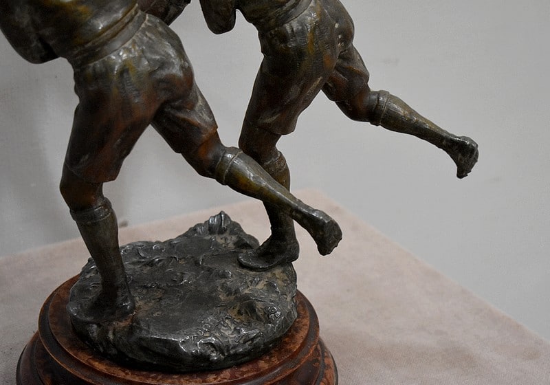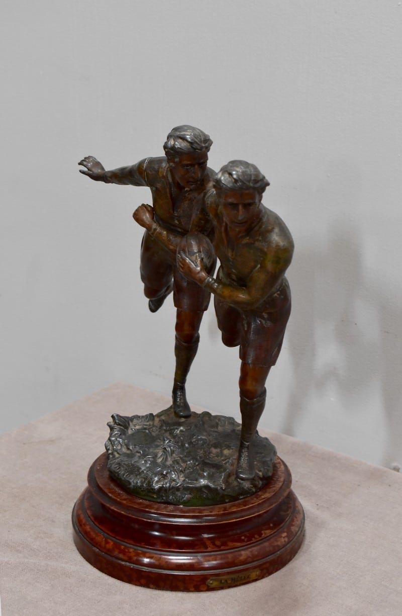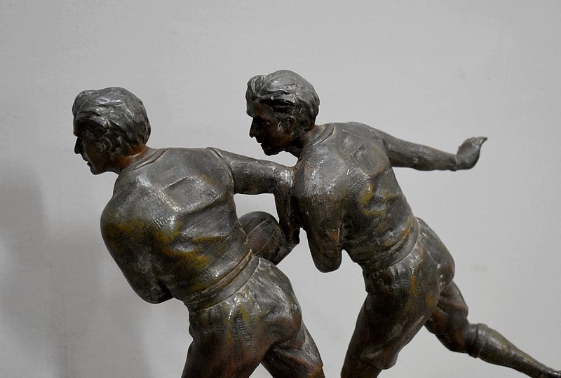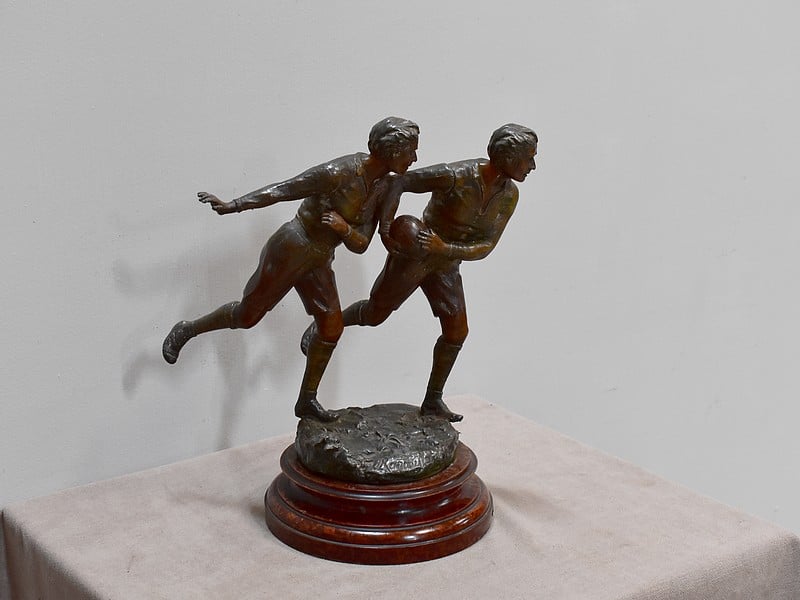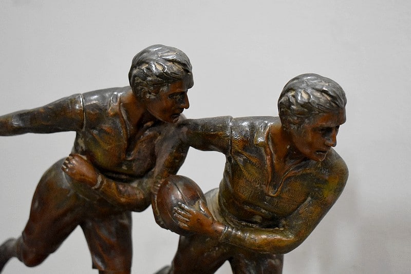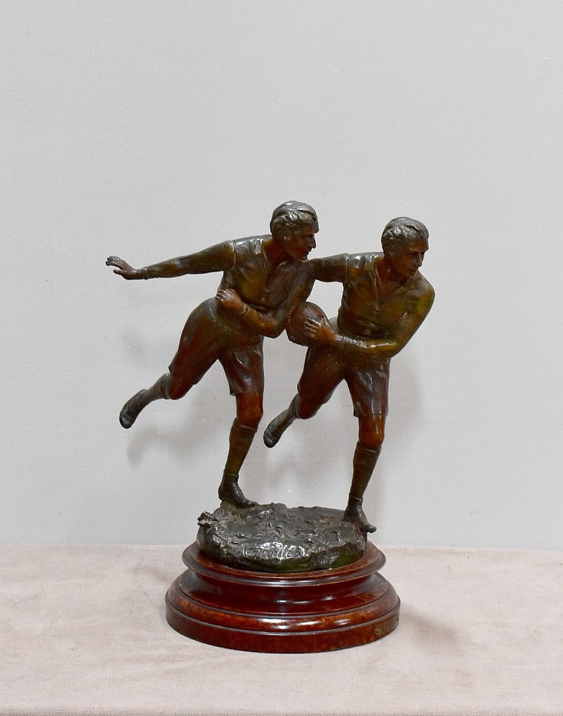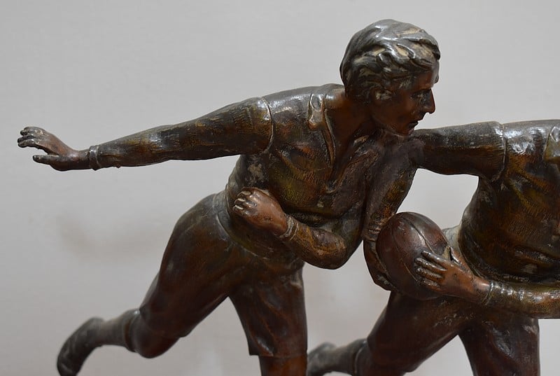 Régule représentant deux joueurs de rugby courant, l’un deux portant un ballon, intitulée ‘La Mêlée’.