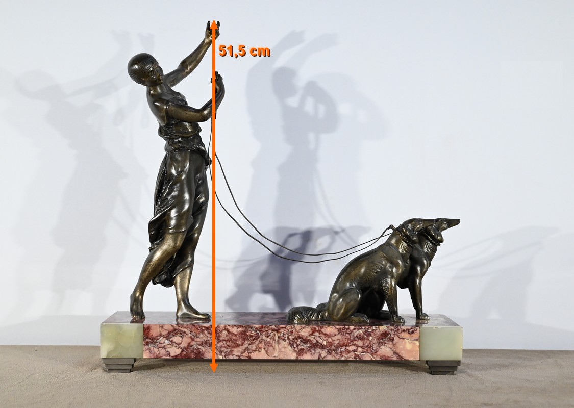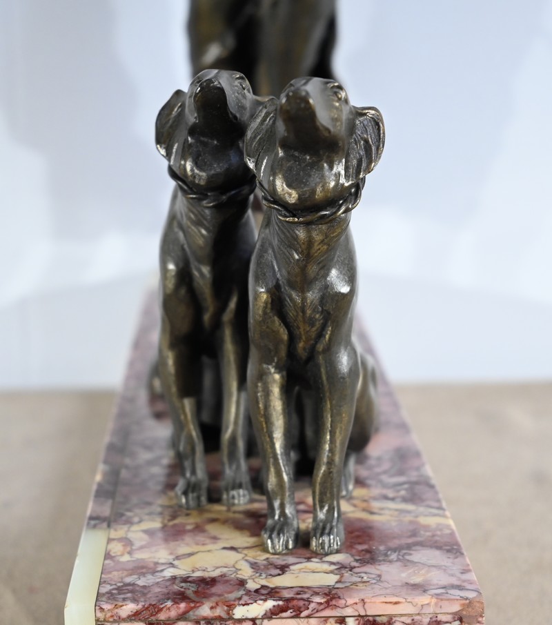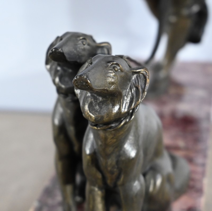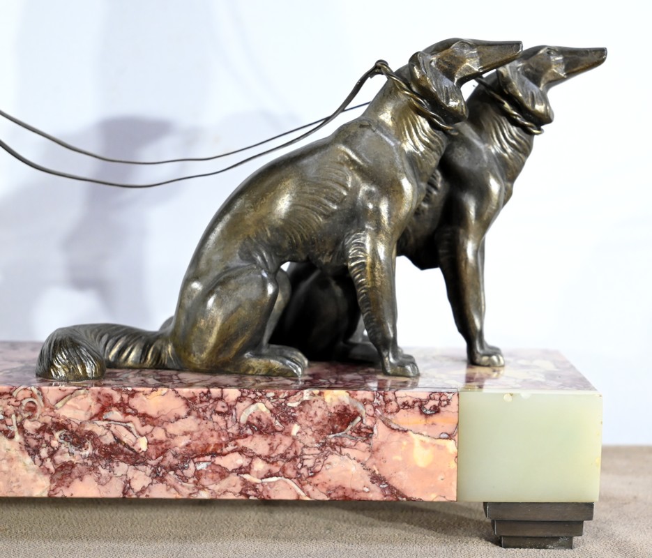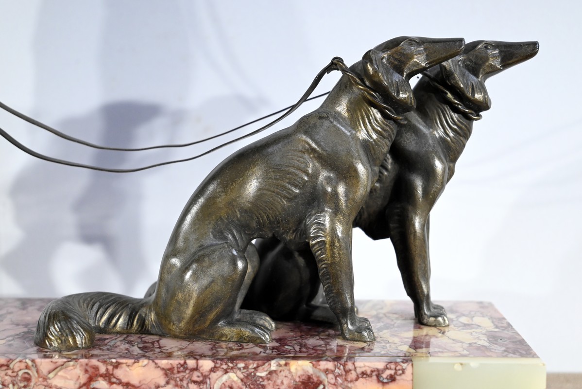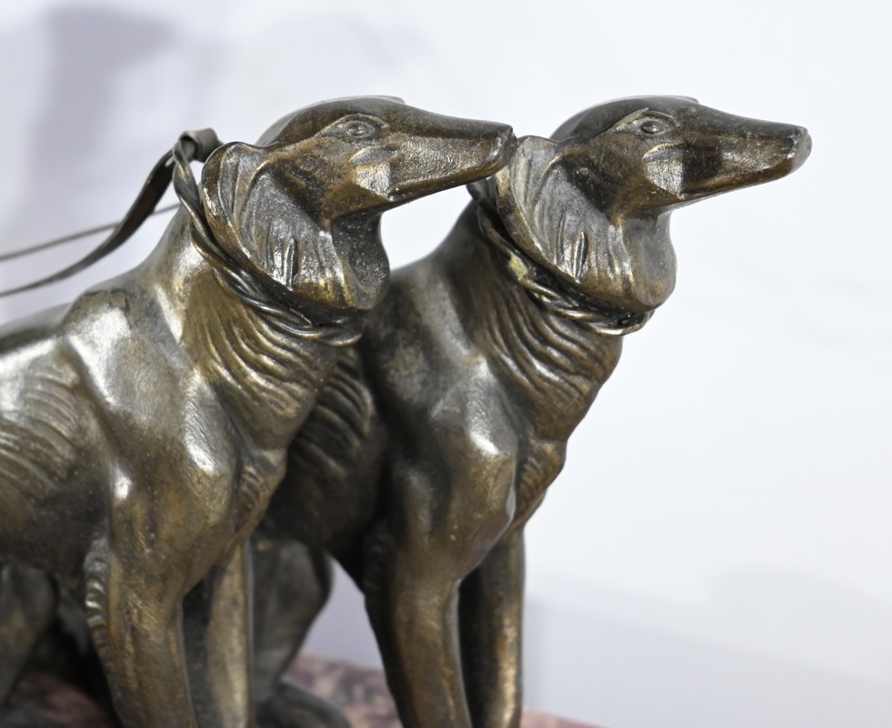 Sujet en régule figurant une dame promenant ses deux lévriers.