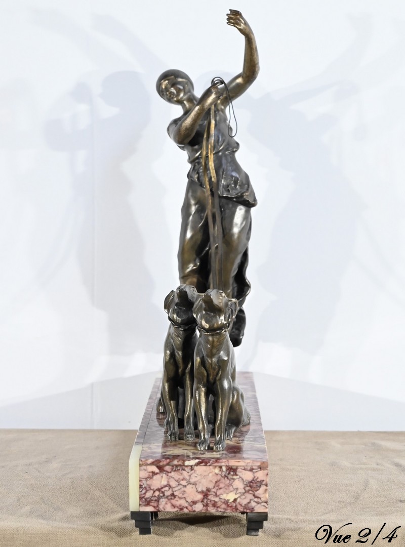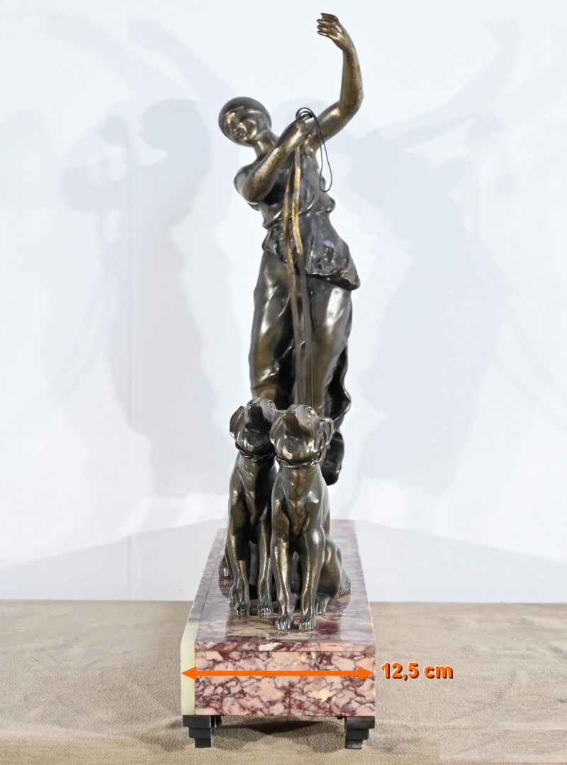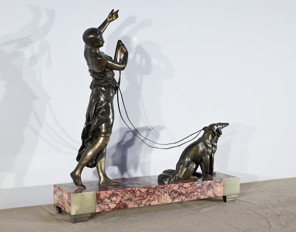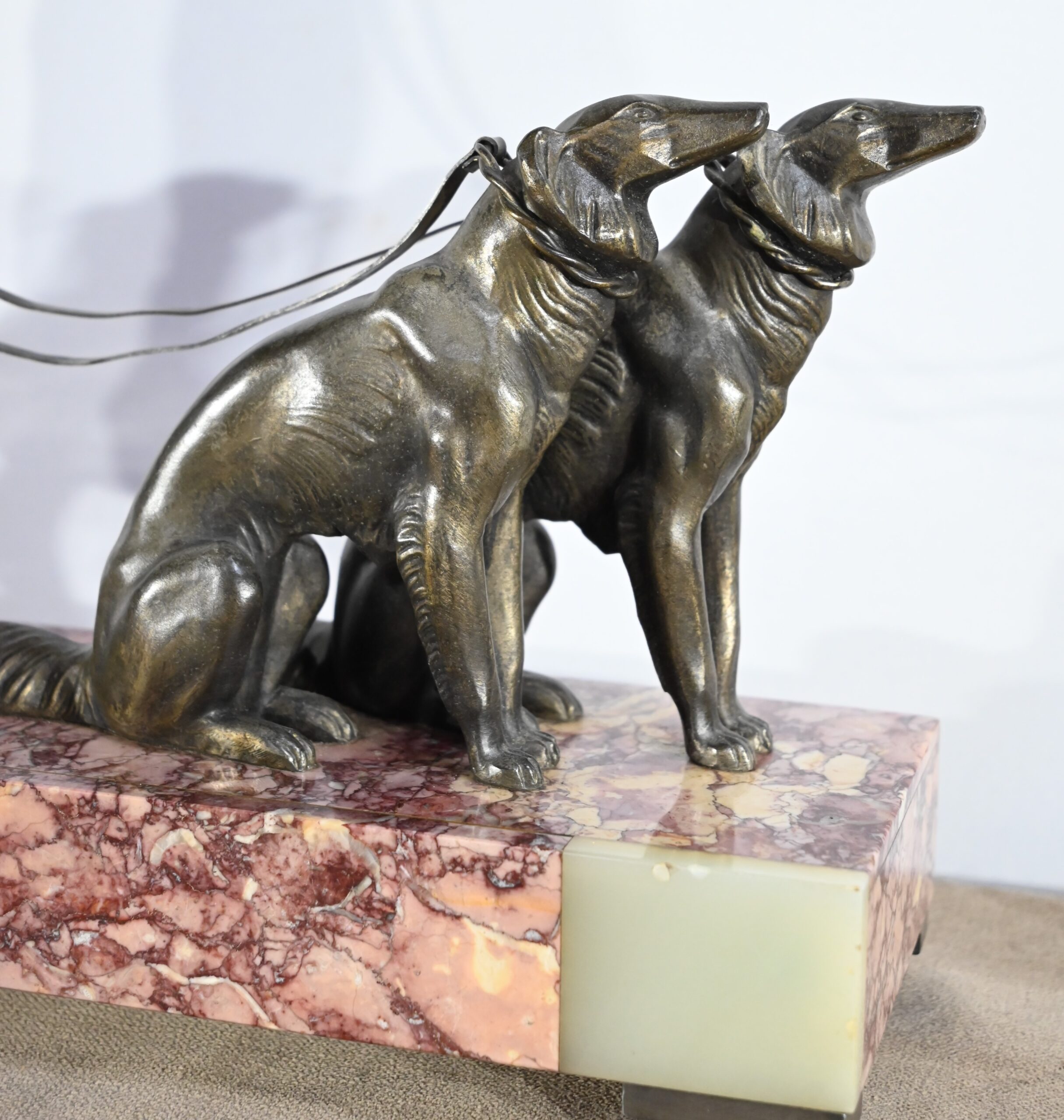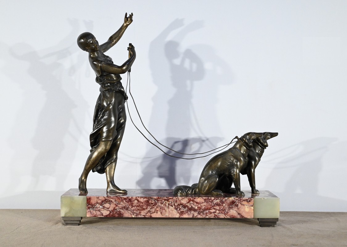 Sujet en régule figurant une dame promenant ses deux lévriers.