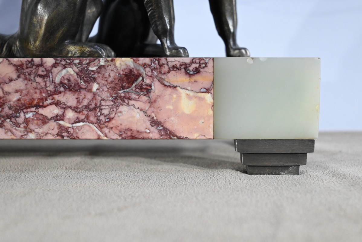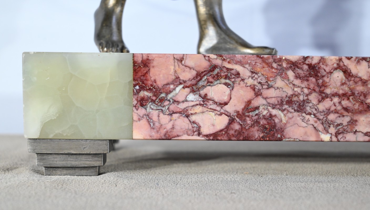 Ces éléments reposent sur une base en marbre, intitulé « Brèche Arlequino », souligné en façade par de l’onyx blanc et à l’arrière d’une partie en marbre jaune Lamartine.