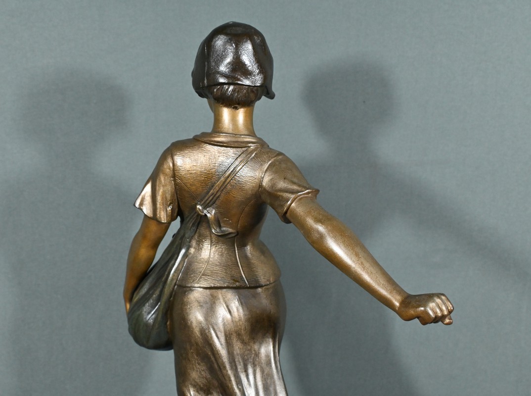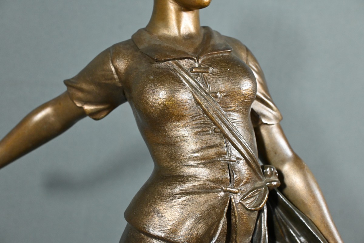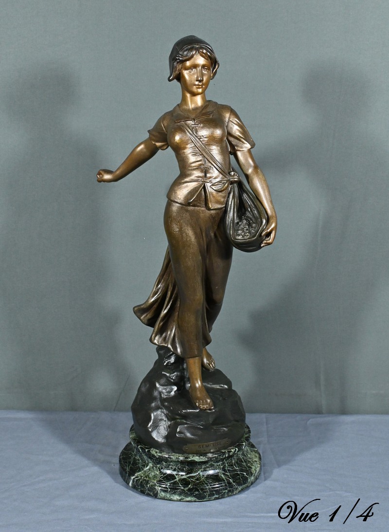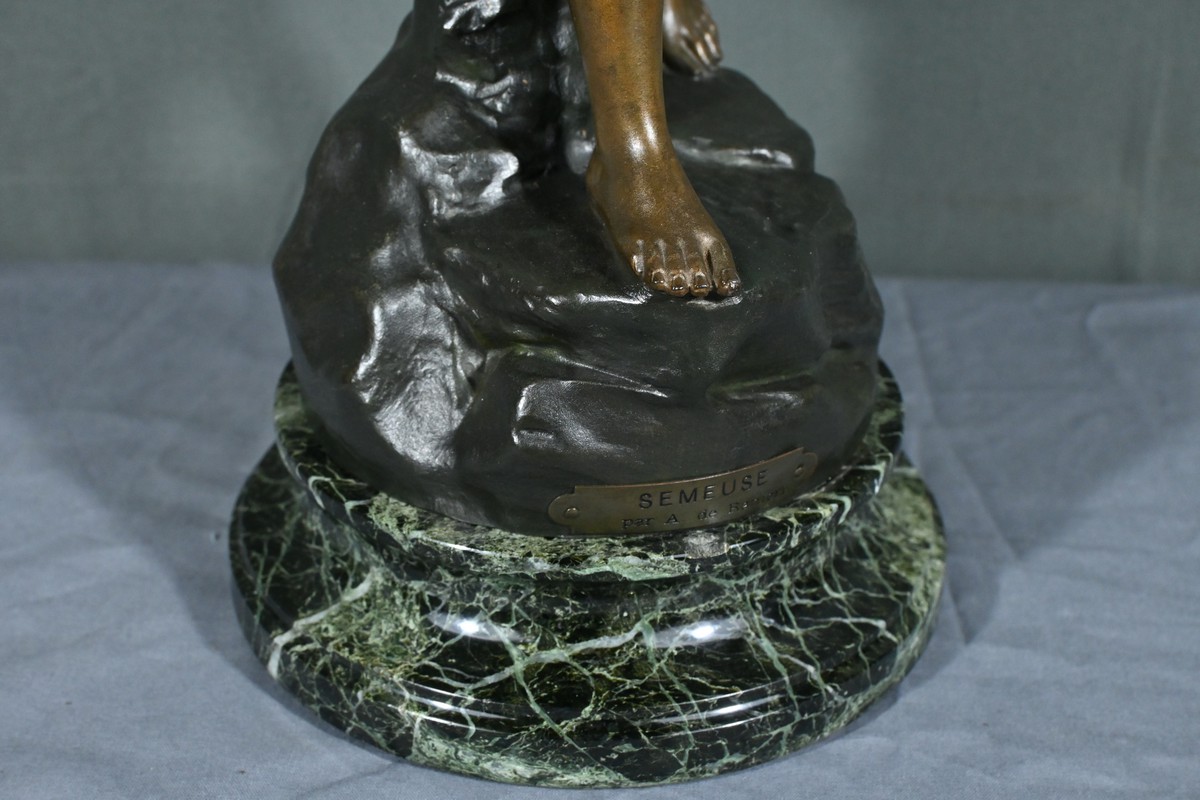 Cette élégante sculpture en régule, réalisée par le sculpteur italien Aristide De Ranieri (1865-1954), représente « Semeuse », une figure allégorique pleine de grâce et de poésie.