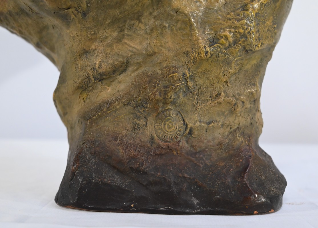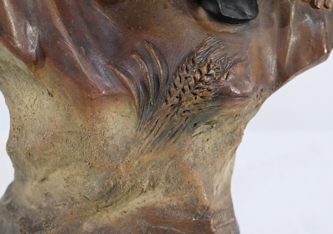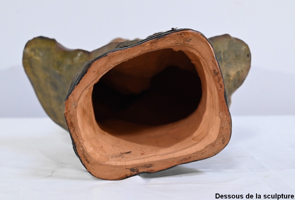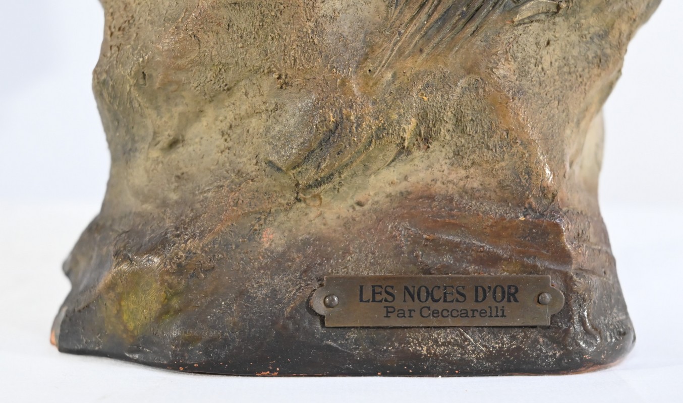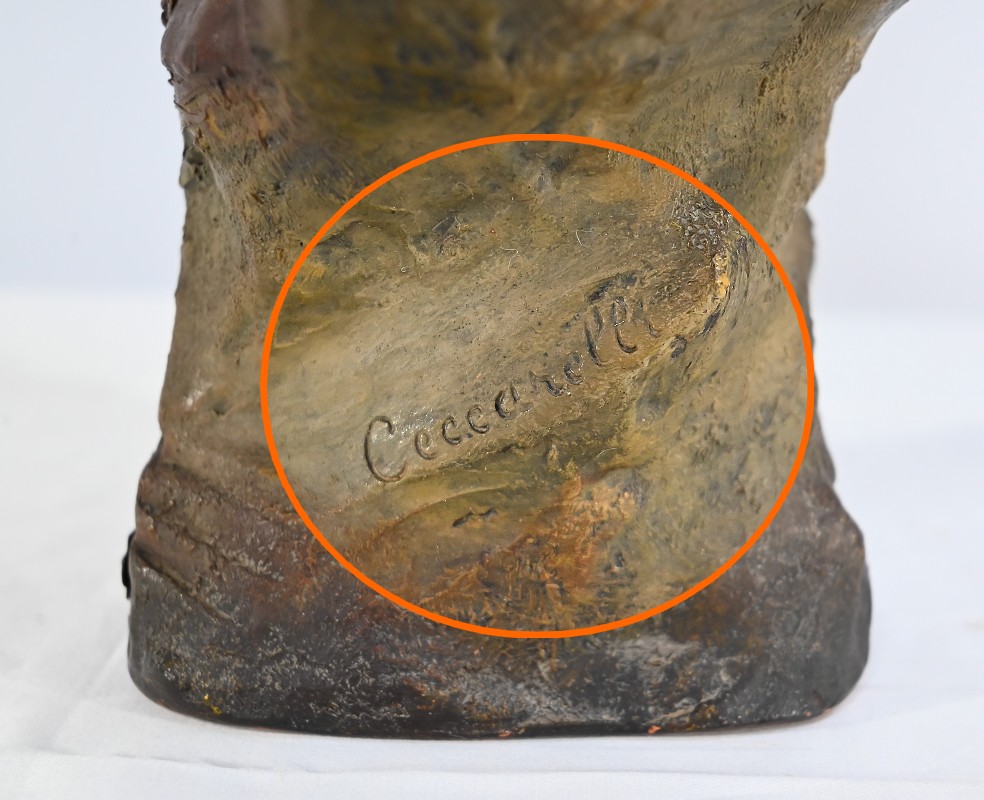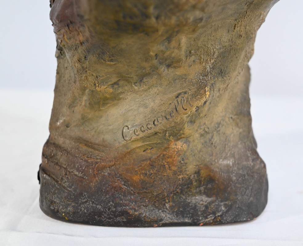Sculpture polychrome en terre cuite, signée Ezio Ceccarelli (1865-1927). Ce sculpteur italien, président de l’académie des beaux arts de florence, est connu pour son travail, de nombreuses fois récompensé, représentant des figures humaines réalistes et expressives.