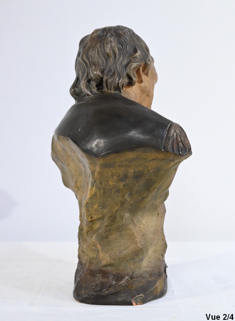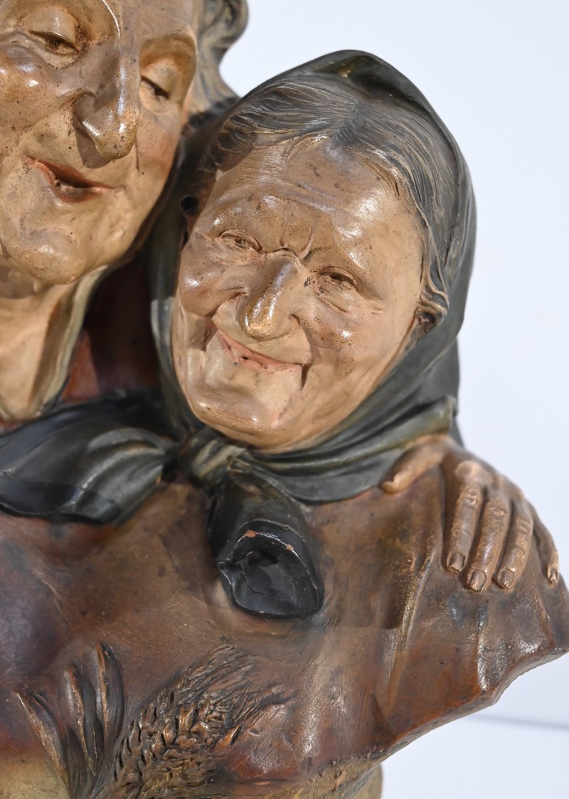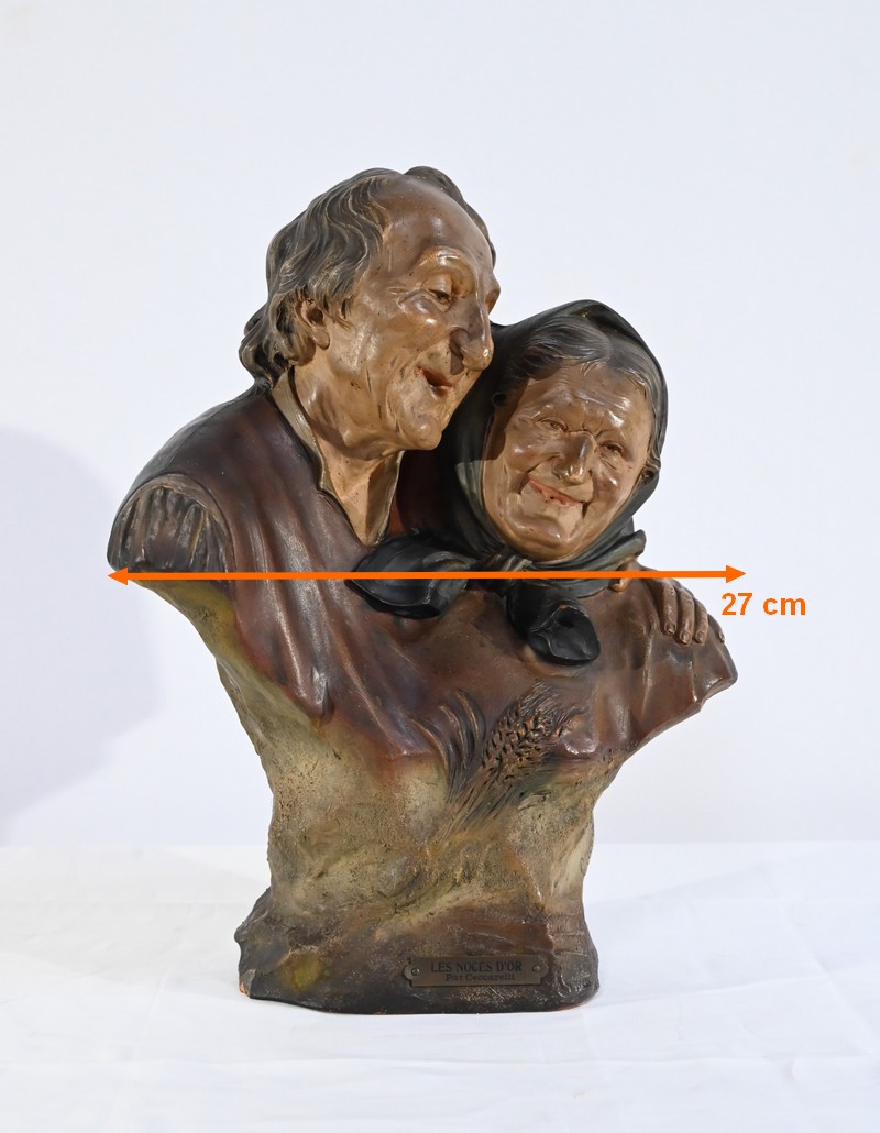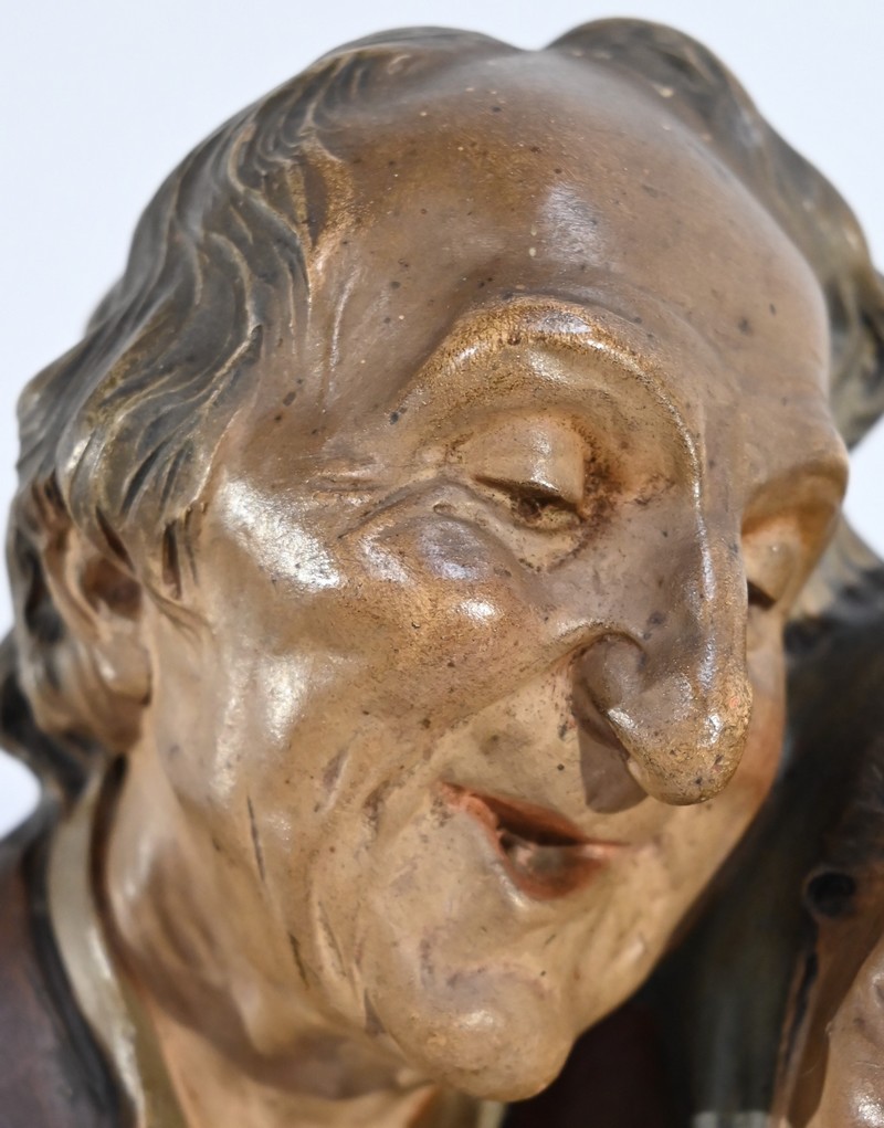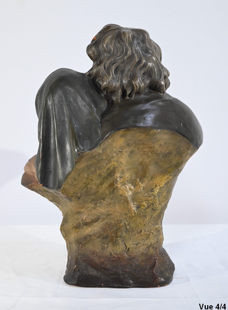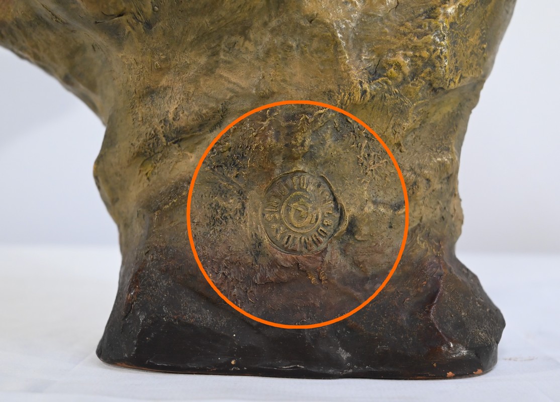Sculpture polychrome en terre cuite, signée Ezio Ceccarelli (1865-1927). Ce sculpteur italien, président de l’académie des beaux arts de florence, est connu pour son travail, de nombreuses fois récompensé, représentant des figures humaines réalistes et expressives.