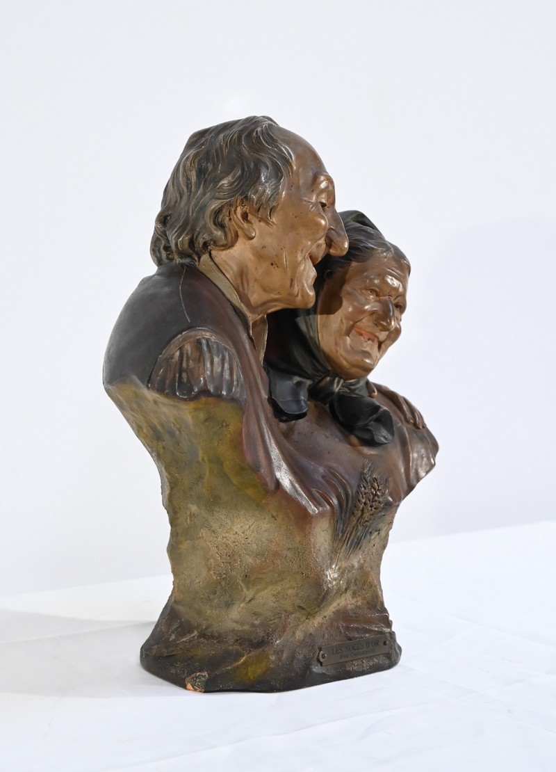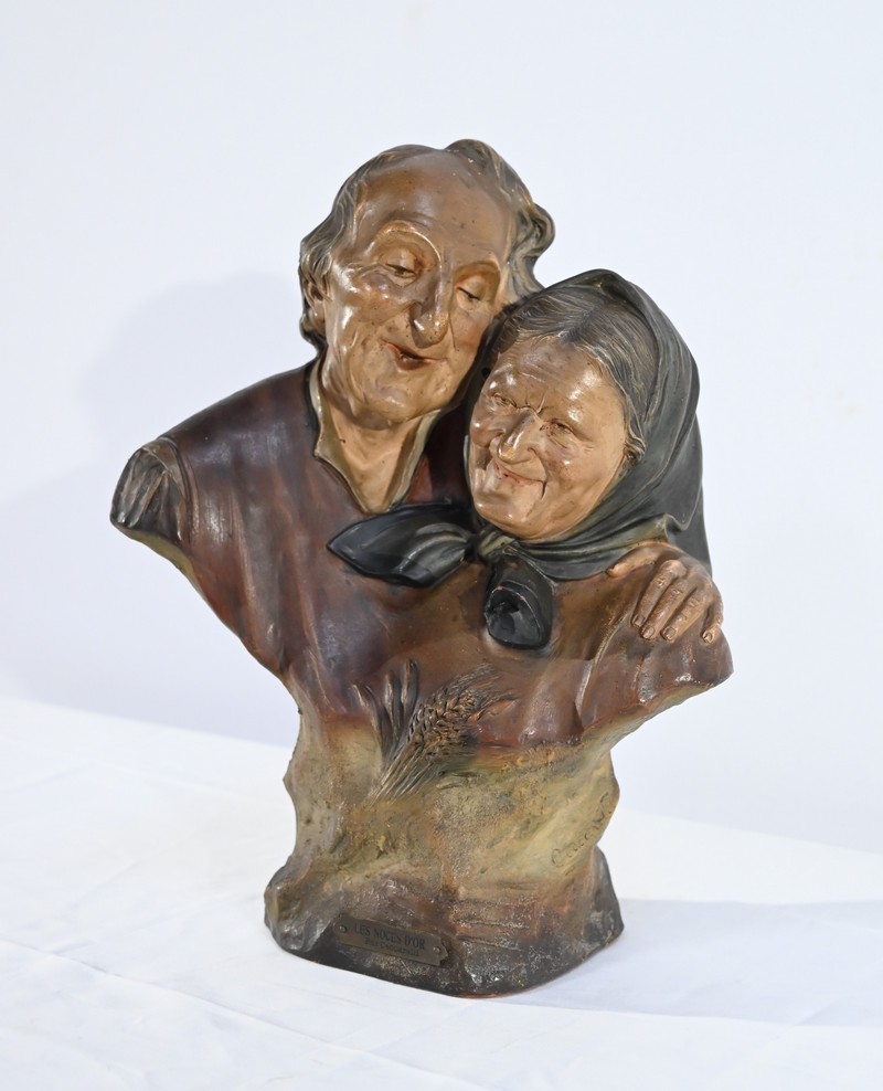 Cette œuvre, titrée « Les Noces D’or » et éditée par « Fontaine & Durieux Paris », figure un couple aux traits ridés s’enlaçant tendrement. L’homme pose sa main sur l’épaule de son épouse. Les deux amants affichent un léger sourire et une certaine béatitude. Ces 50 ans d’amour, de joie, de plaisirs, mais également d’inquiétude, de colères ou de disputes n’auront pas eu raison de l’union de cet homme et cette femme arrivés ensemble à l’aube de leur vie.