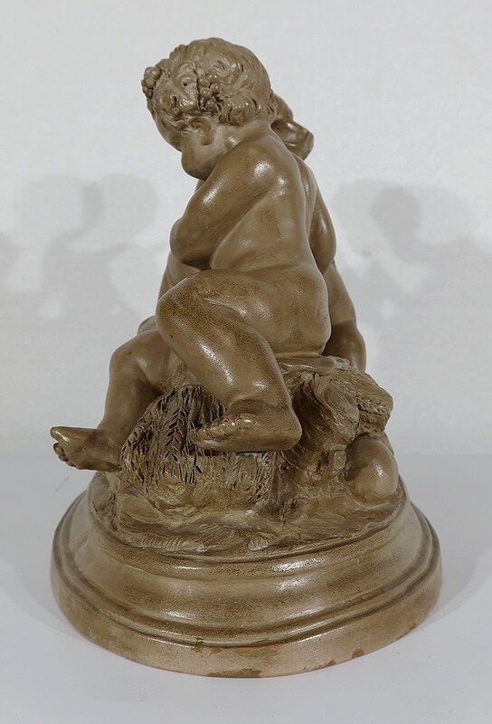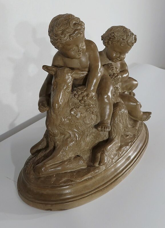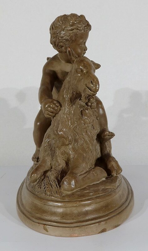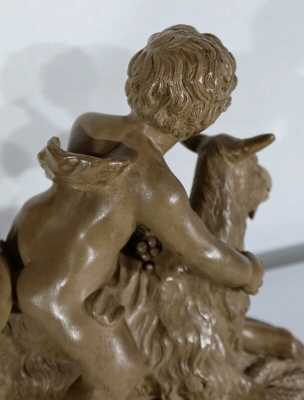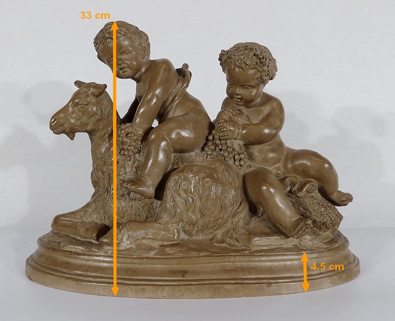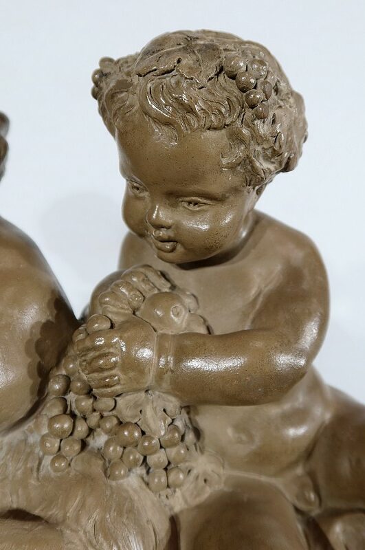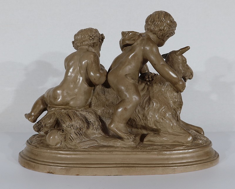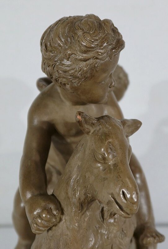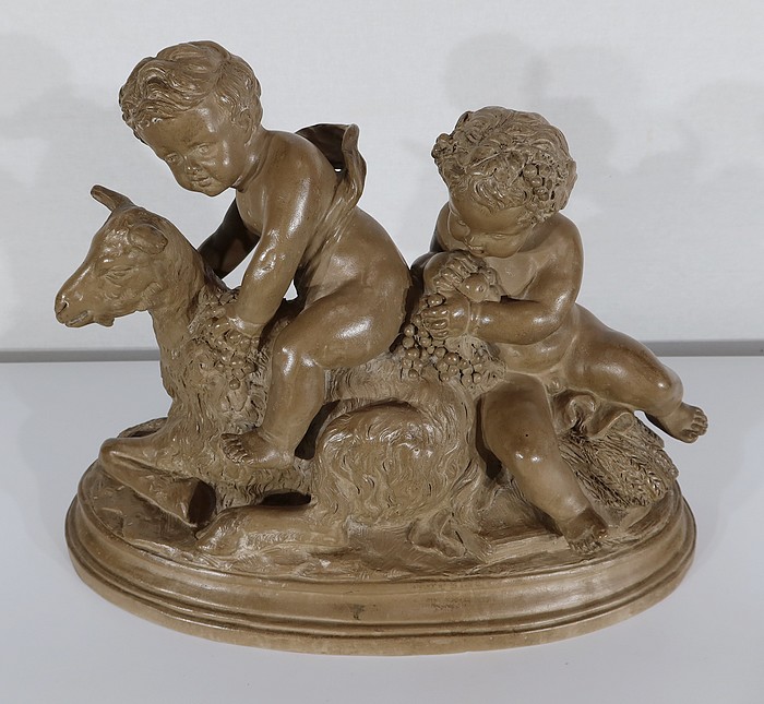 Sujet en terre cuite à patine ambrée figurant deux putti en compagnie d’une chèvre.