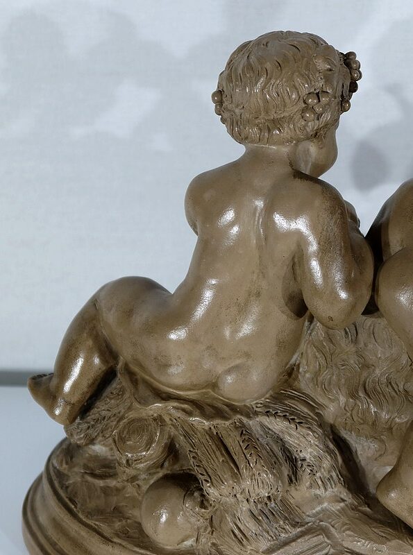 Le premier enfant est à califourchon sur l’animal, tandis que le second est installé sur une gerbe de blé. Les deux bambins aux mines rieuses et aux corps potelés sont représentés nus, pampres dans les cheveux, et grappes de raisins dans les mains.