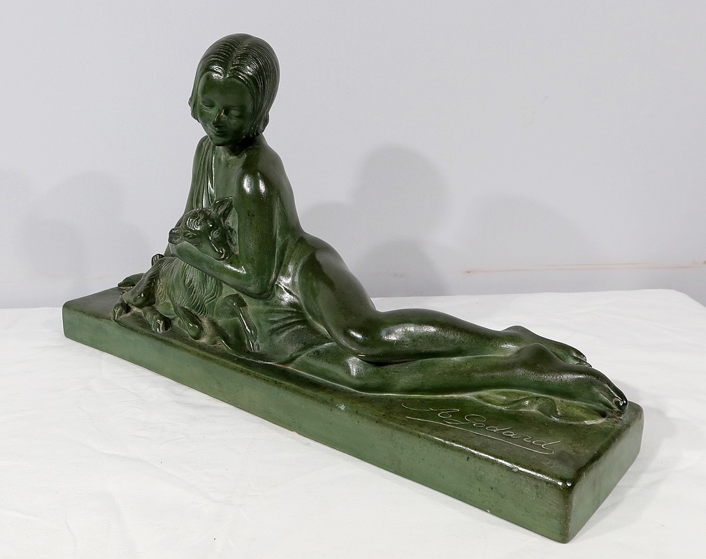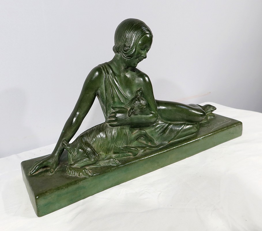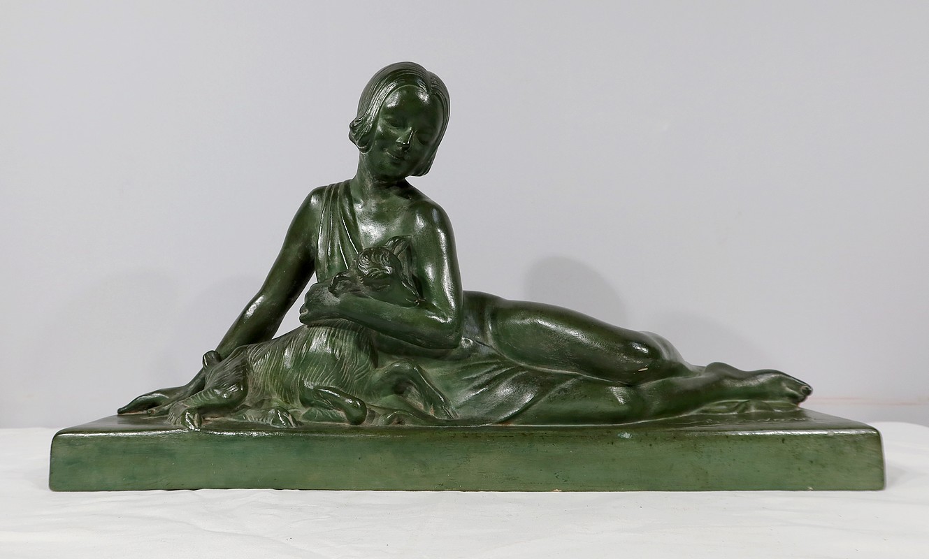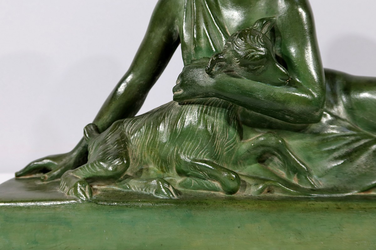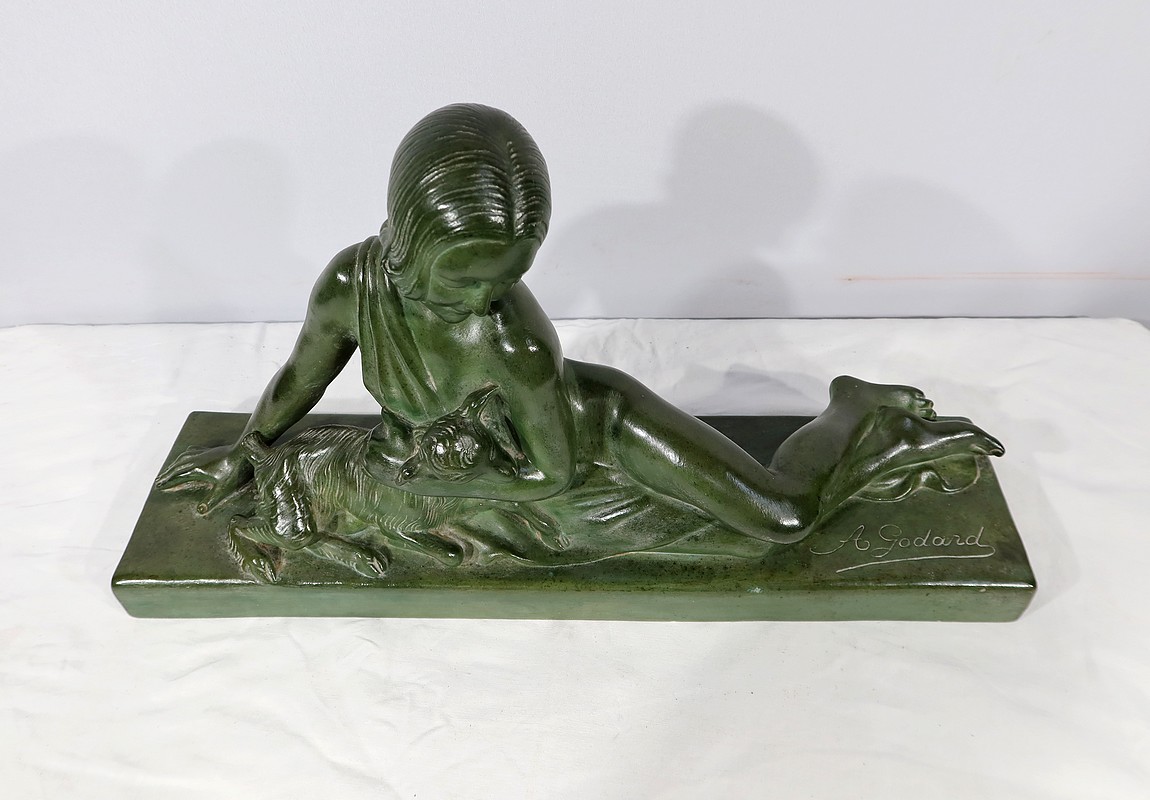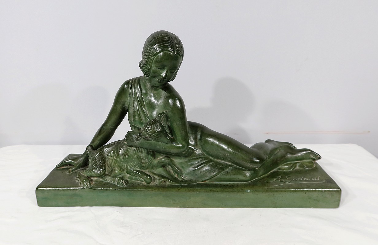 Sculpture «  La Demoiselle et le Chevreau », par A. Godard, Art Déco  – Début XXe