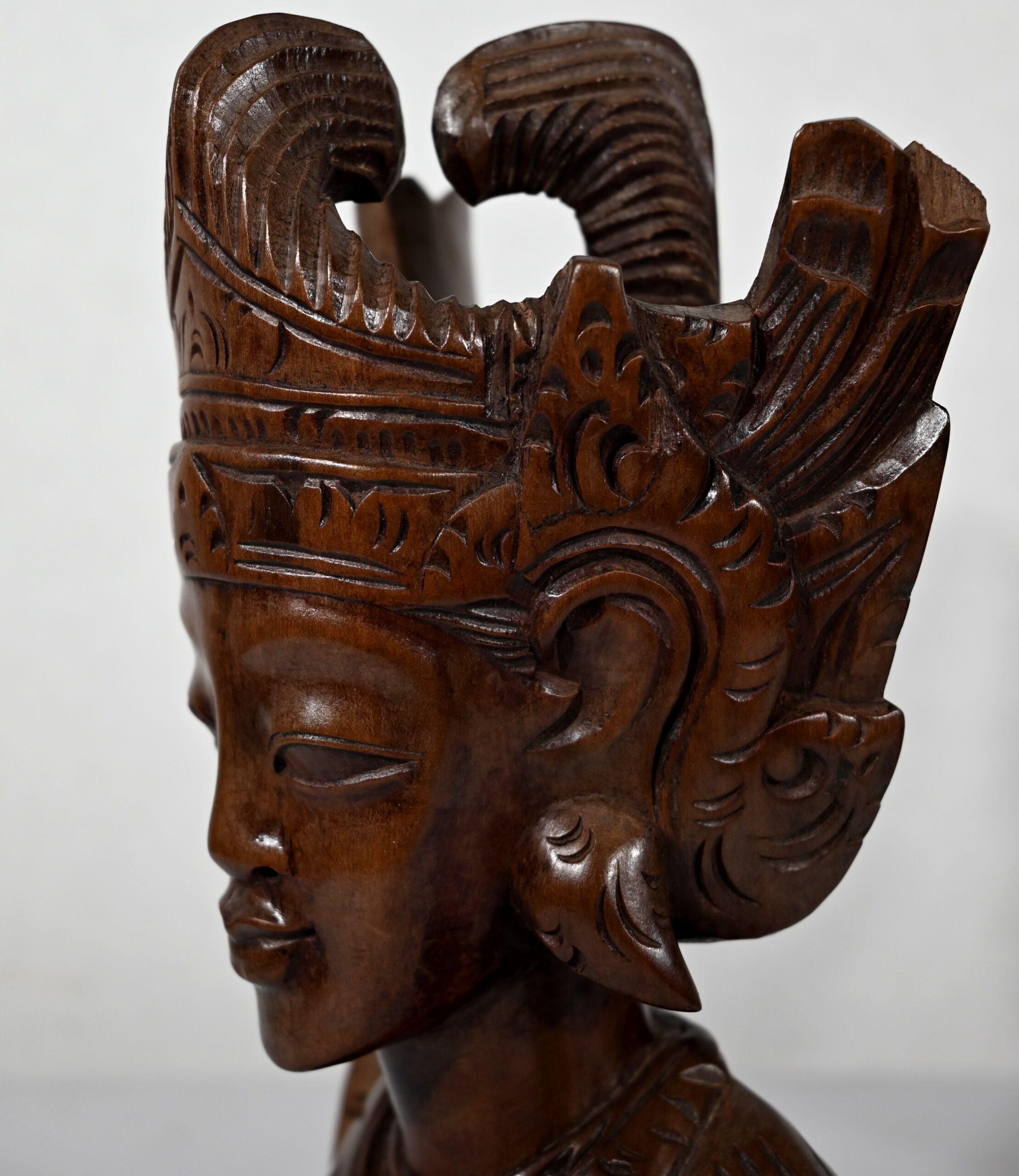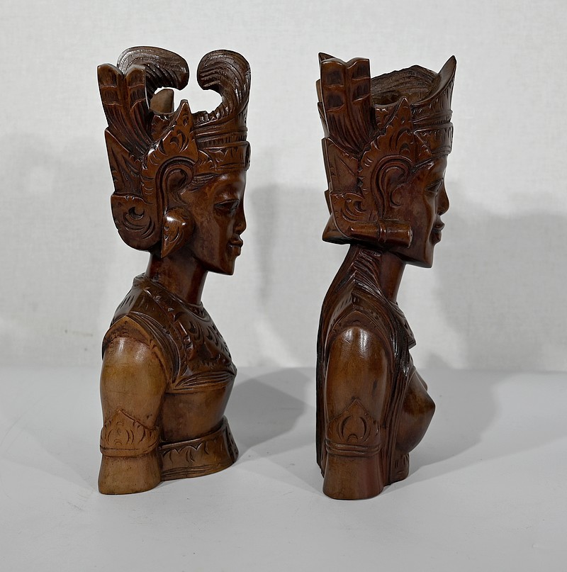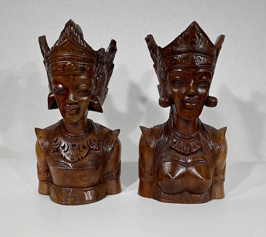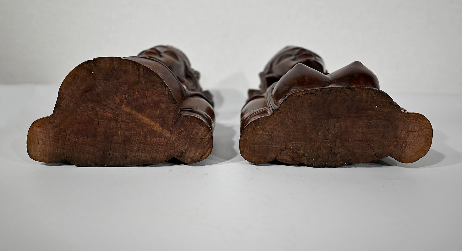 Paire de sculptures balinaises représentant deux danseuses de Legong, qui selon la tradition représente le ballet céleste des nymphes divines.