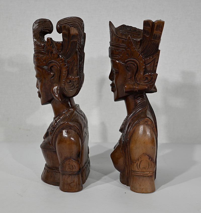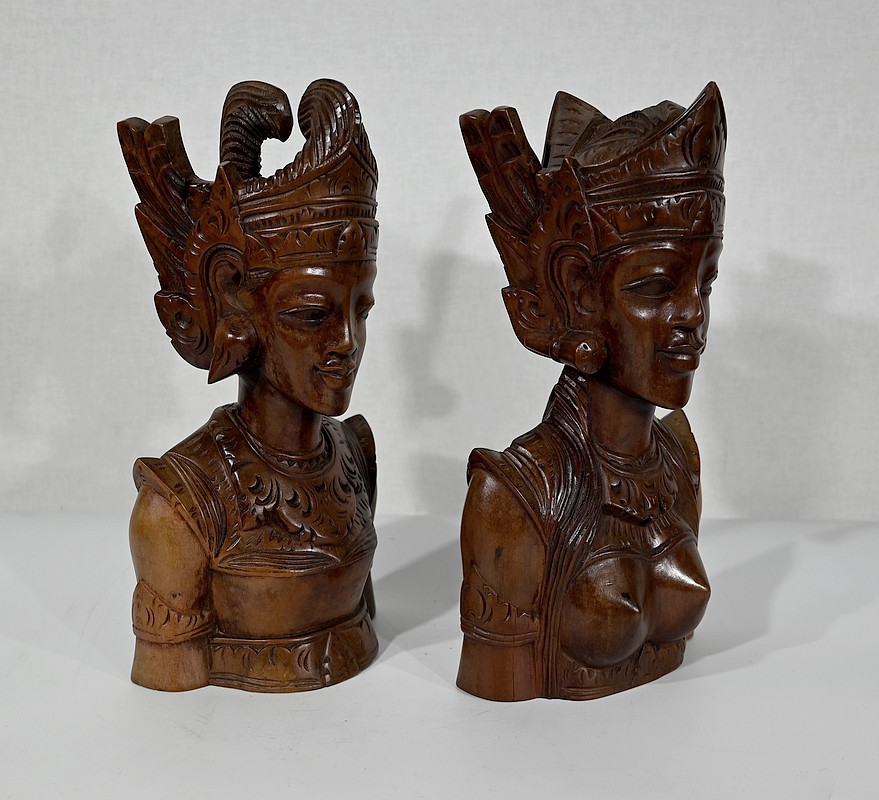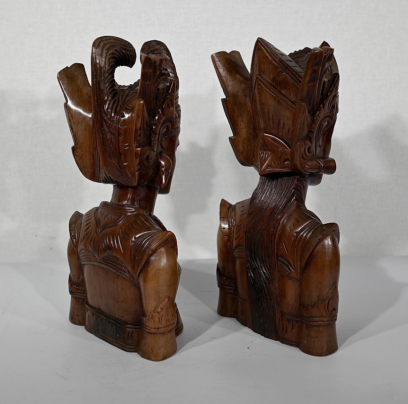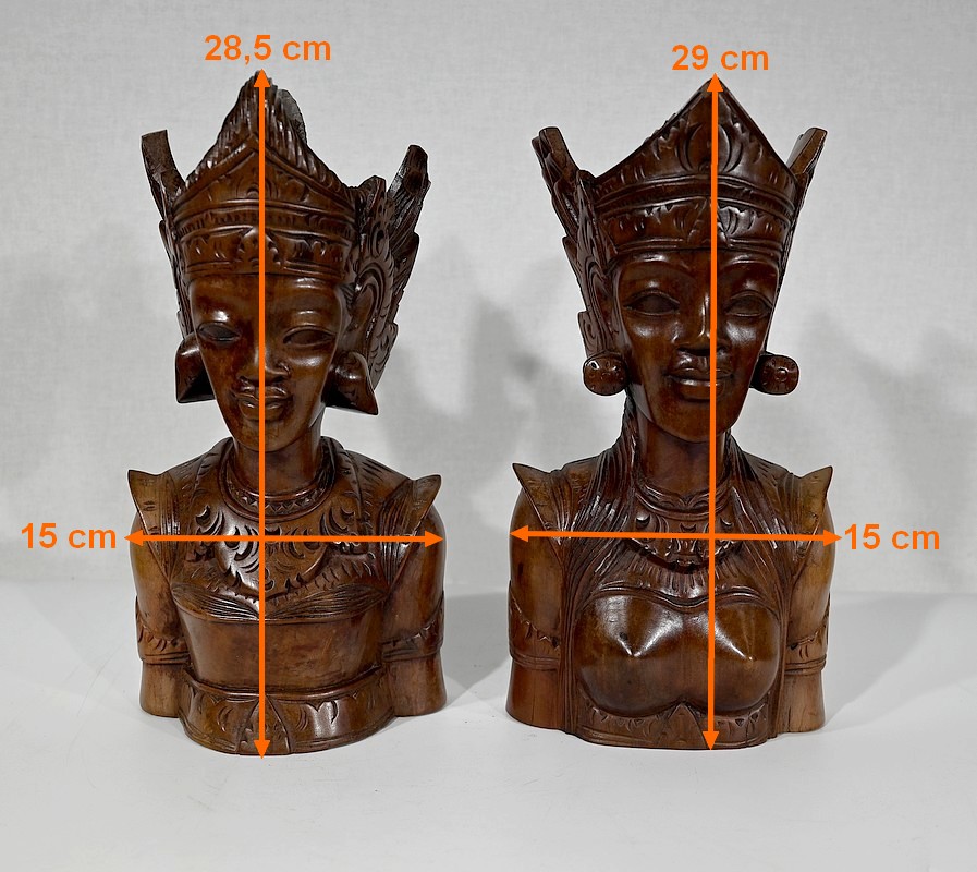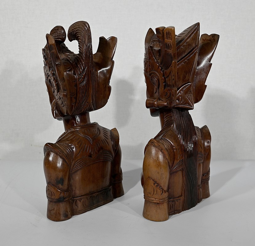 Paire de sculptures balinaises représentant deux danseuses de Legong, qui selon la tradition représente le ballet céleste des nymphes divines.