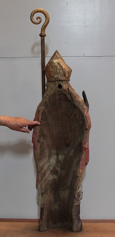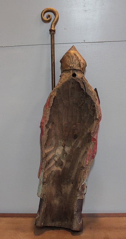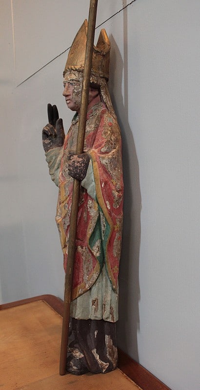 Statue de Saint-Nicolas en chêne polychrome. Il est coiffé de la mitre et tient la crosse dans la main gauche.