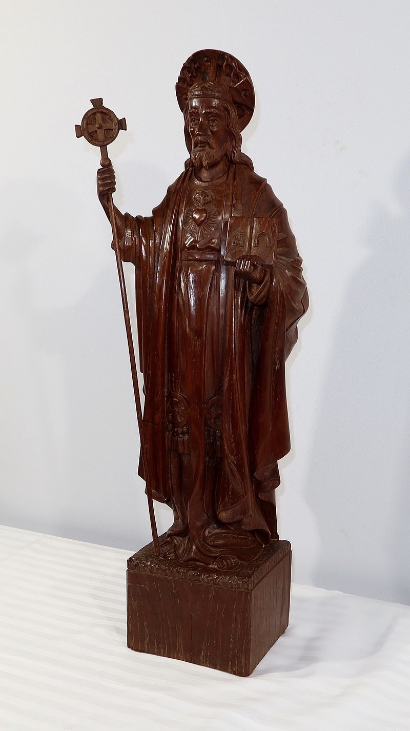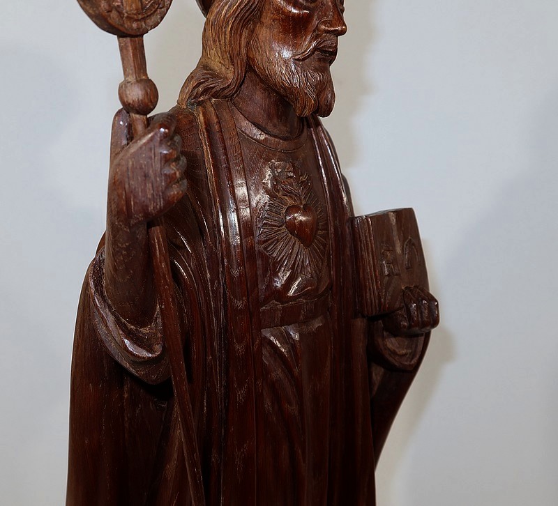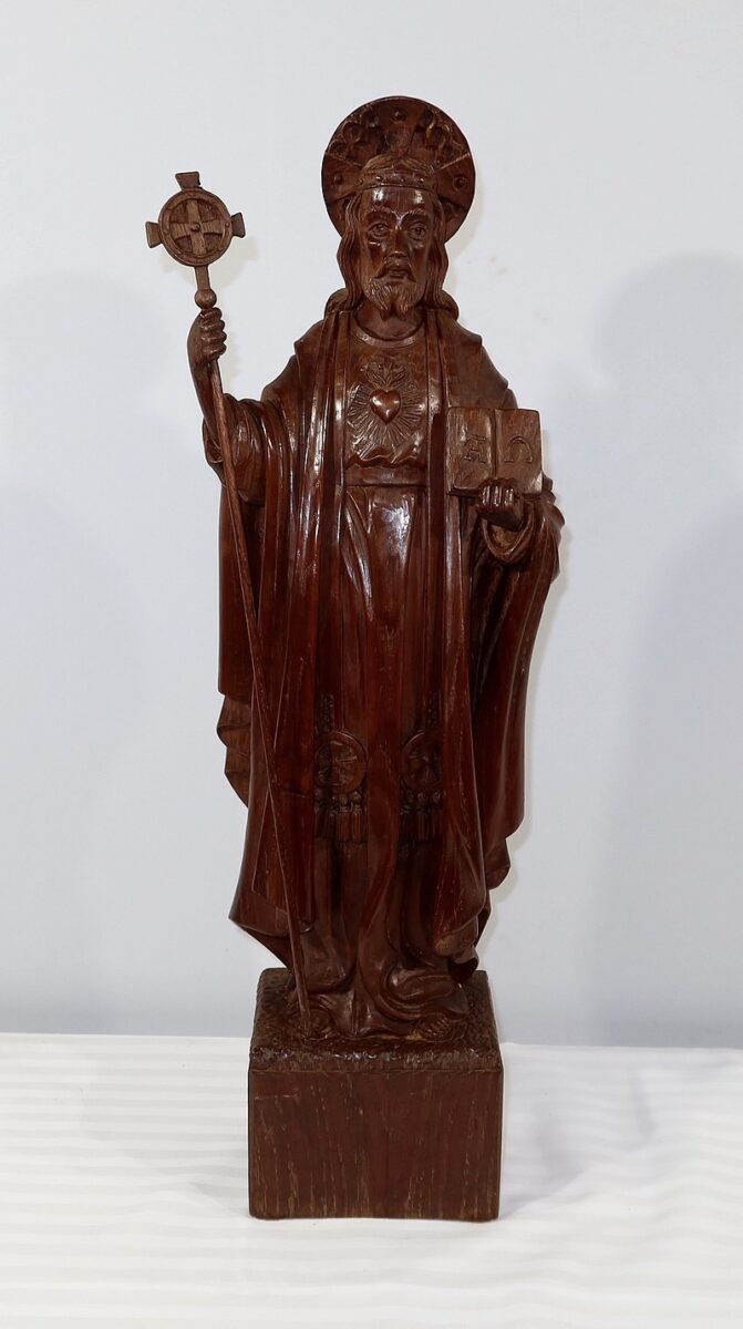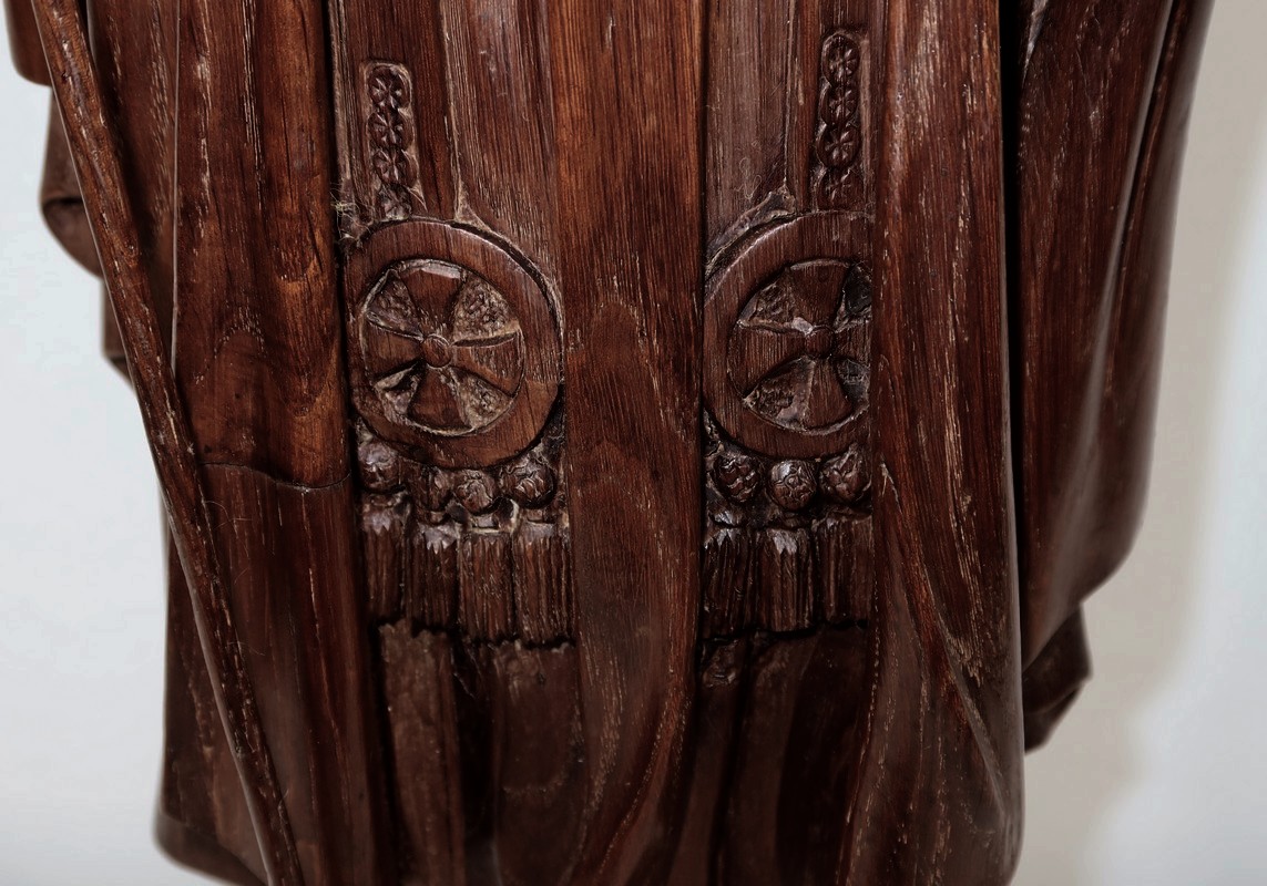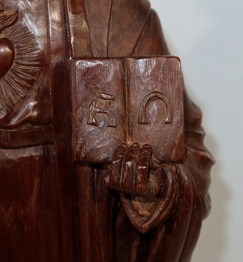Sur sa poitrine est sculpté un cœur enflammé, le Sacré-cœur représentant la lumière divine et le sang du Christ.