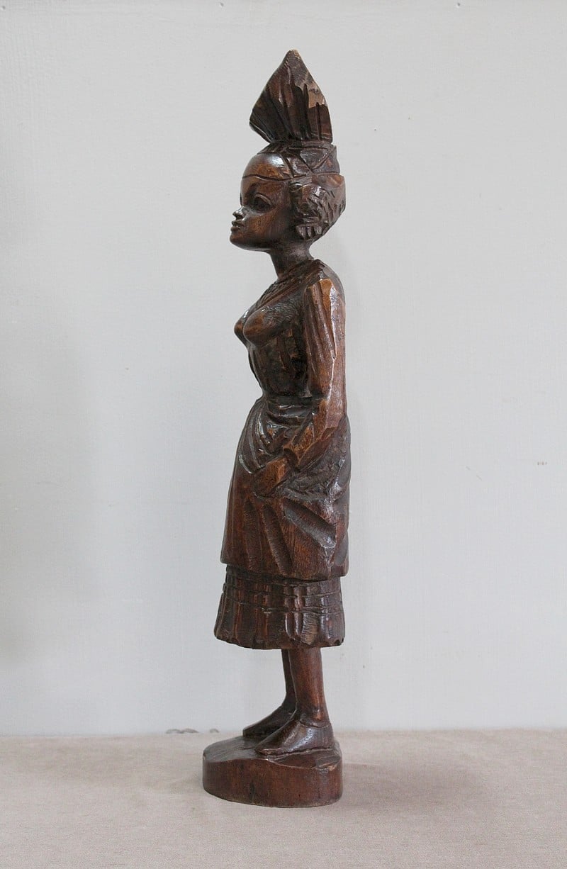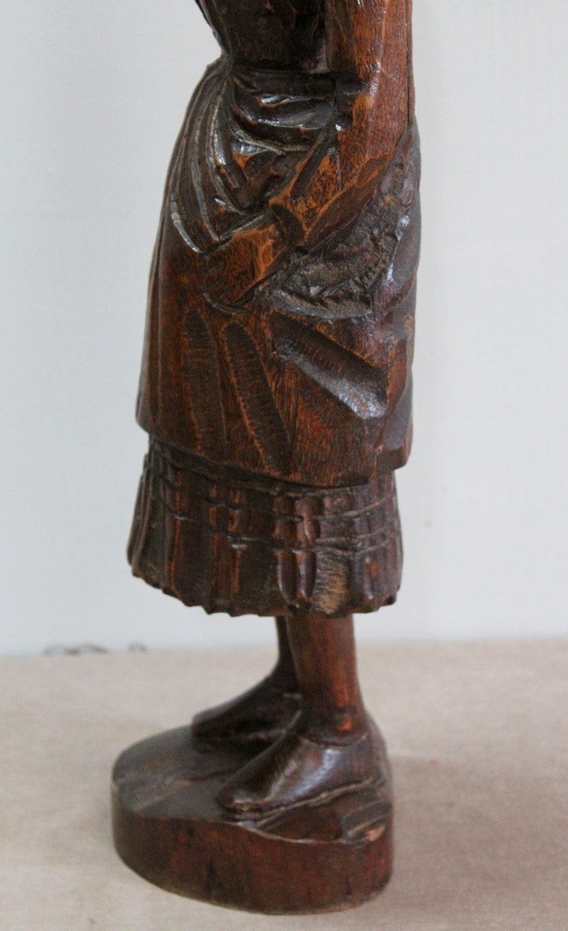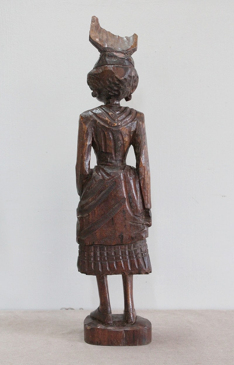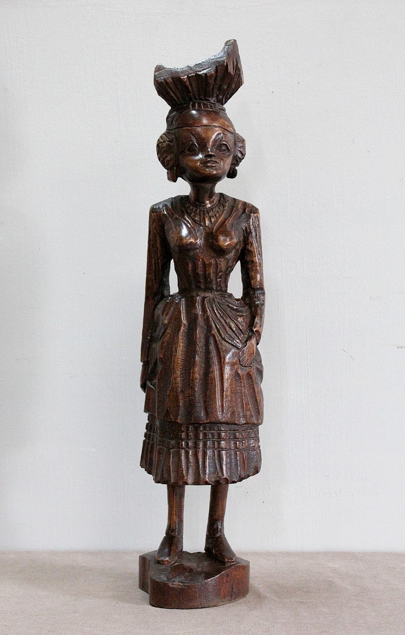 Elle est représentée debout, ornée d’une coiffe haute et d’un collier, elle est habillée d’une tenue à corset et jupons.