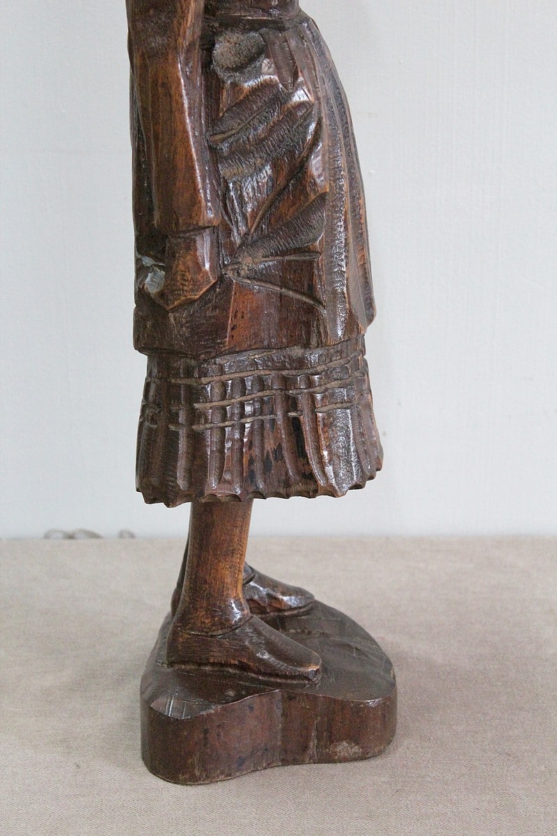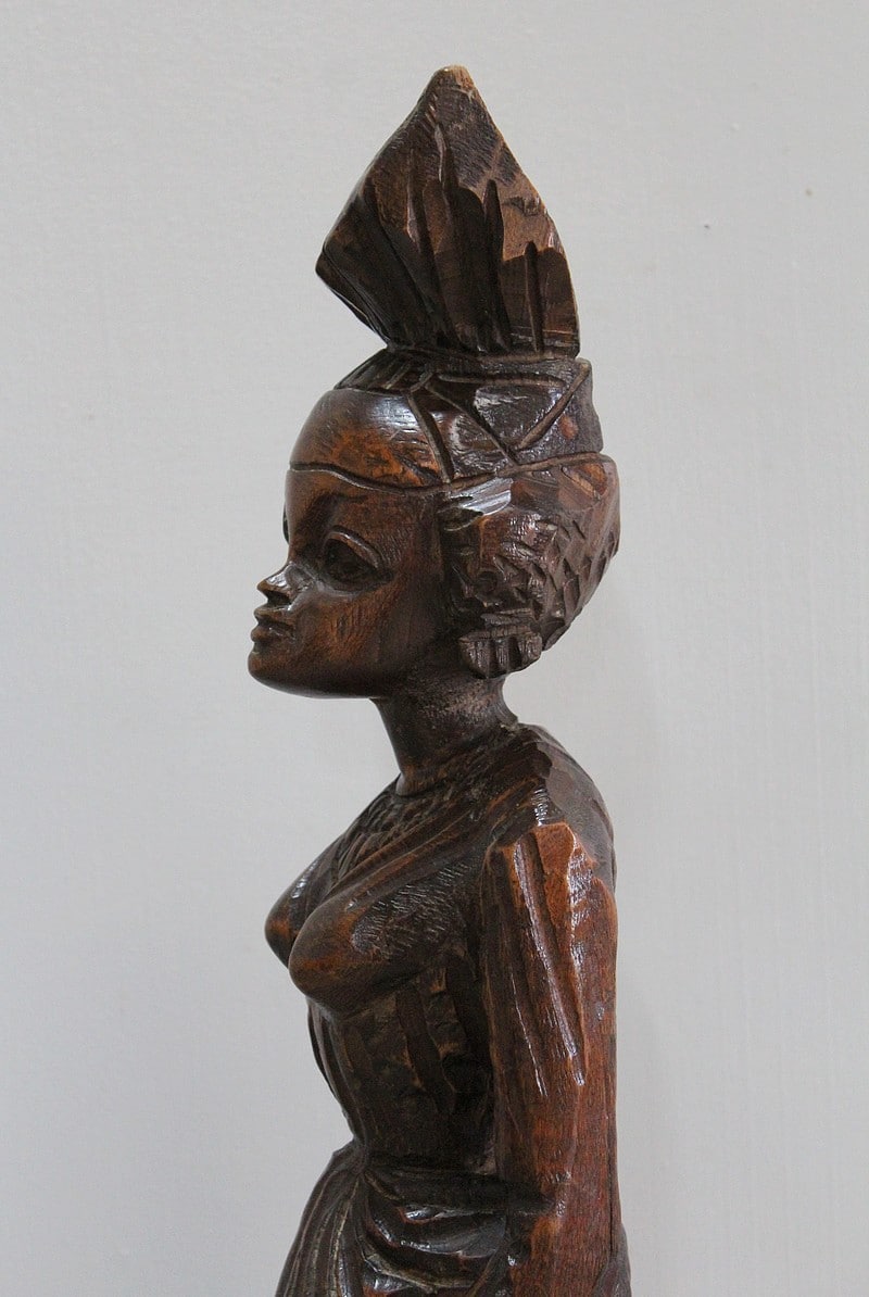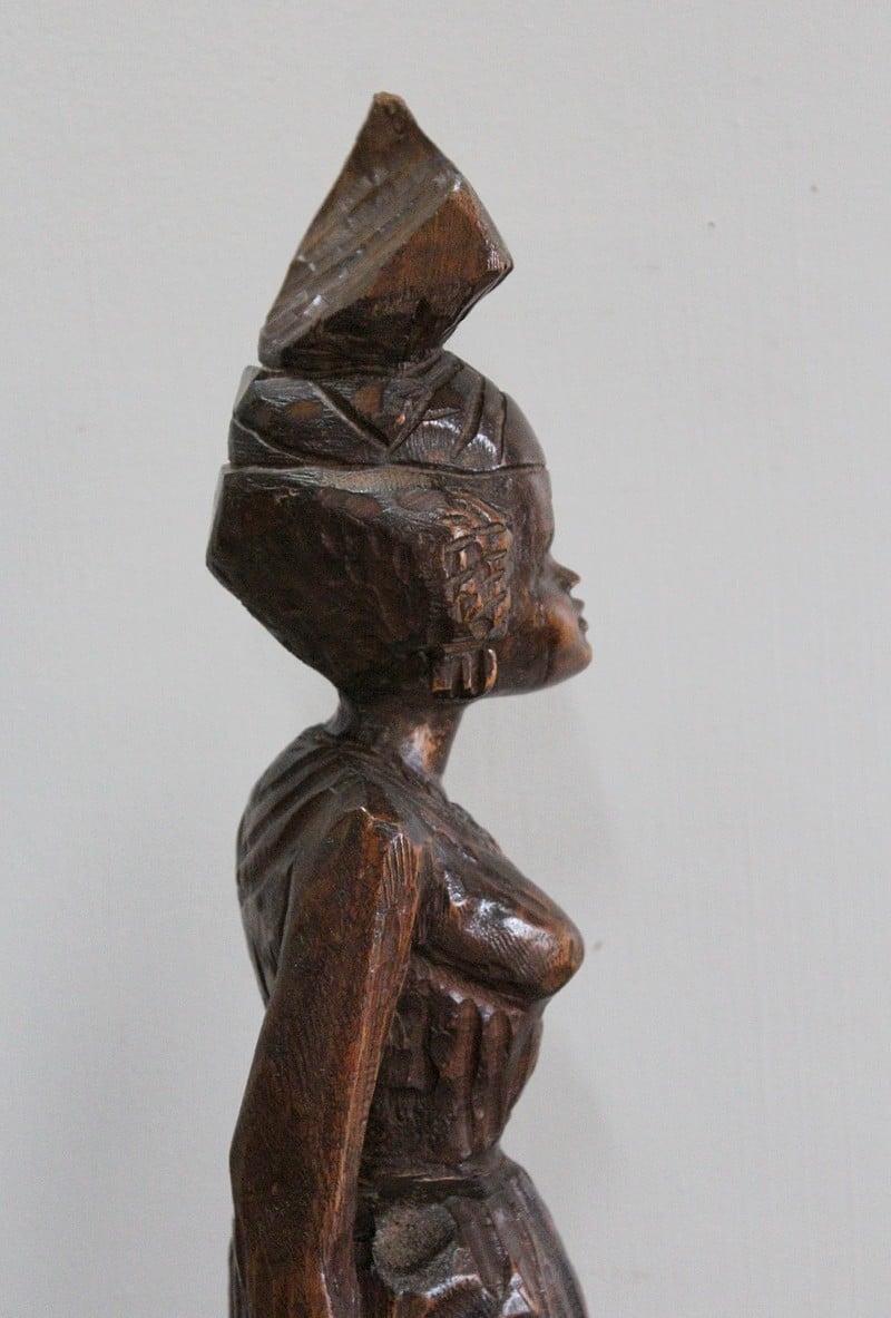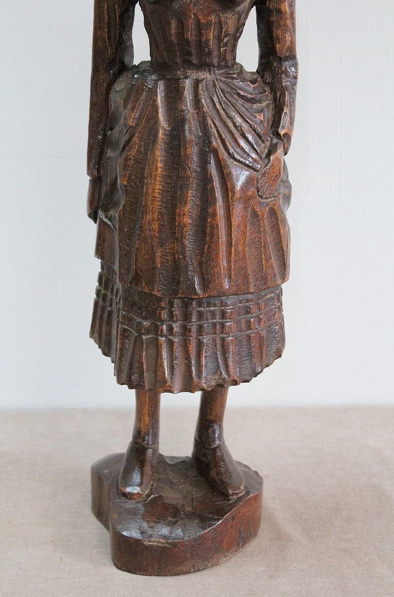 Elle est représentée debout, ornée d’une coiffe haute et d’un collier, elle est habillée d’une tenue à corset et jupons.