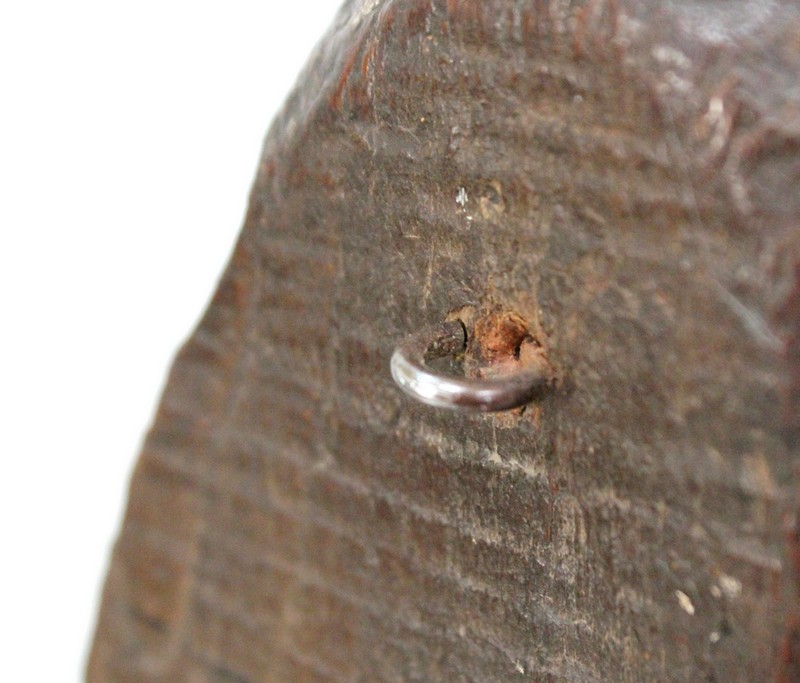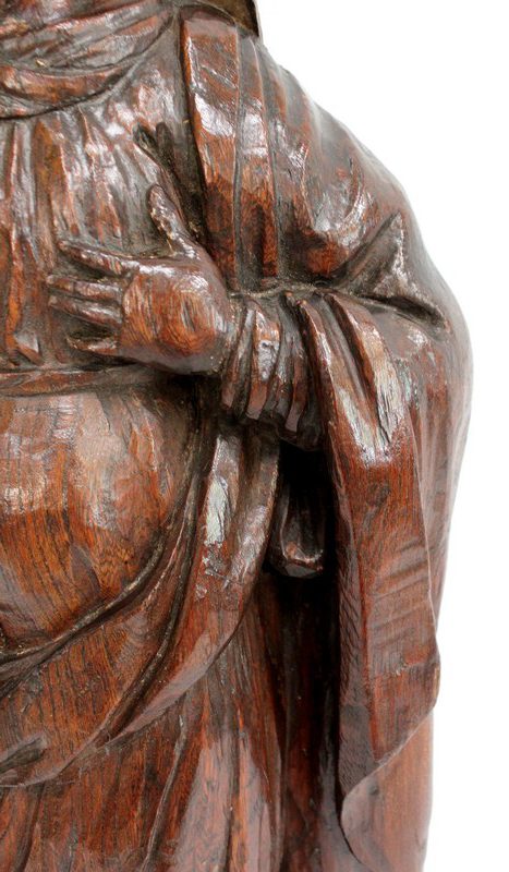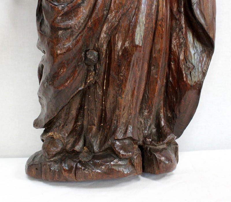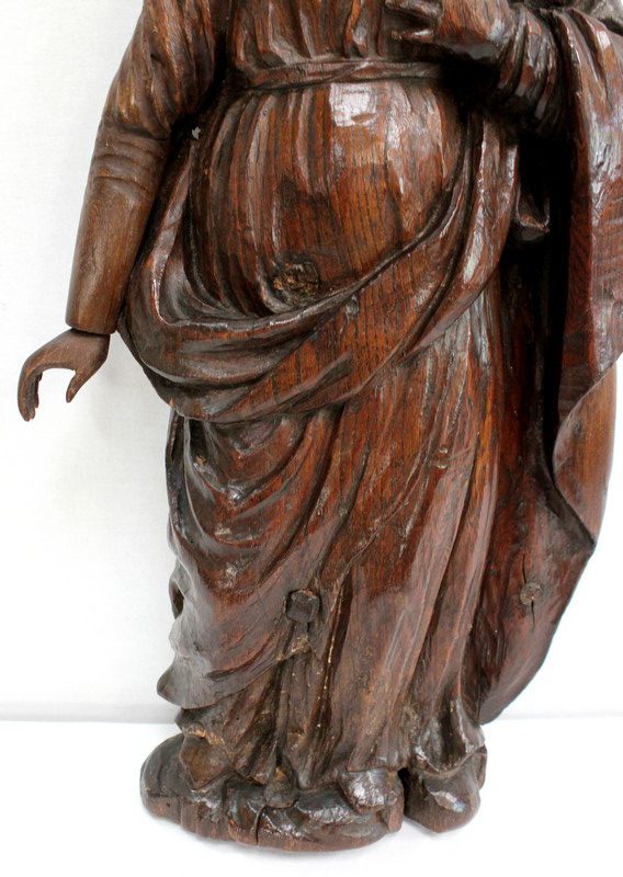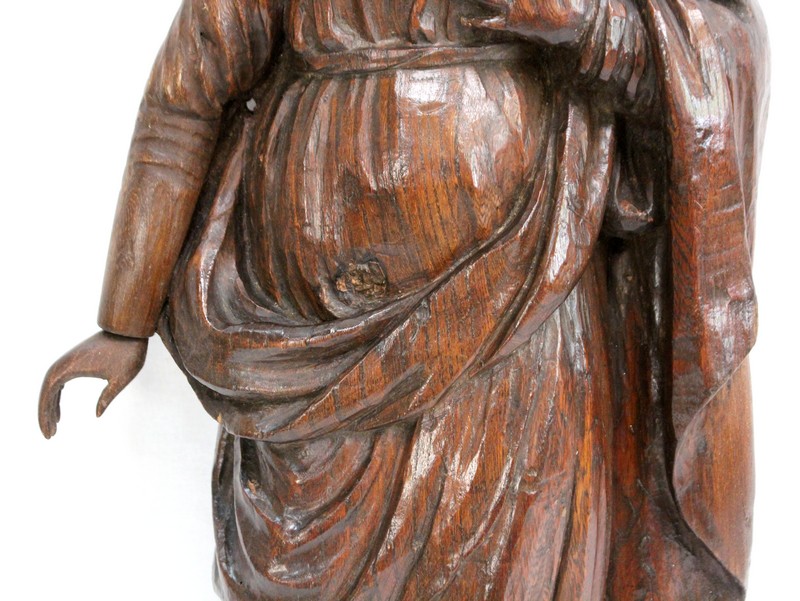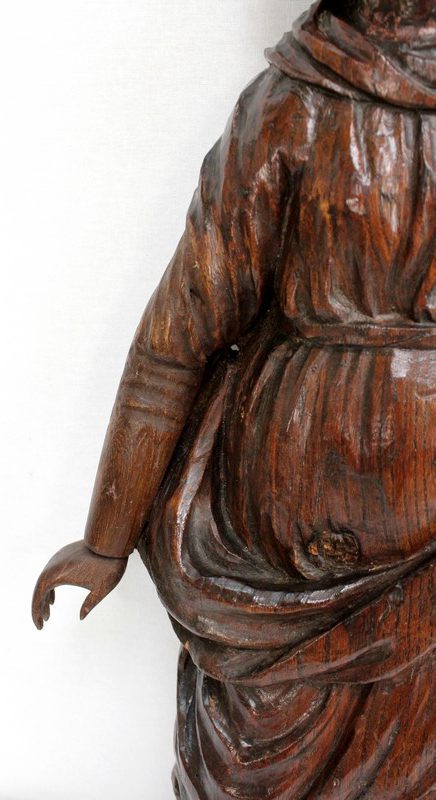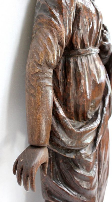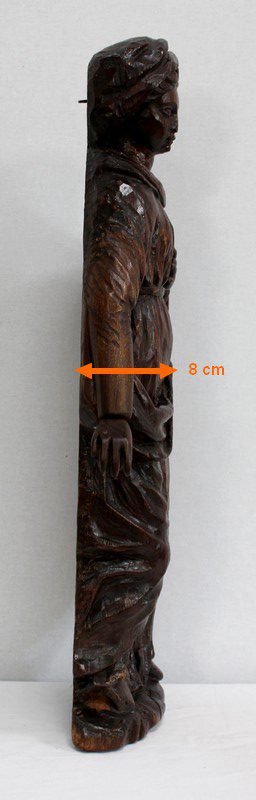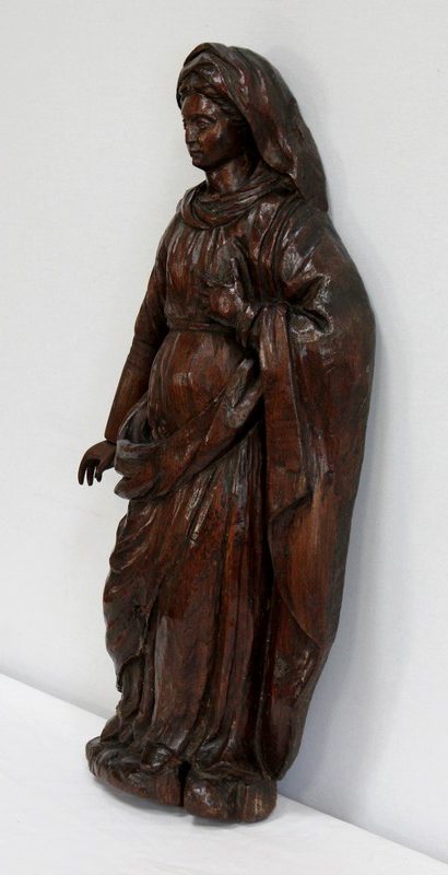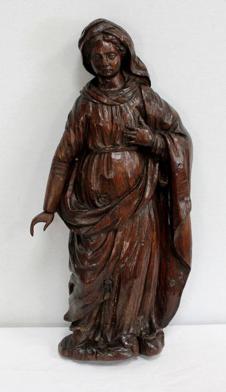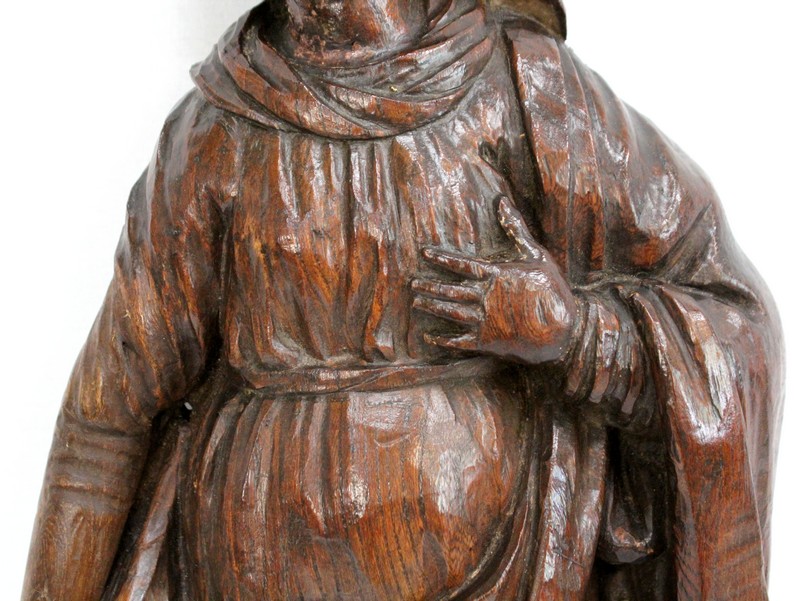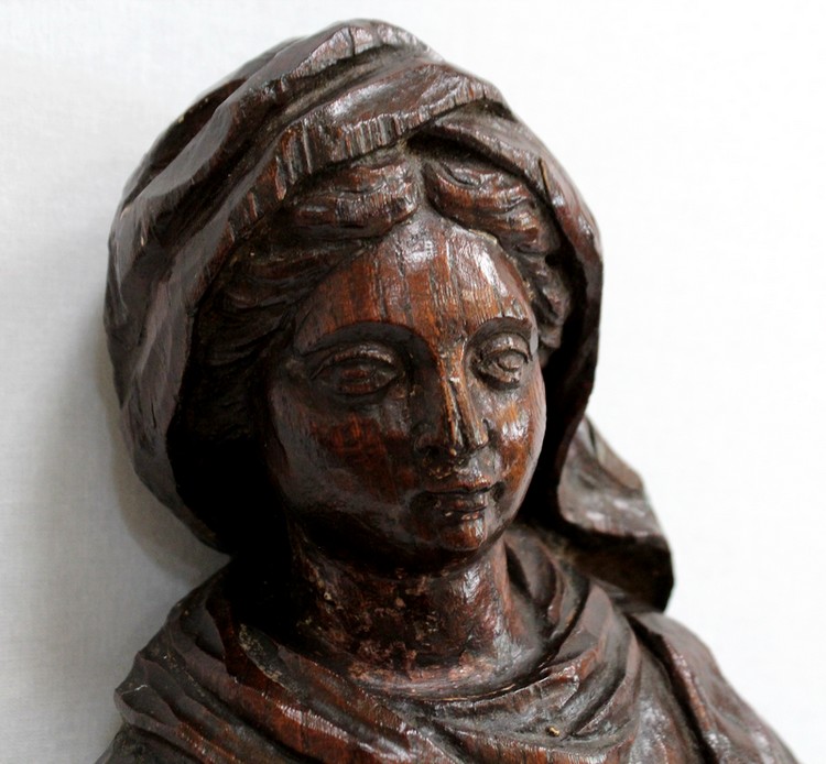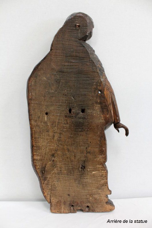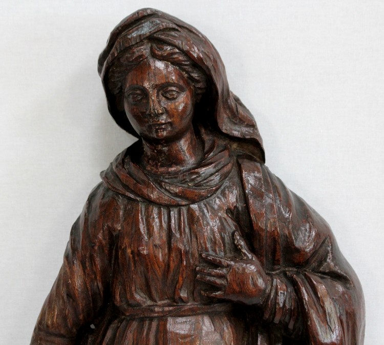 Ce sujet religieux, la main gauche posée sur le cœur, inspire la piété. Son regard doux et ses traits mélancoliques semblent nous dévisager à travers le temps. Sa coiffe et son drapé, sculptés habilement, offrent une impression de mouvement à l’ensemble. On notera la présence d’un anneau sur la partie arrière, facilitant sa fixation.