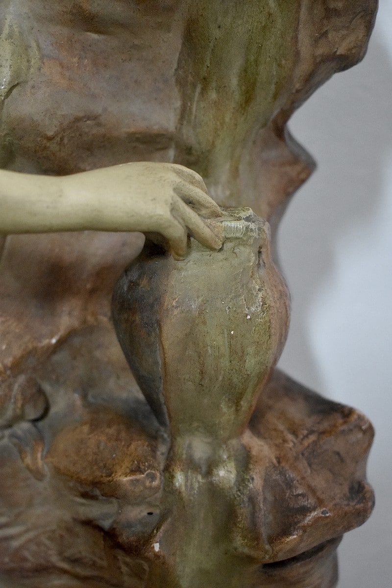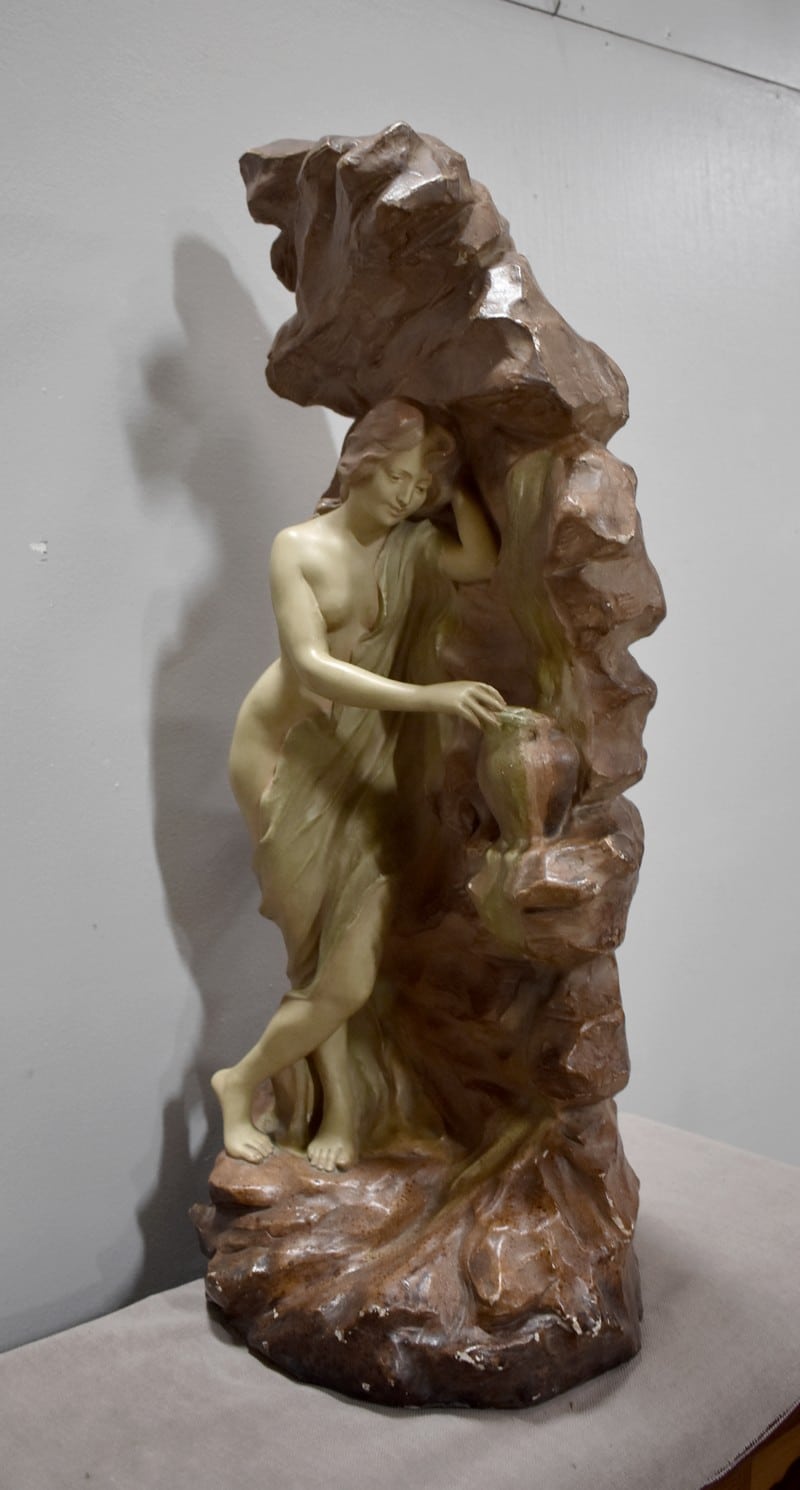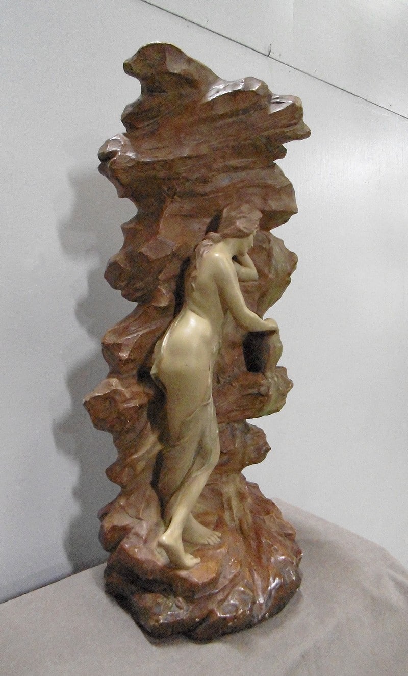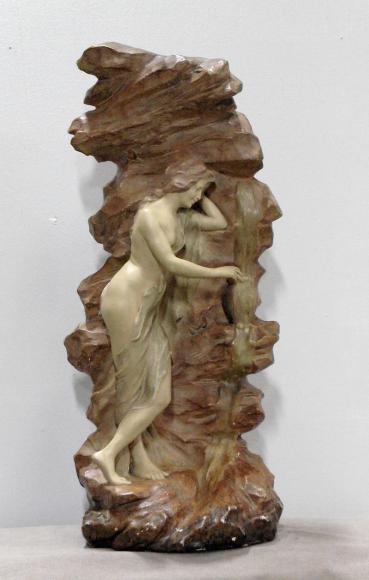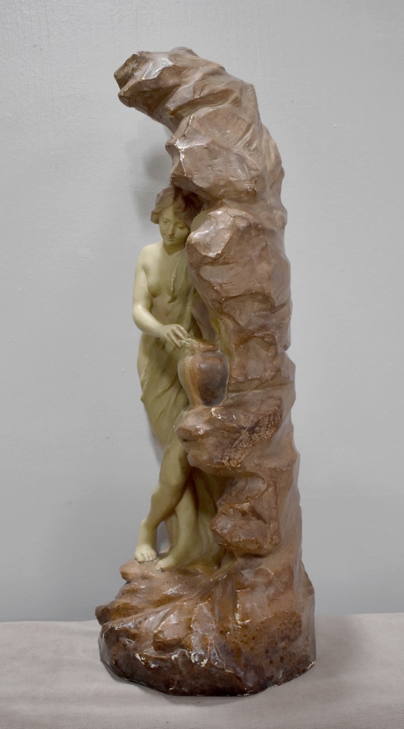Statue en plâtre patiné ‘La source’ représentant une femme à demi-nue, appuyée contre la roche et prenant de l’eau à une source.