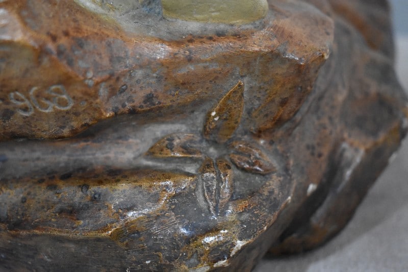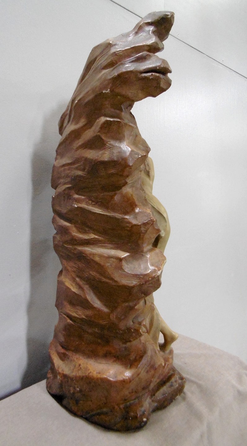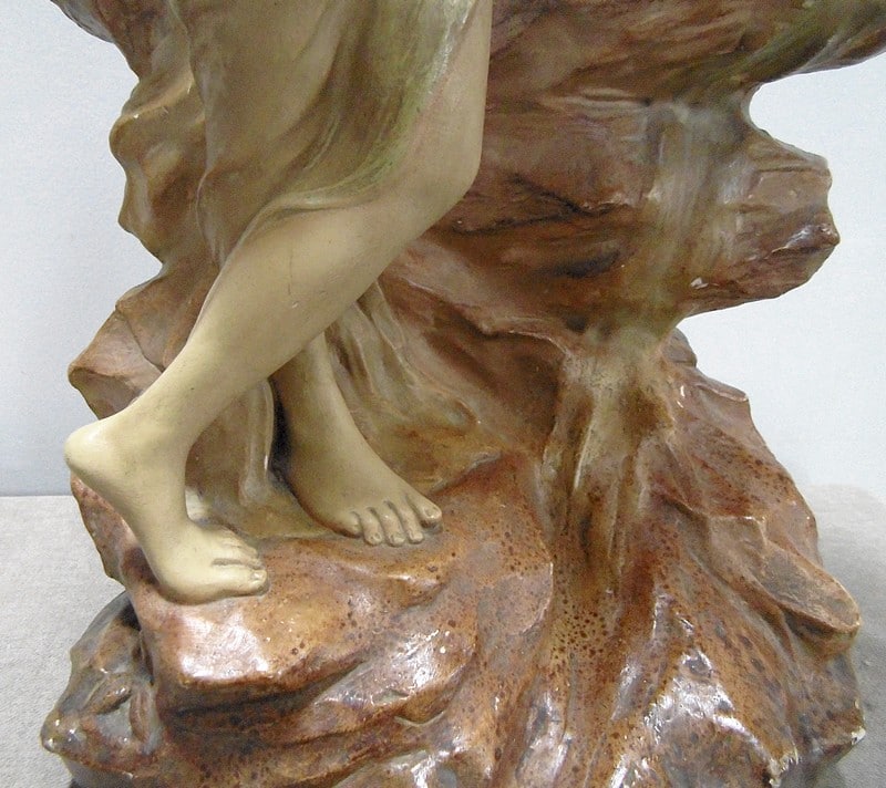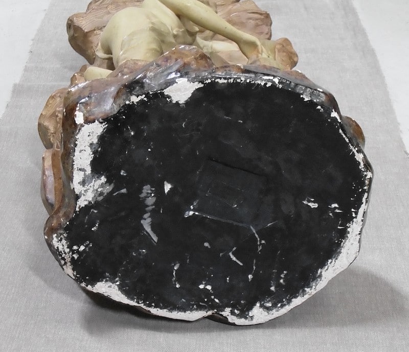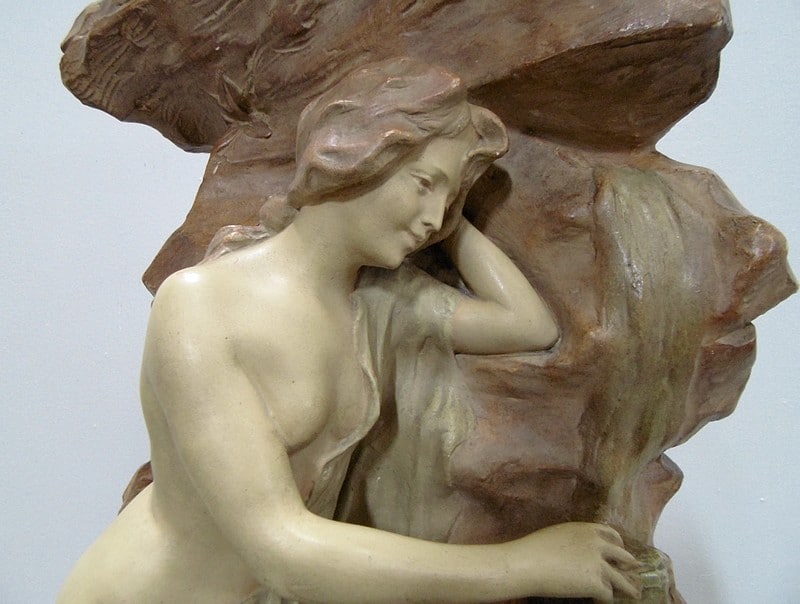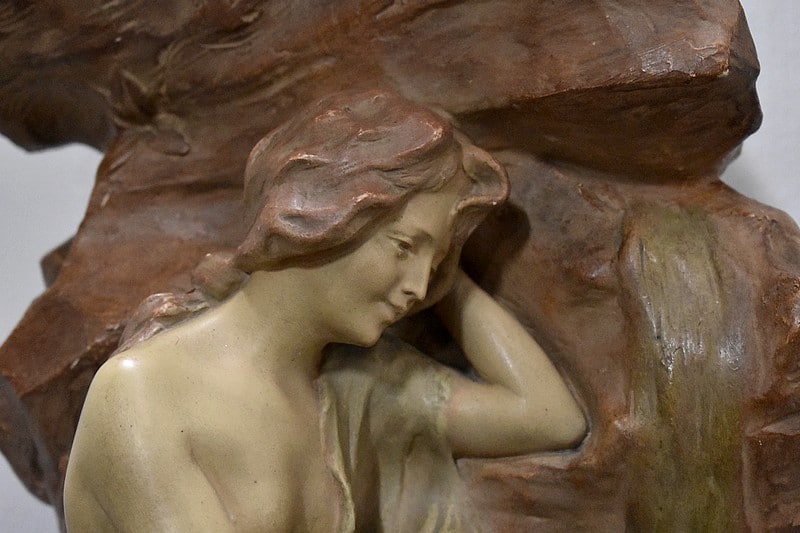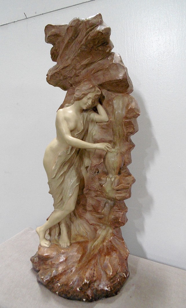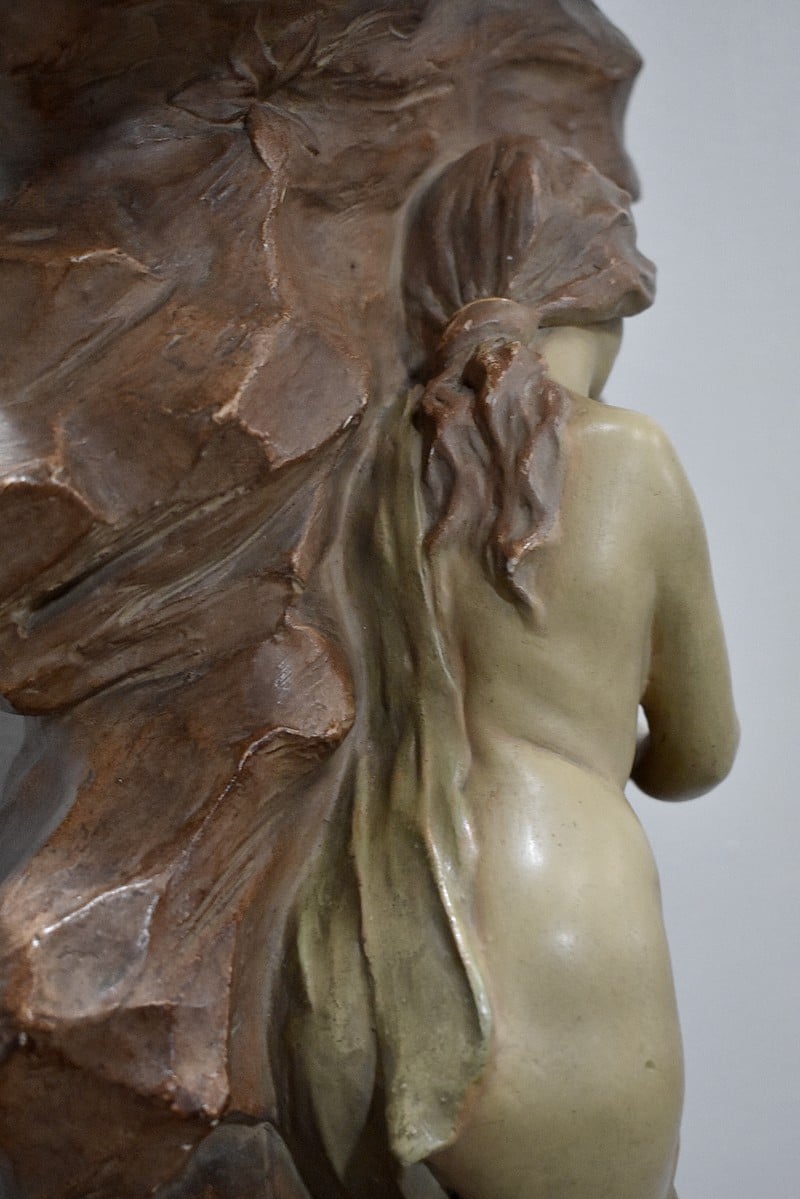 Statue en plâtre patiné ‘La source’ représentant une femme à demi-nue, appuyée contre la roche et prenant de l’eau à une source.