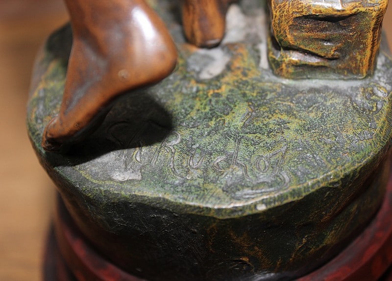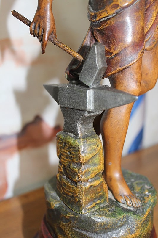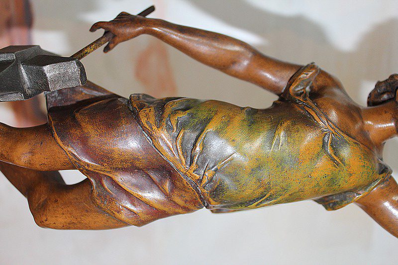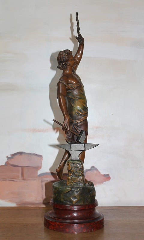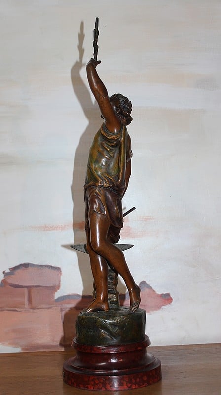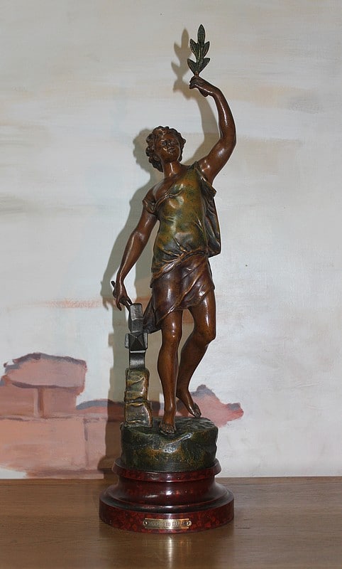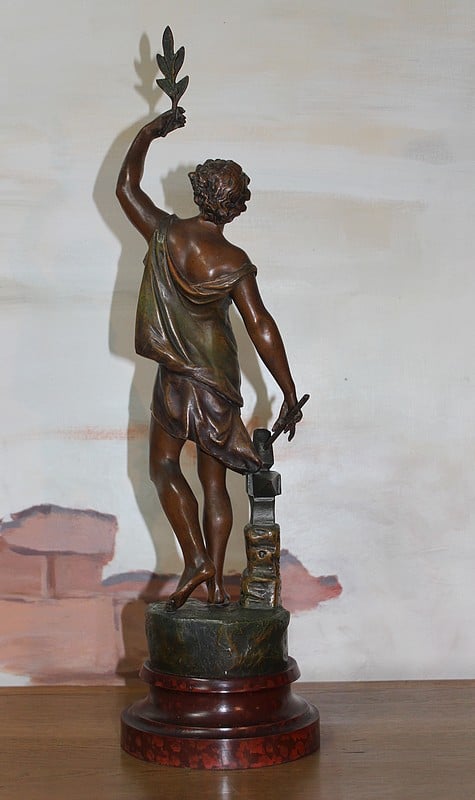 Statue en régule à patine brune sur socle en bois peint façon marbre , elle est intitulée ‘Hommage au Travail’ et est signée Ch. RUCHOT.